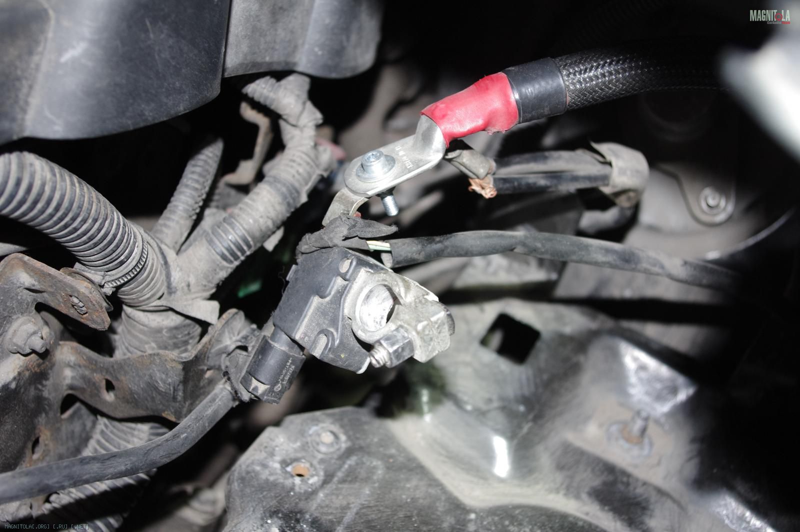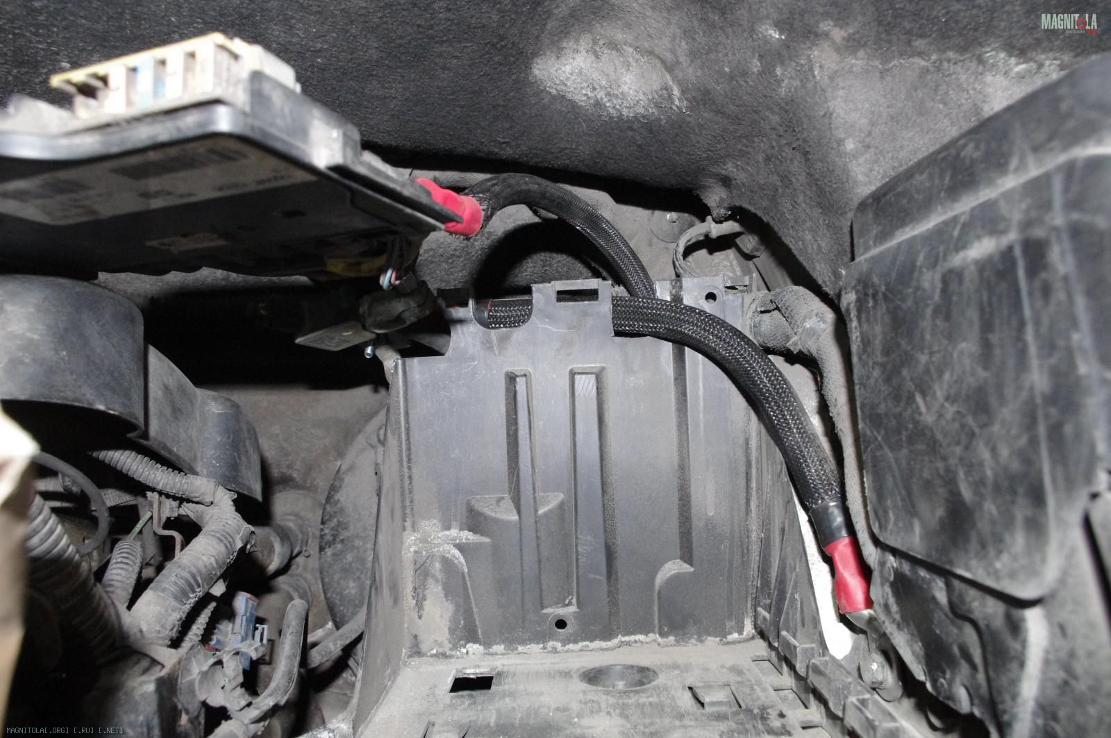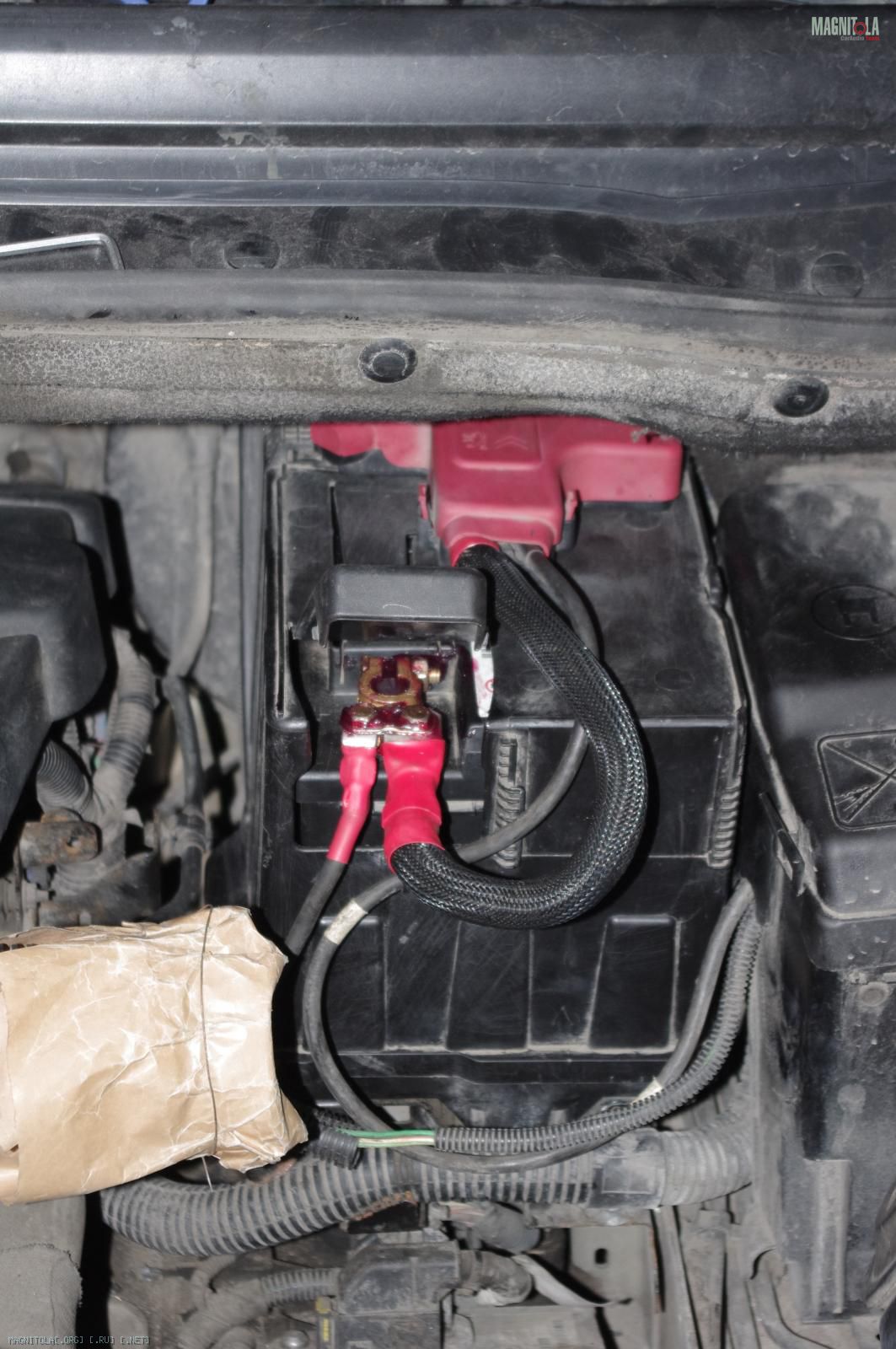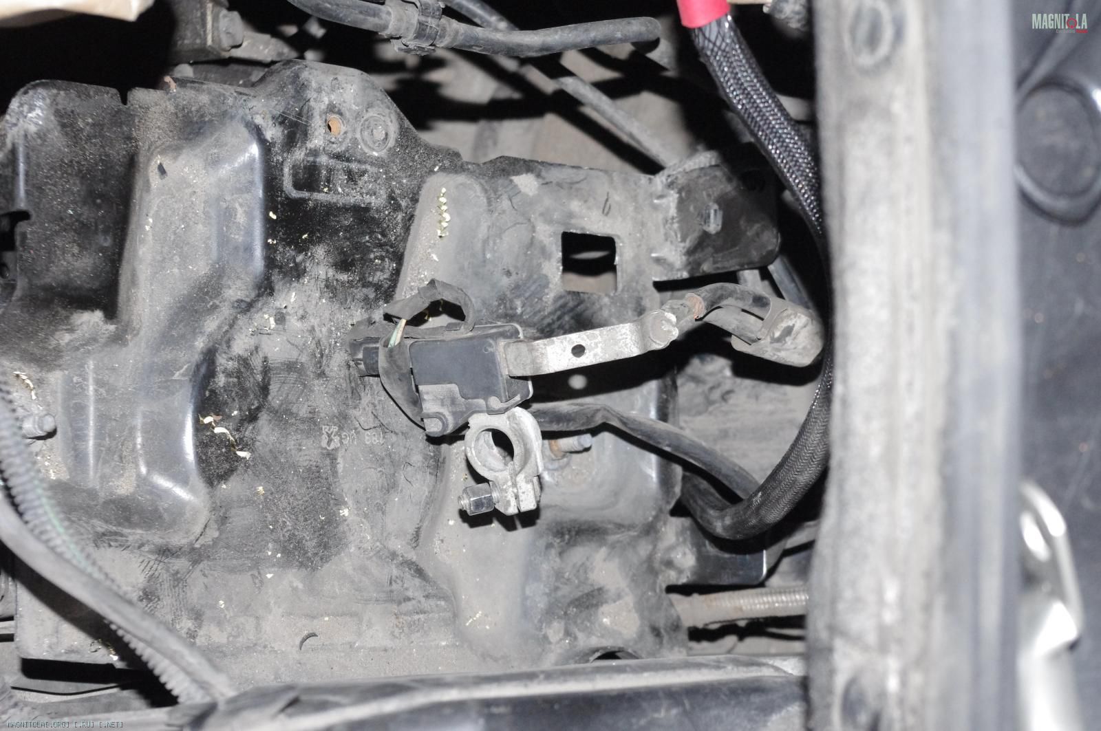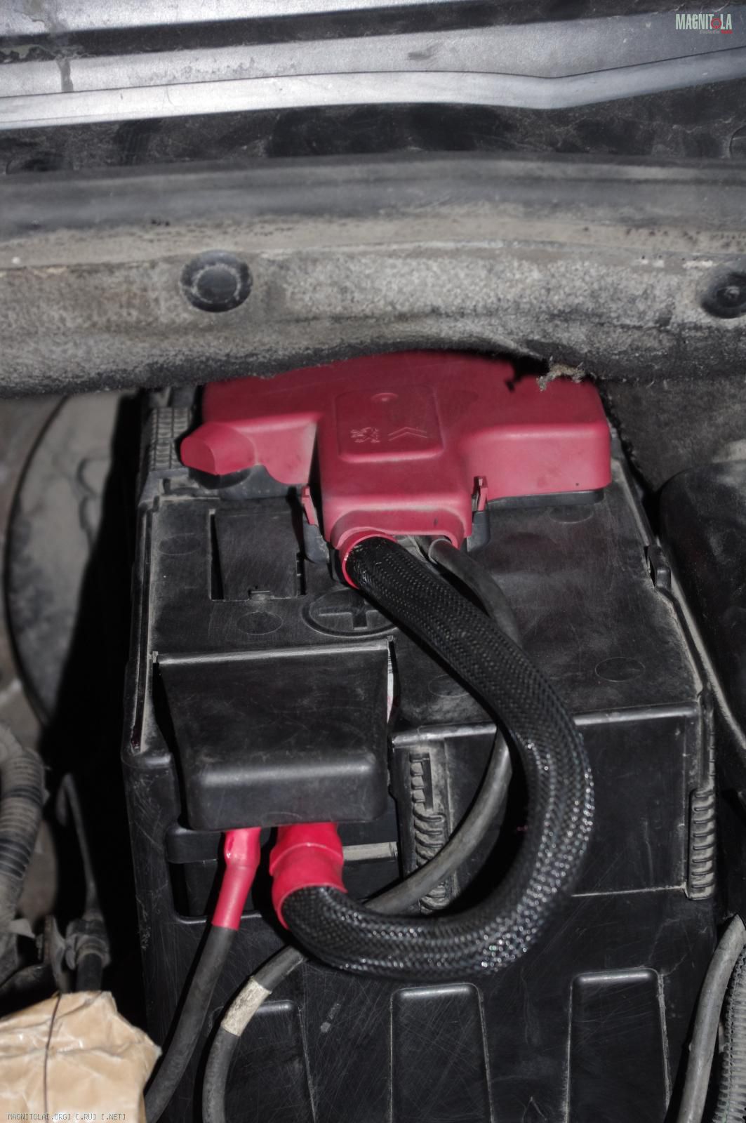 и расстраиваемся:( Ибо при таком расположении дополнительного кабеля массыне защёлкивается крашка аккумуляторного отсека, на которую крепится штатный распределитель питания. Время было уже далеко заполночь, поэтому на этом работы под капотом мы закончили.