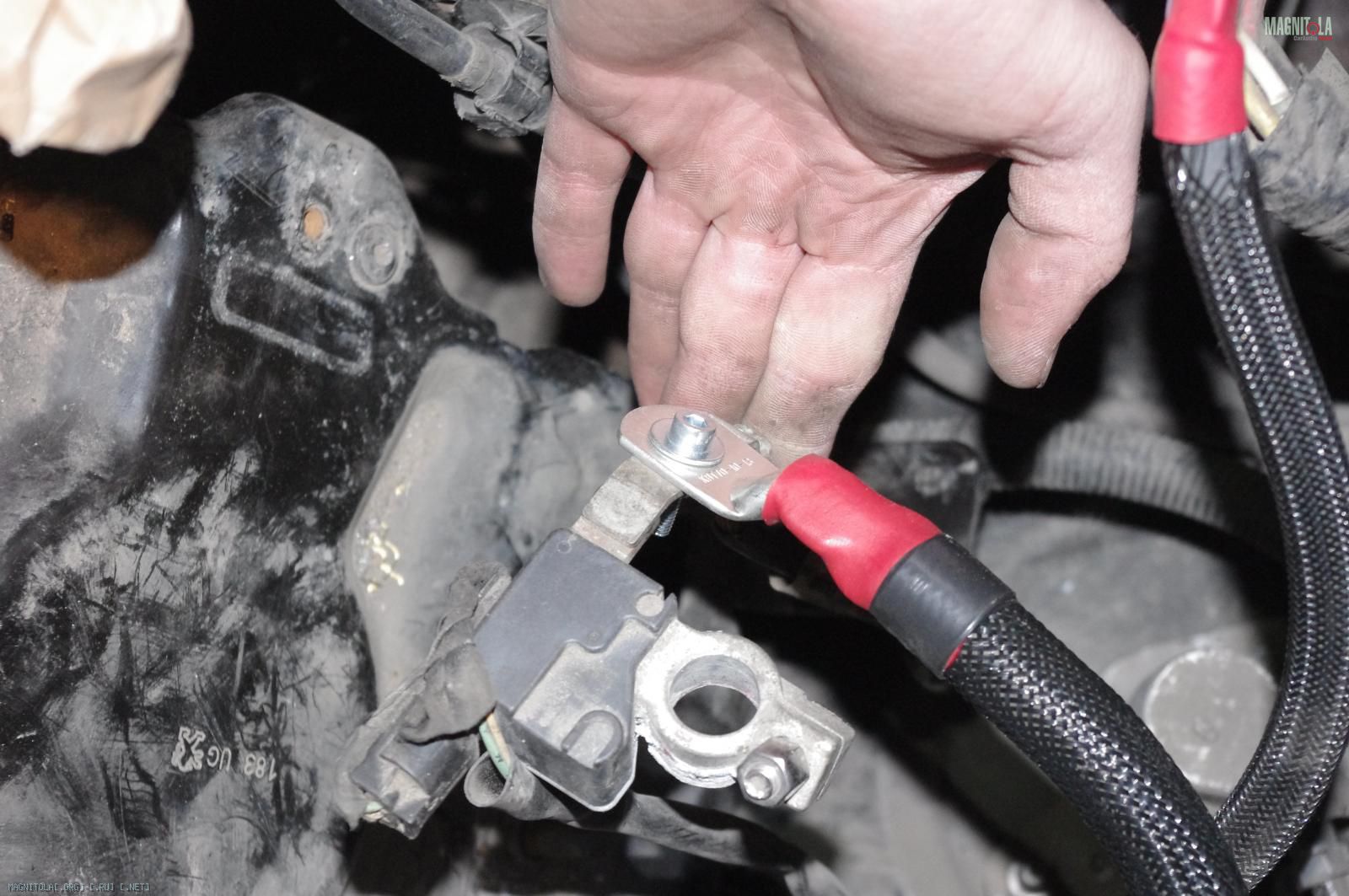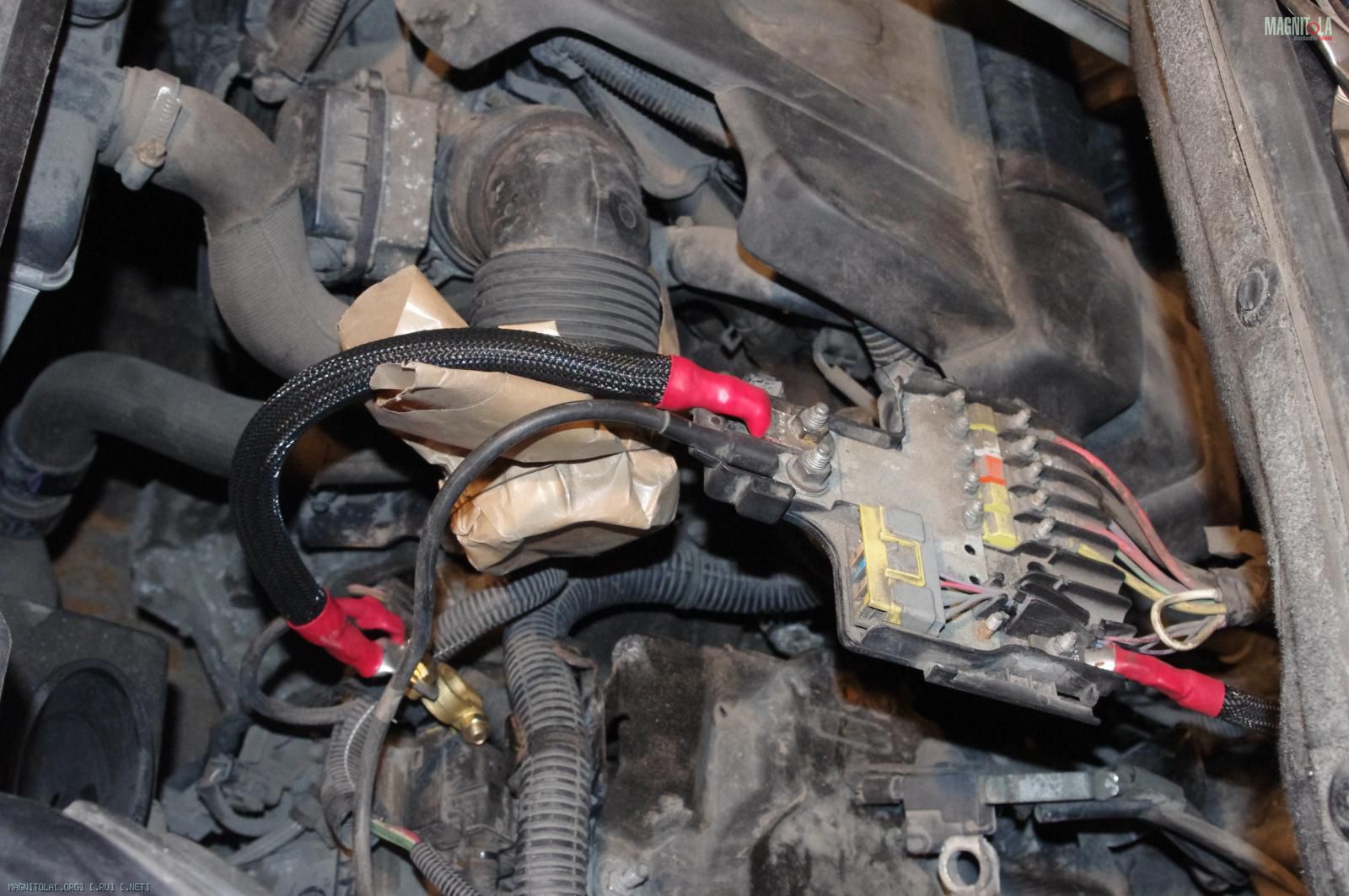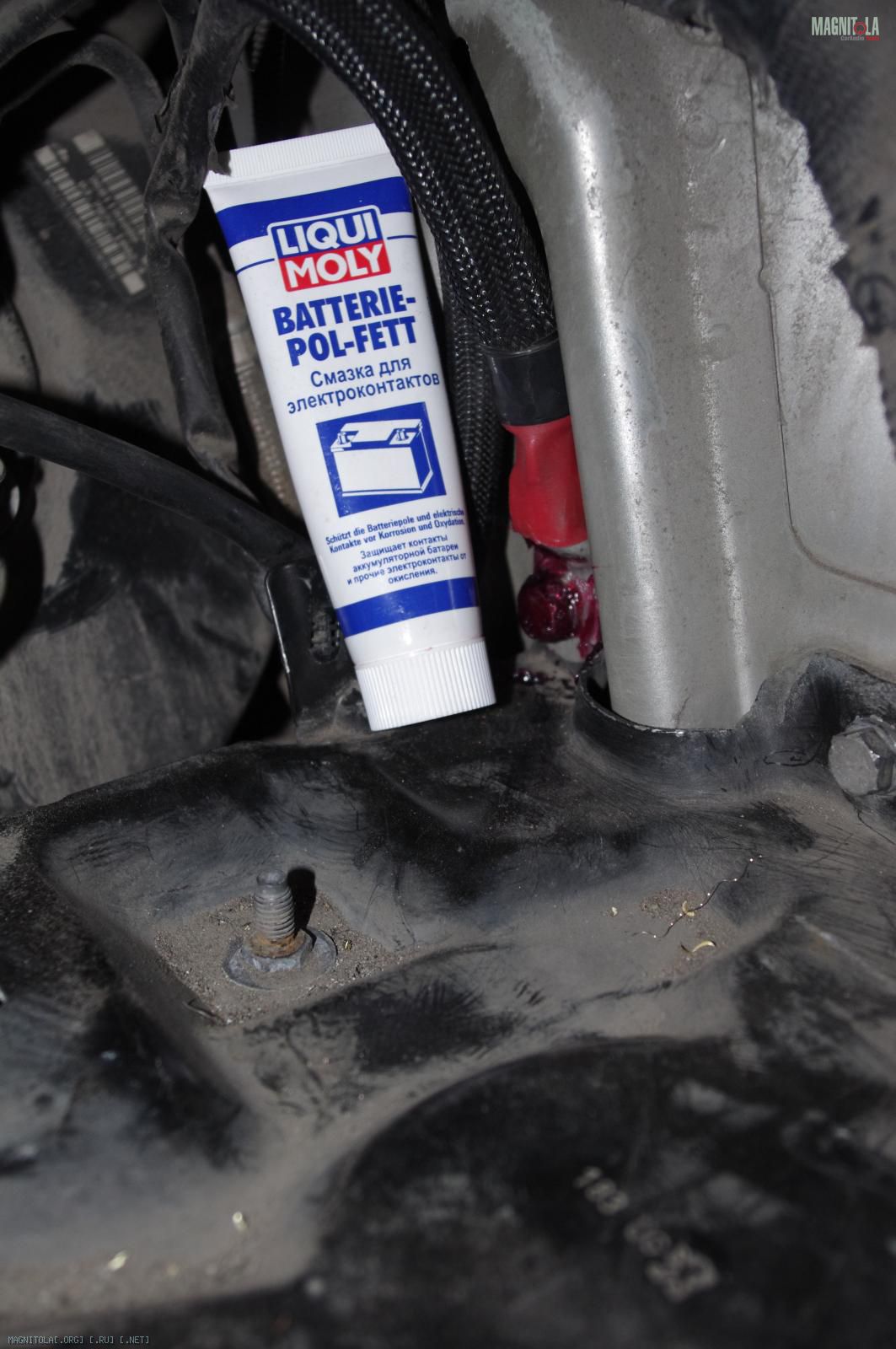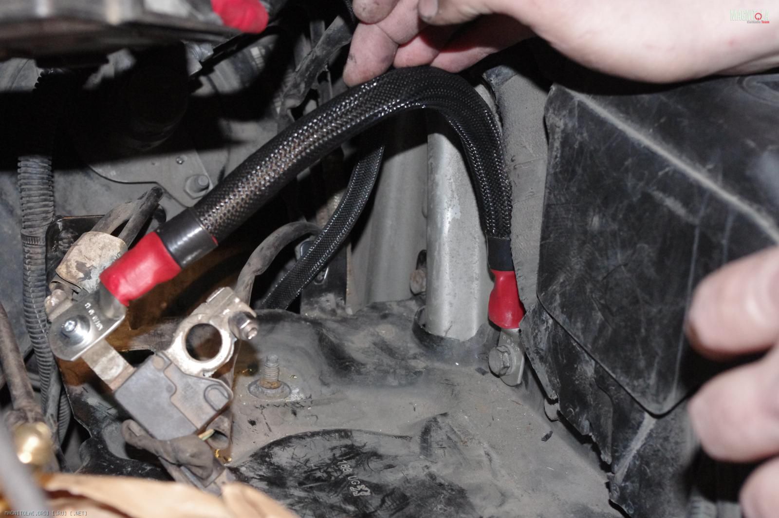 и расстраиваемся:( Ибо при таком расположении дополнительного кабеля массыне защёлкивается крашка аккумуляторного отсека, на которую крепится штатный распределитель питания. Время было уже далеко заполночь, поэтому на этом работы под капотом мы закончили.