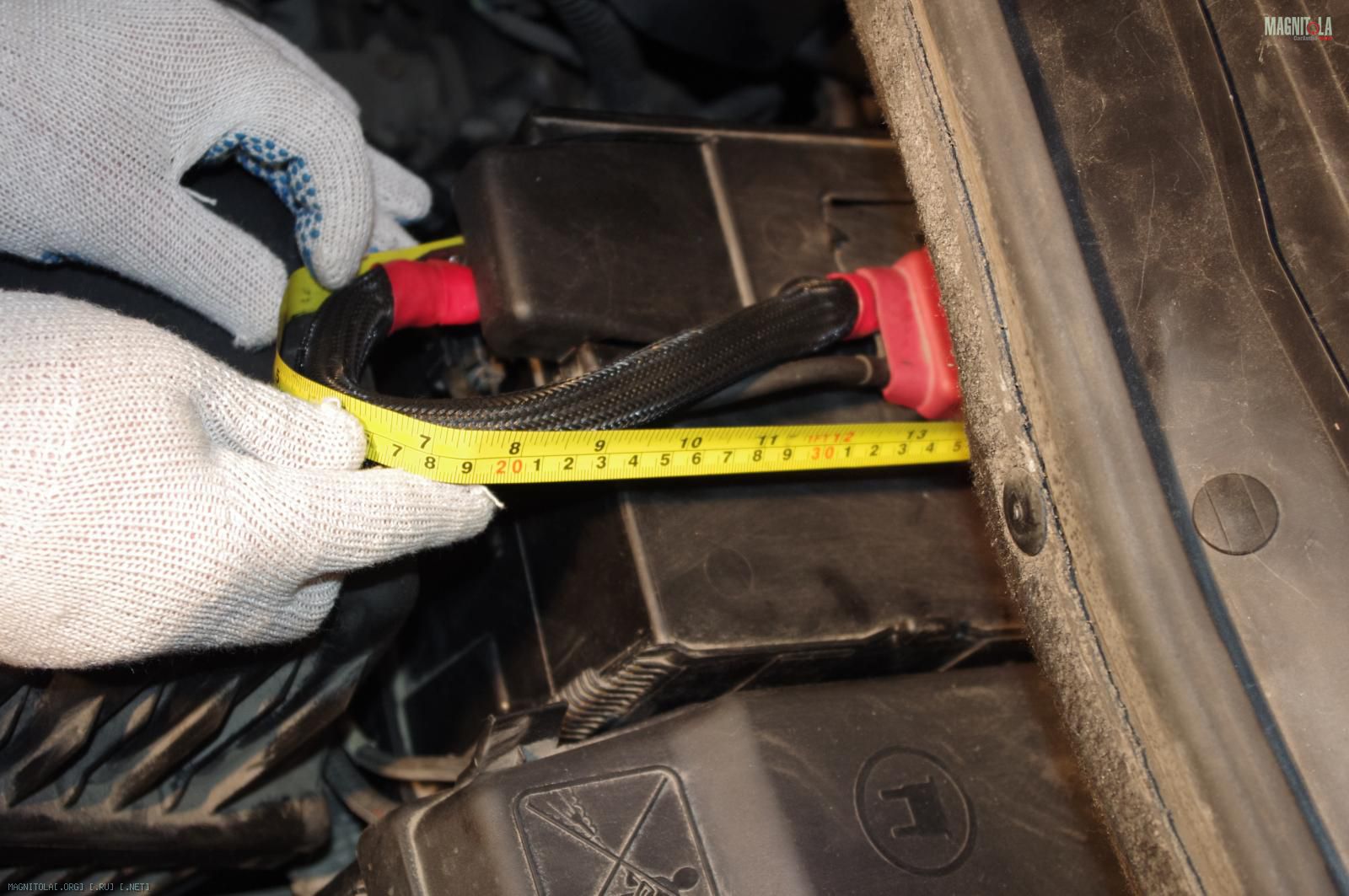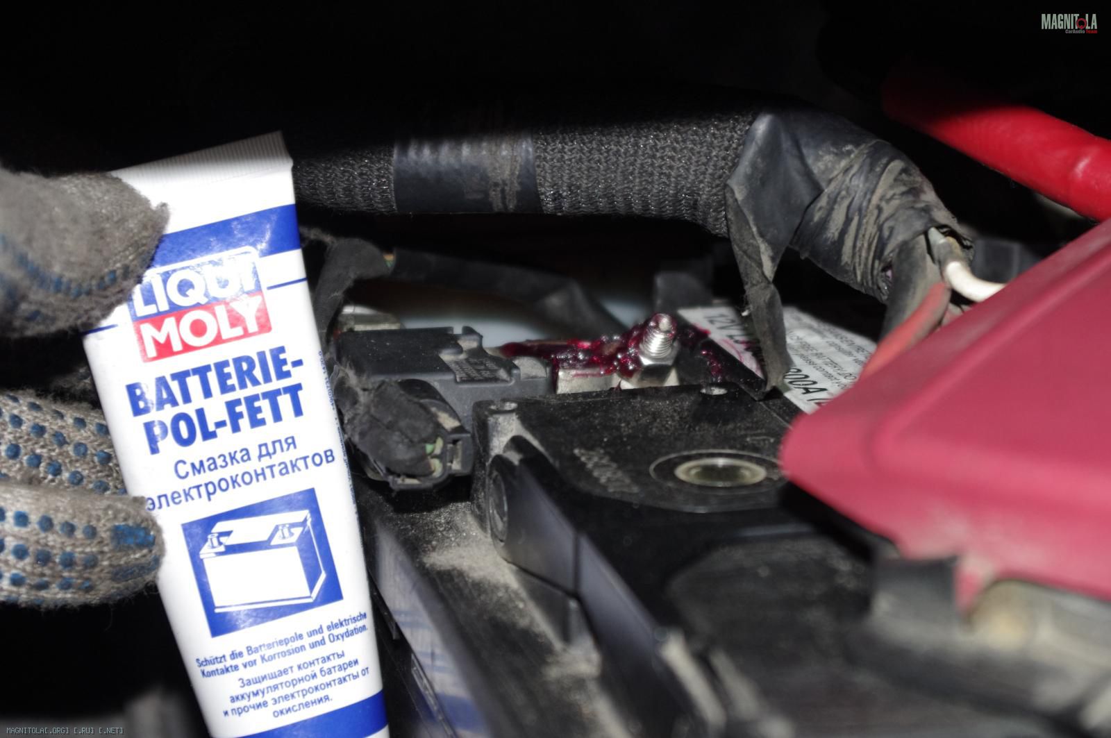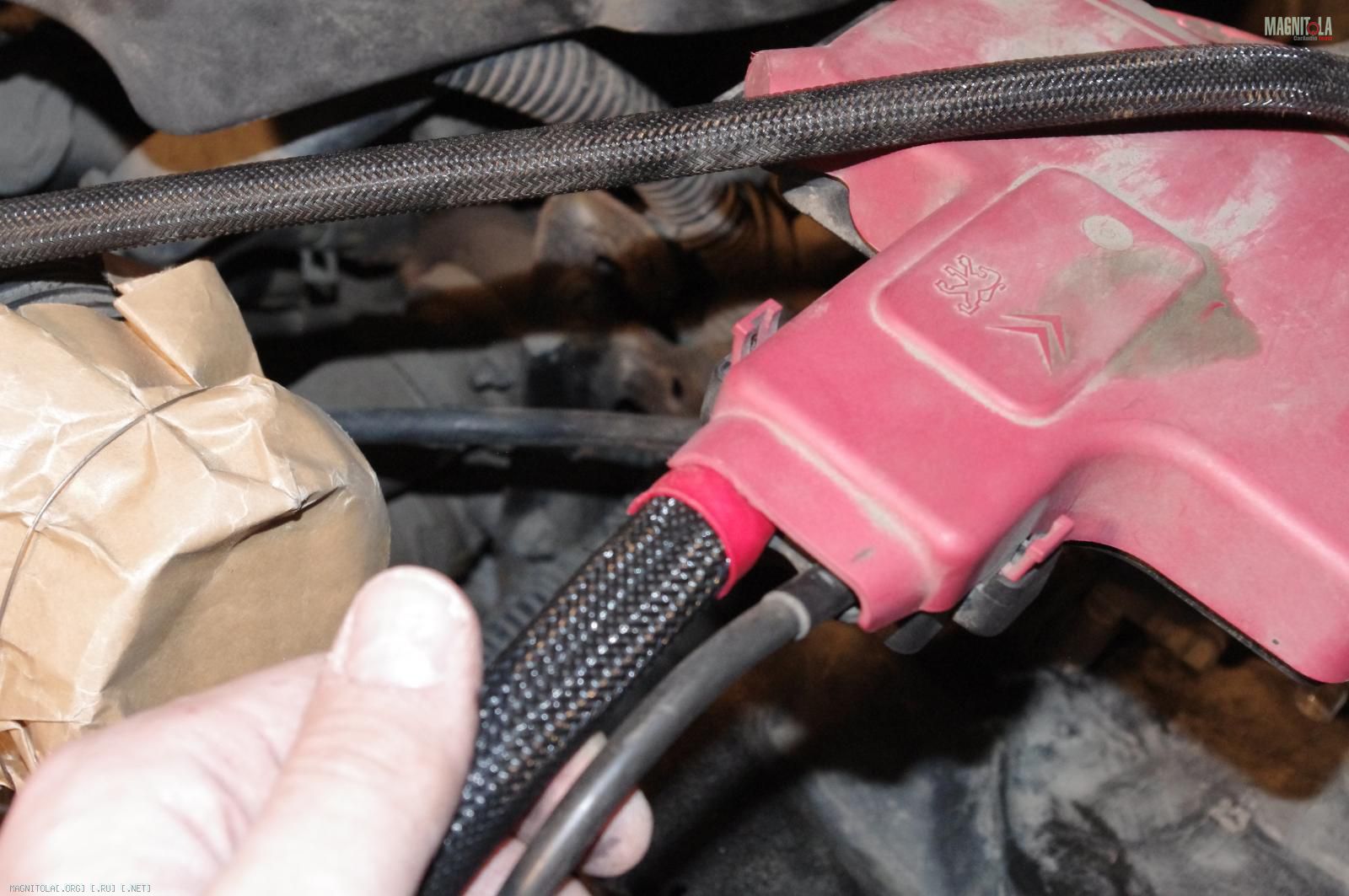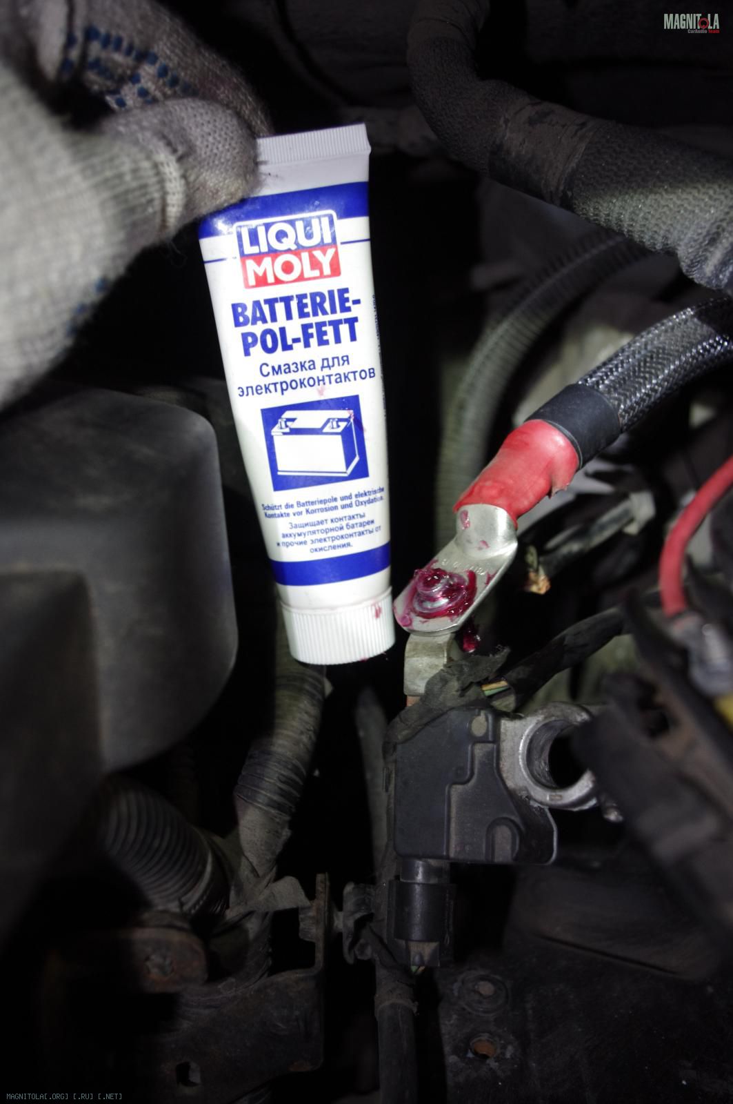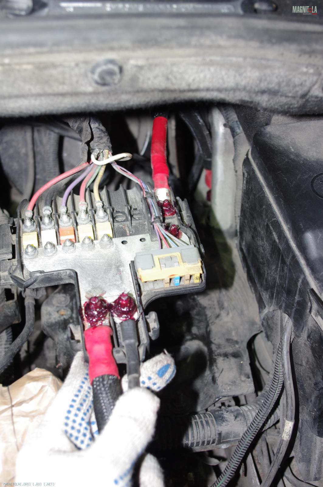 и расстраиваемся:( Ибо при таком расположении дополнительного кабеля массыне защёлкивается крашка аккумуляторного отсека, на которую крепится штатный распределитель питания. Время было уже далеко заполночь, поэтому на этом работы под капотом мы закончили.