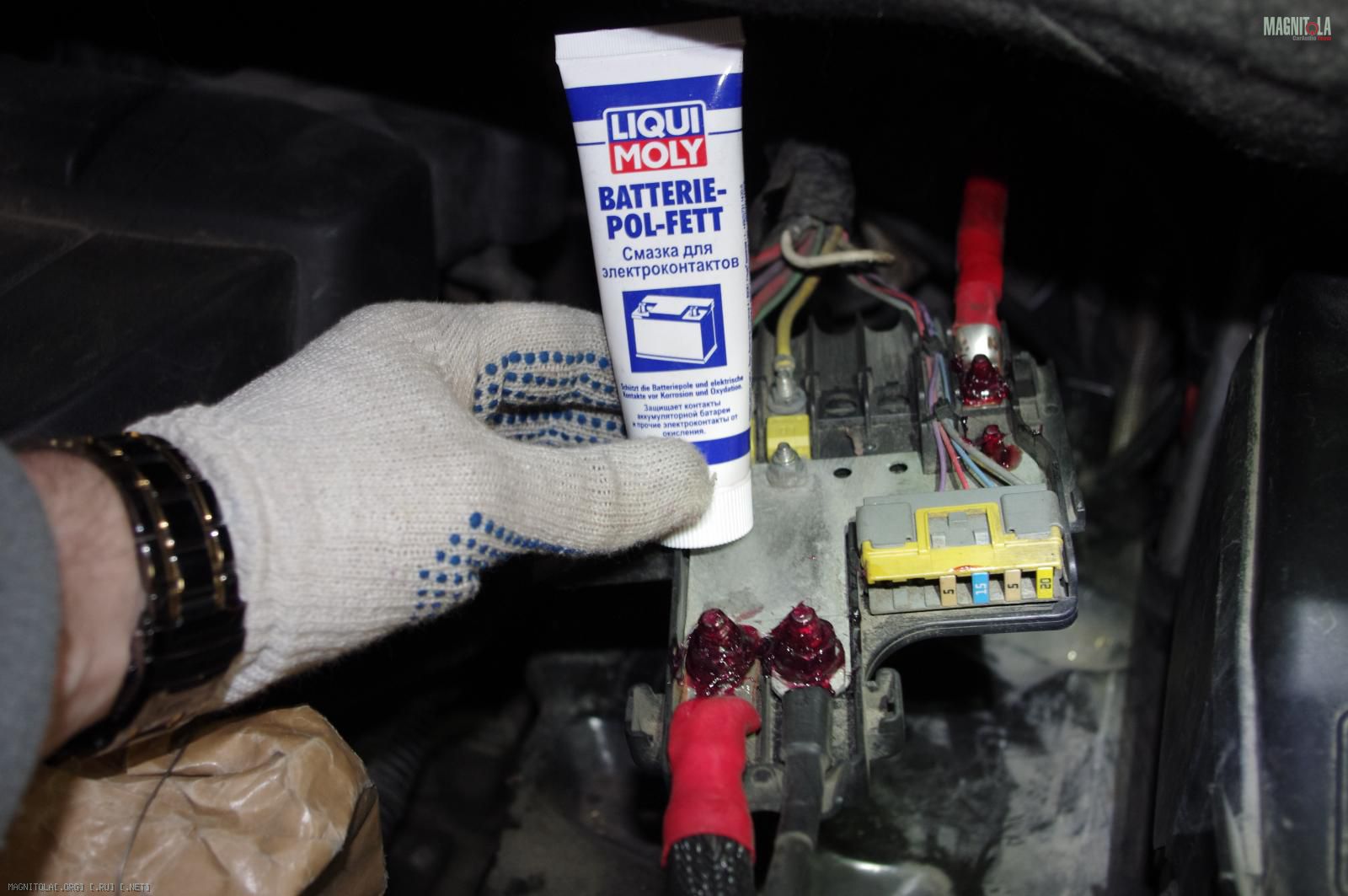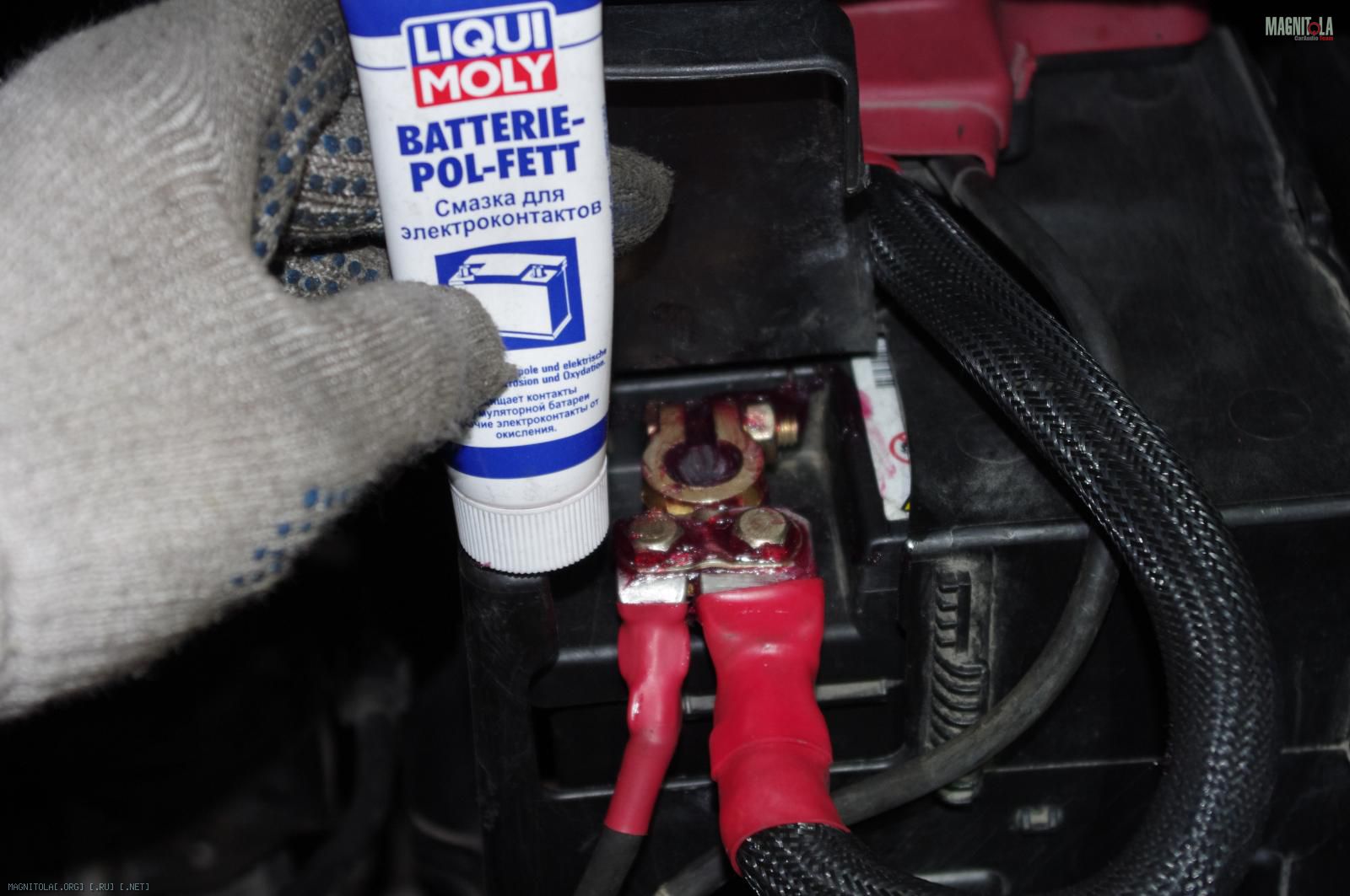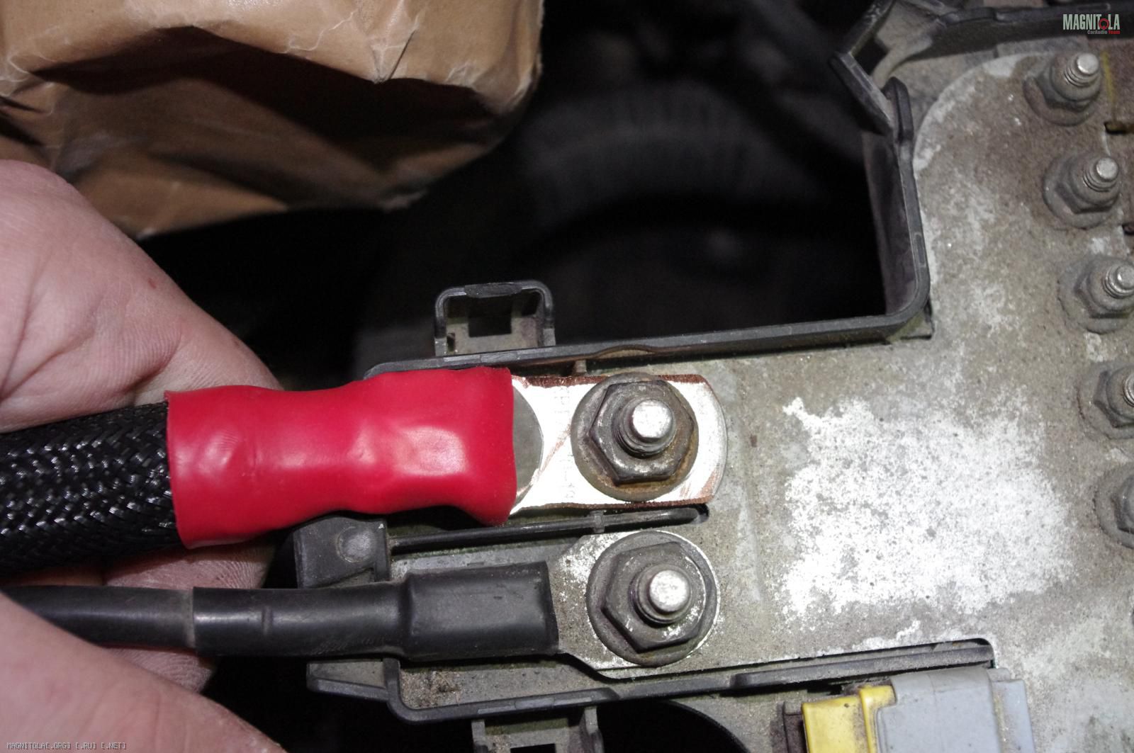 Одел кожул аккумулятора, который по совместительству является креплением для штатного распределителя питания и защитой для клеммы, нацепил плюсовую клемму и её тоже... ну Вы поняли: