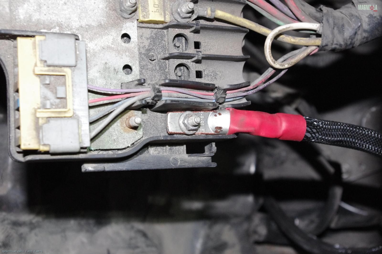 На выходе из штатного распределителя находим незадействованную шпильку, и цепляем туда КГ-35, который пойдёт на питание аудиосистемы в багажник.