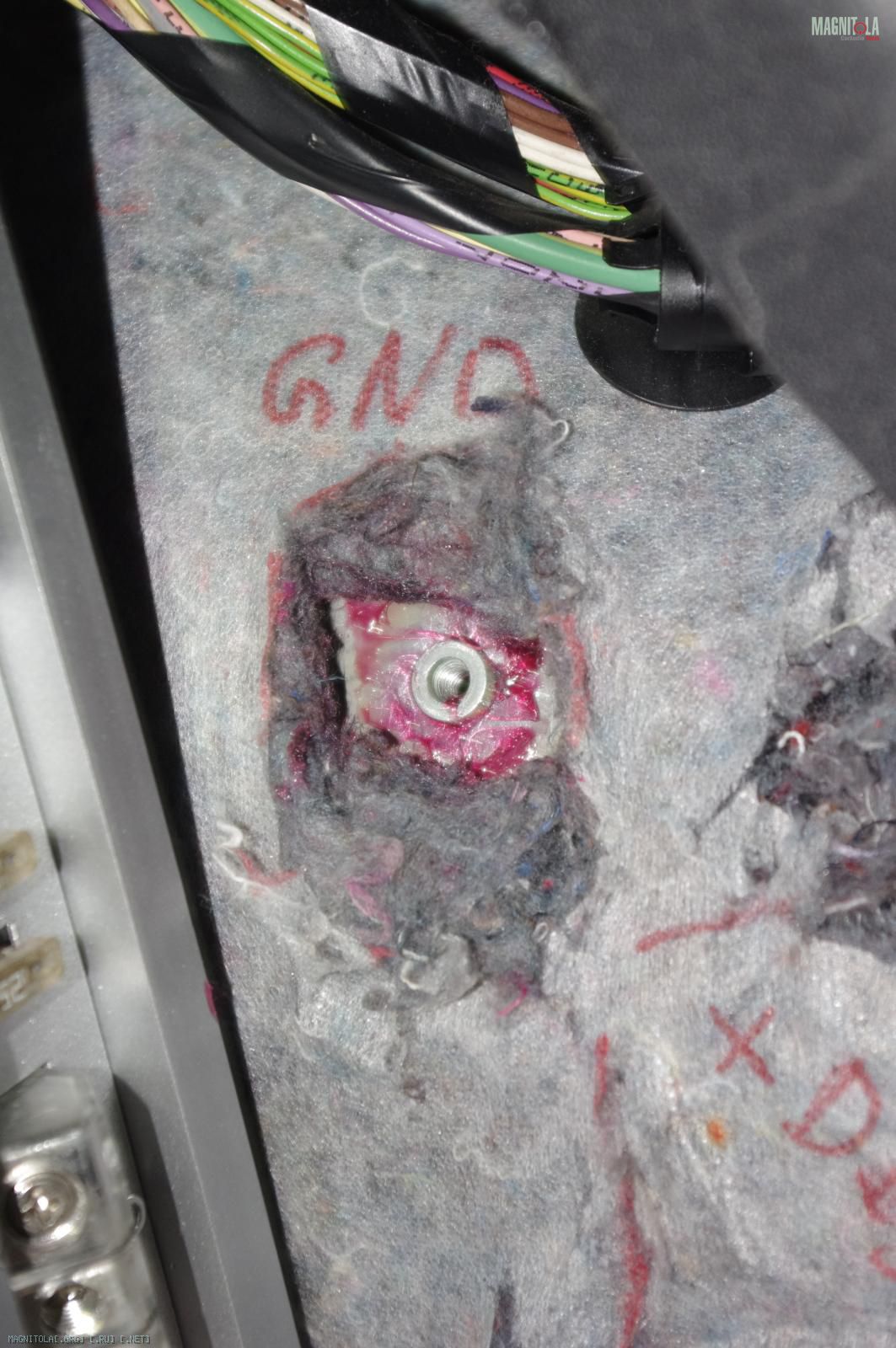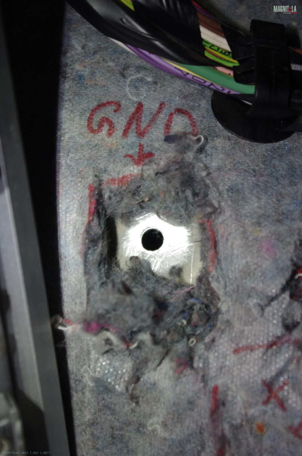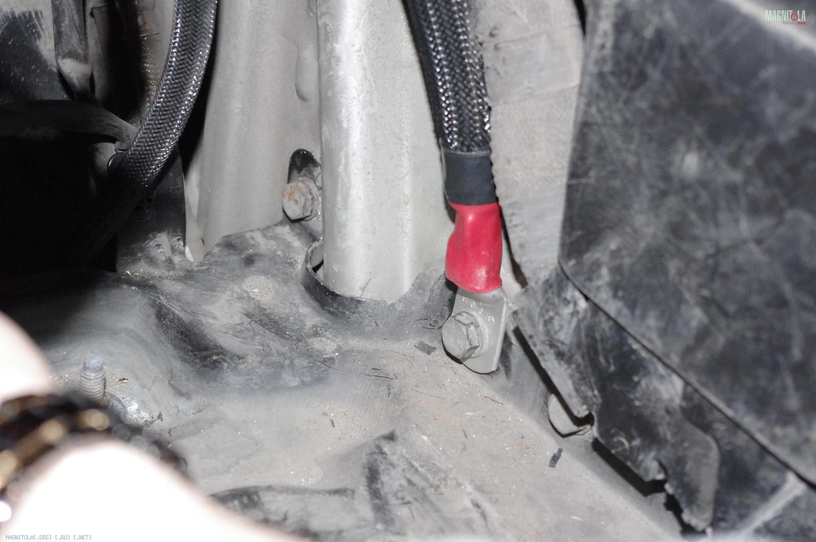 К этой точке будет прикручено два кабеля массы: один напрямую к усилителю сабвуфера, второй - на распределитель массы устройств правой стороны багажника. О креплении этих дистрибьюторов читайте в следующем посте