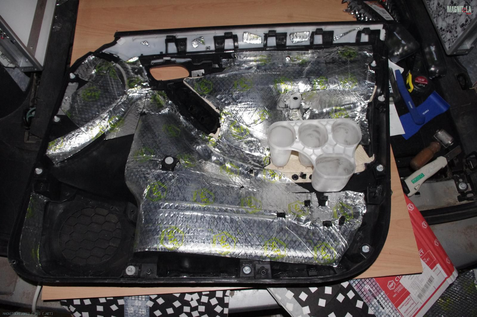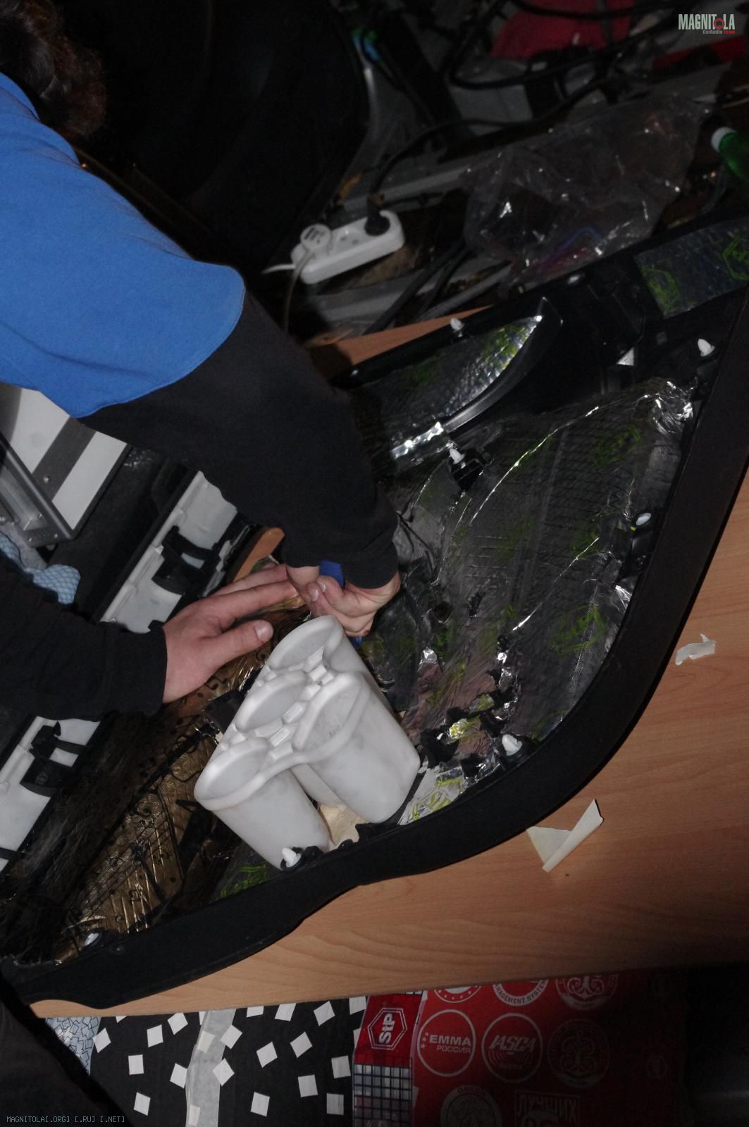 Постоянно отвлекаясь на консультации с ребятами о том, как что лучше делать и на фотосессию проделанной работы, потихонечку подготовил двери к будущим полиэфирным безумствам путём установки около 14 штук резьбовых заклёпок