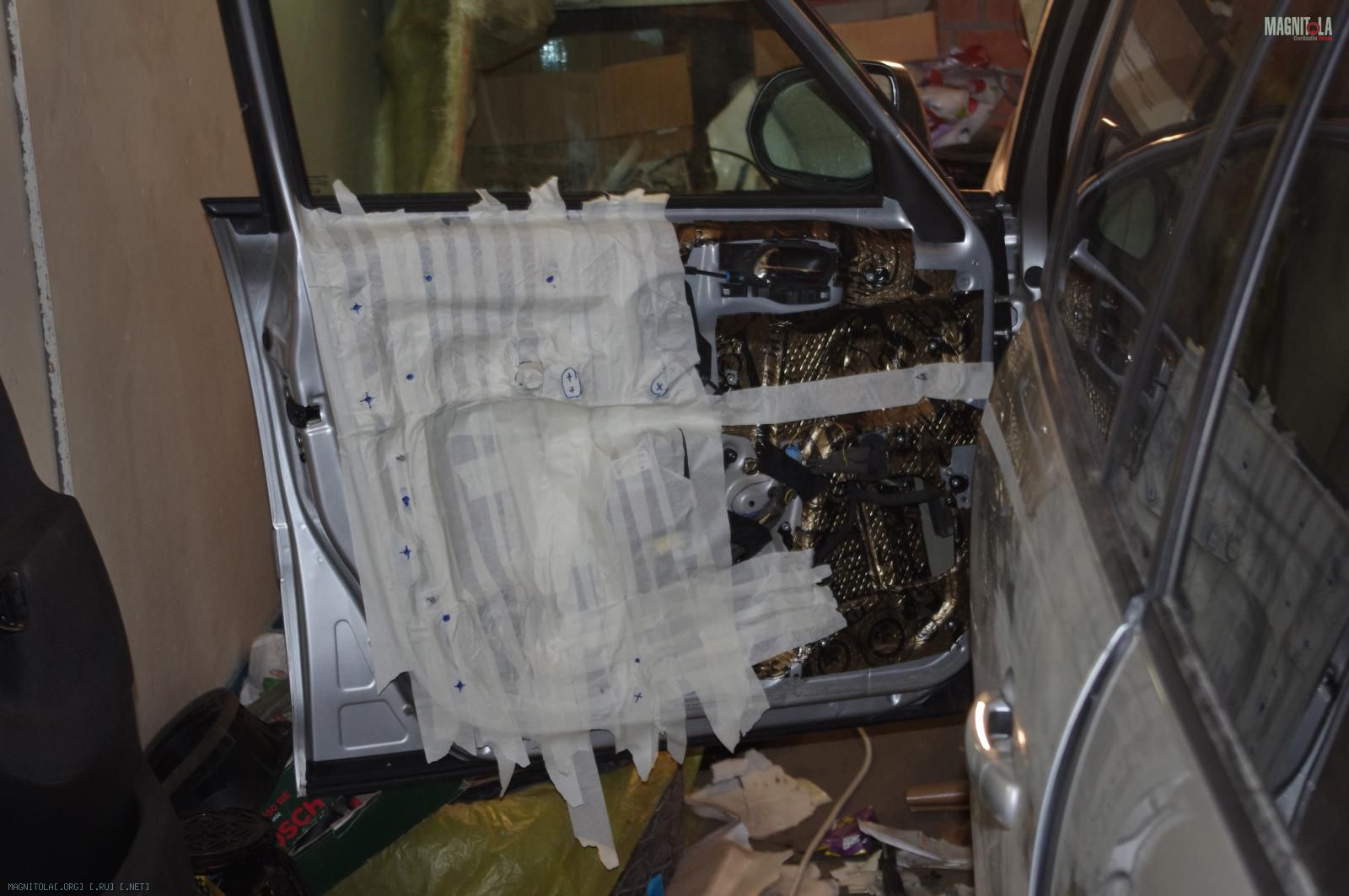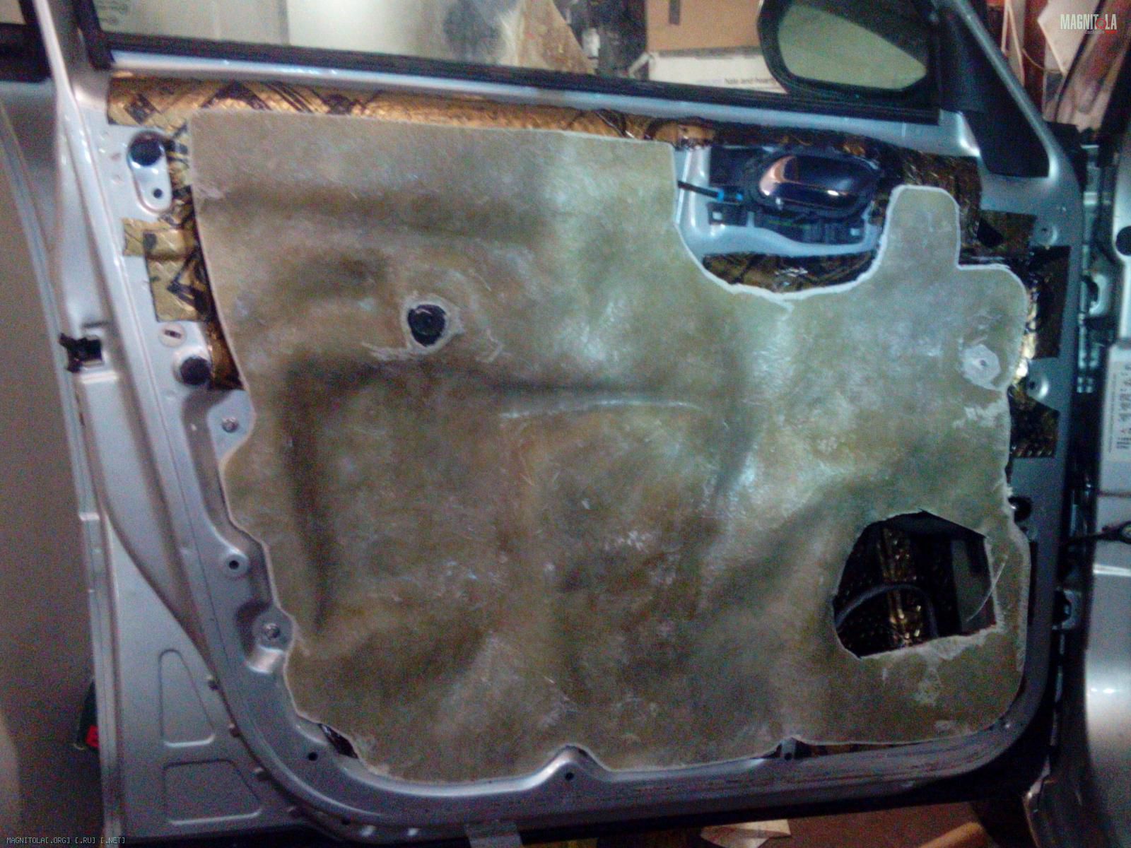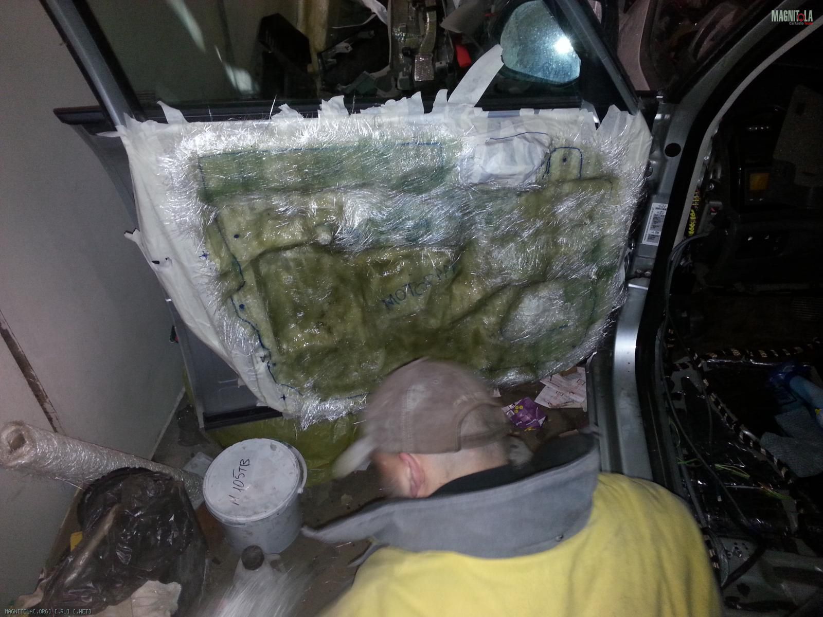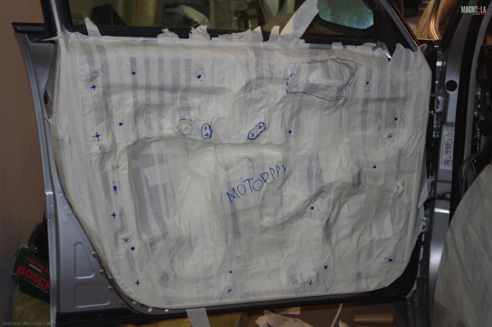 С дверями мы остановились на том, что закончили их проклеивать виброй, насверлили отверстий и заклепали резьбовых заклёпок. Поверх этой красоты Dima1982 наклеил слой малярного скотча (хорошо оклеить дверь, чтобы правильно соблюсти рельеф - на целый час работы, между прочим!)