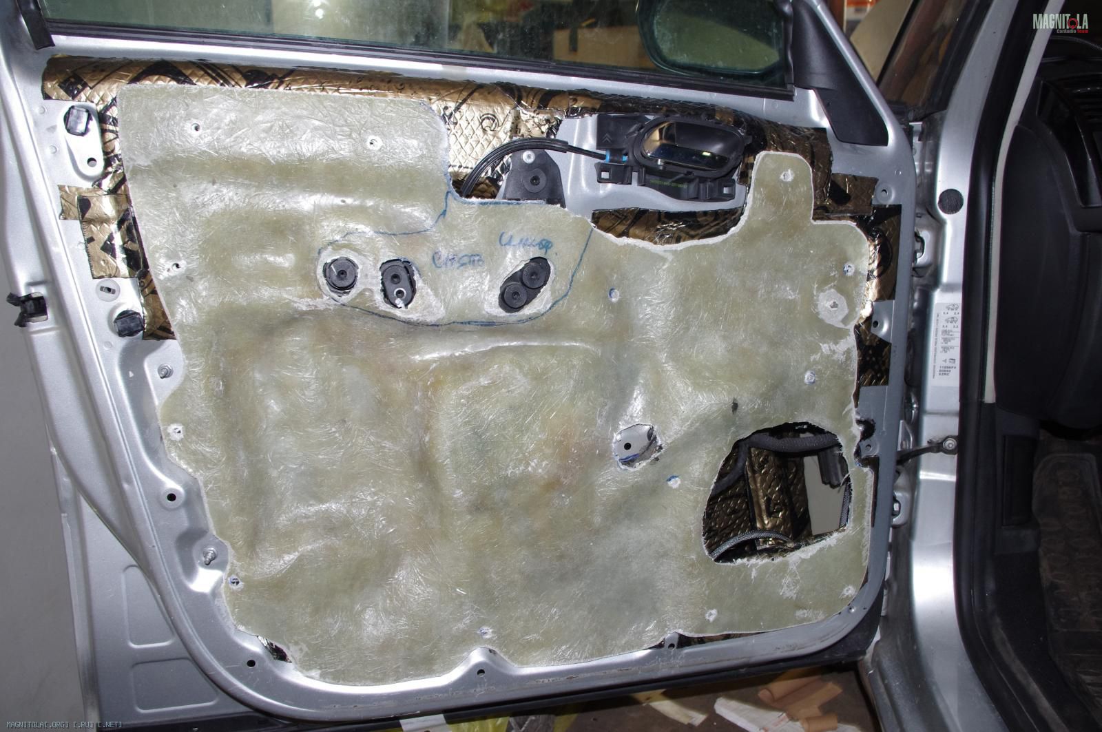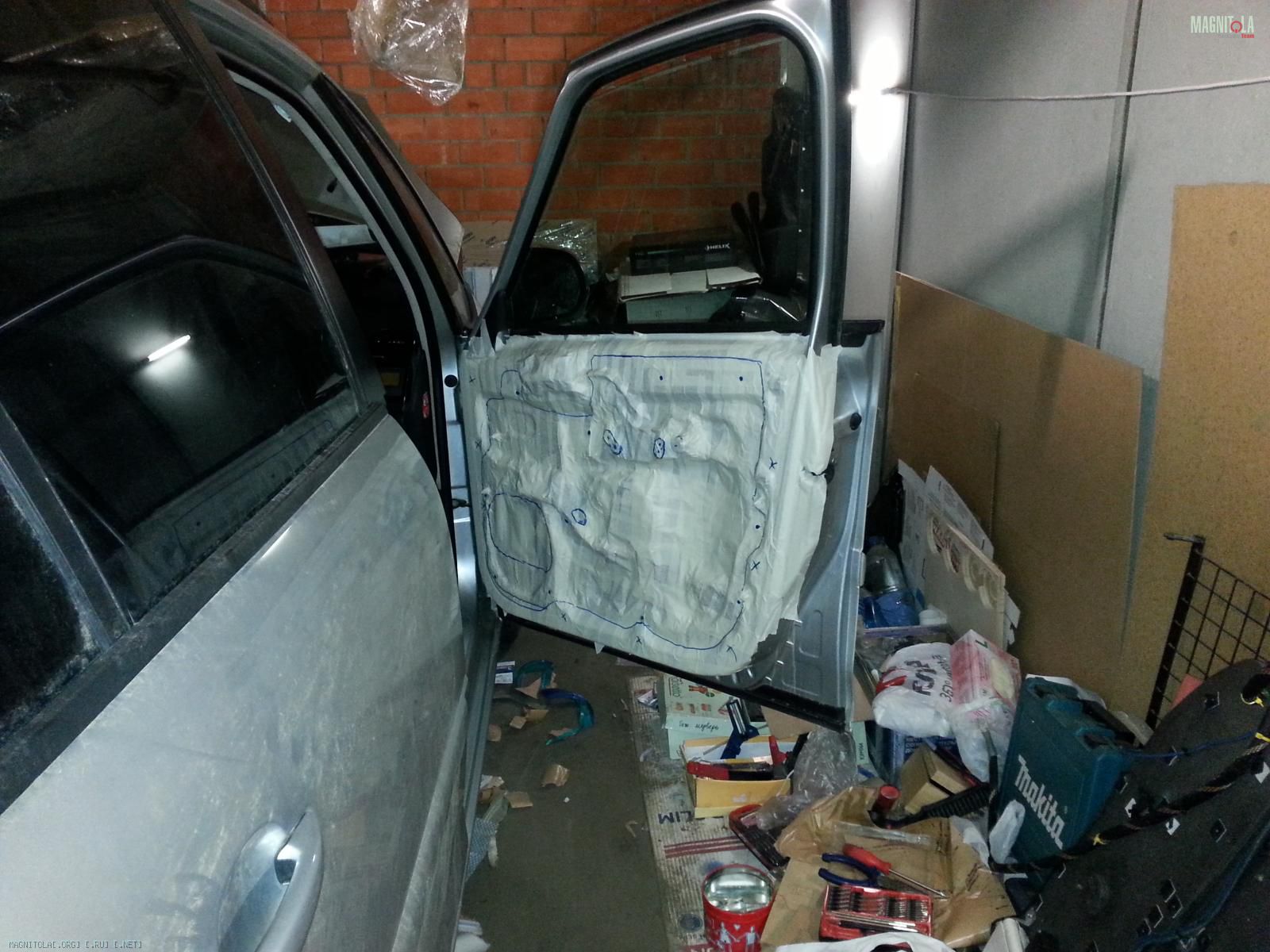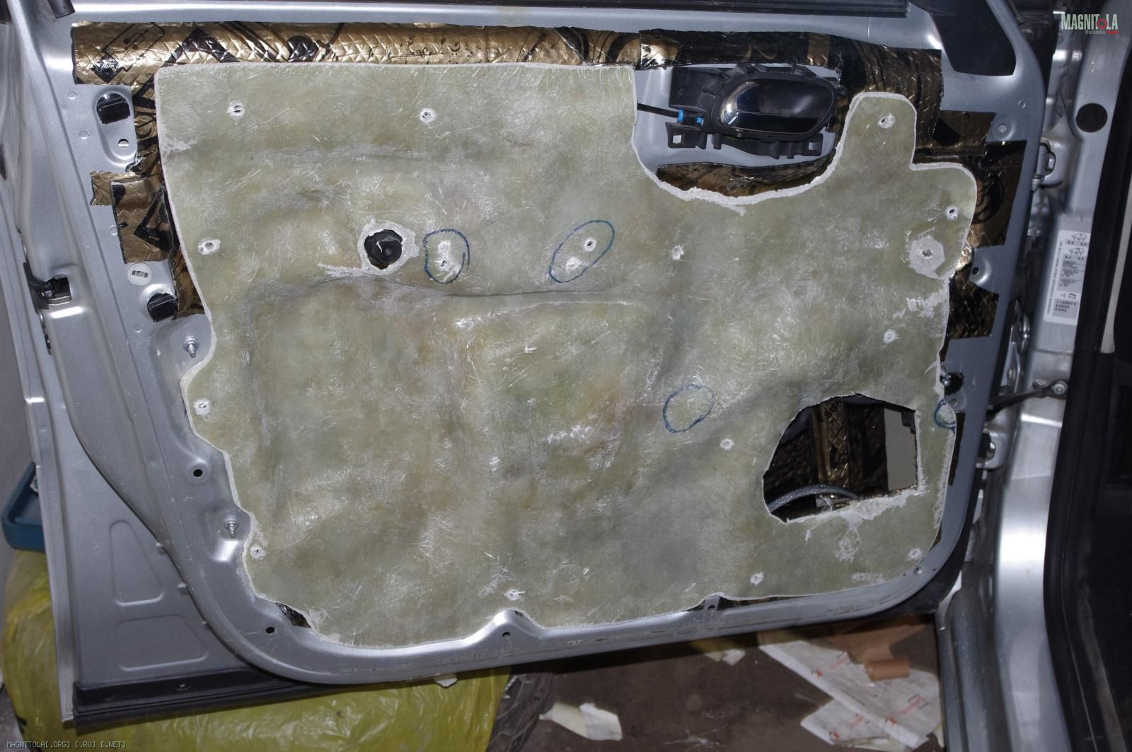С дверями мы остановились на том, что закончили их проклеивать виброй, насверлили отверстий и заклепали резьбовых заклёпок. Поверх этой красоты Dima1982 наклеил слой малярного скотча (хорошо оклеить дверь, чтобы правильно соблюсти рельеф - на целый час работы, между прочим!)