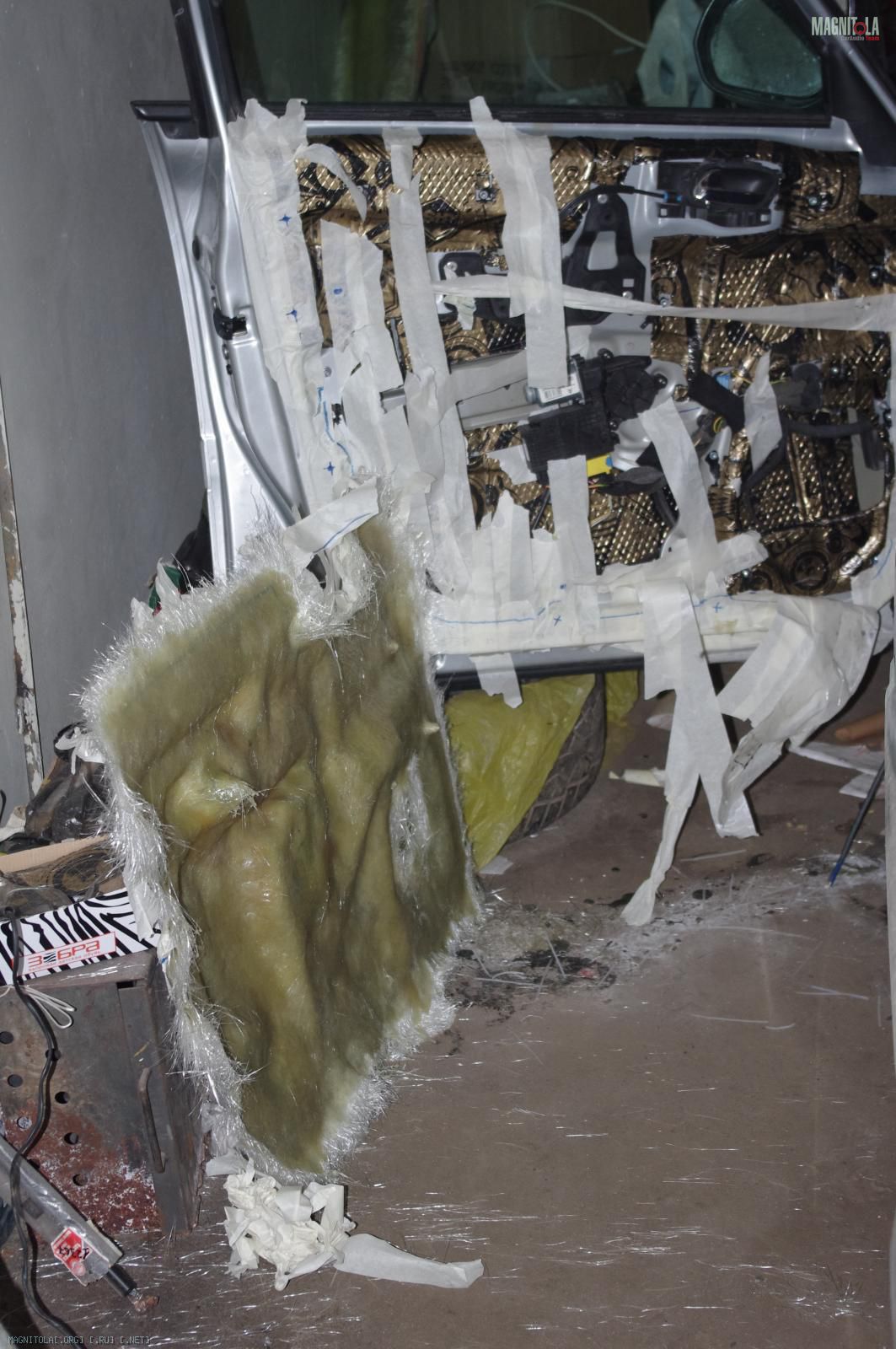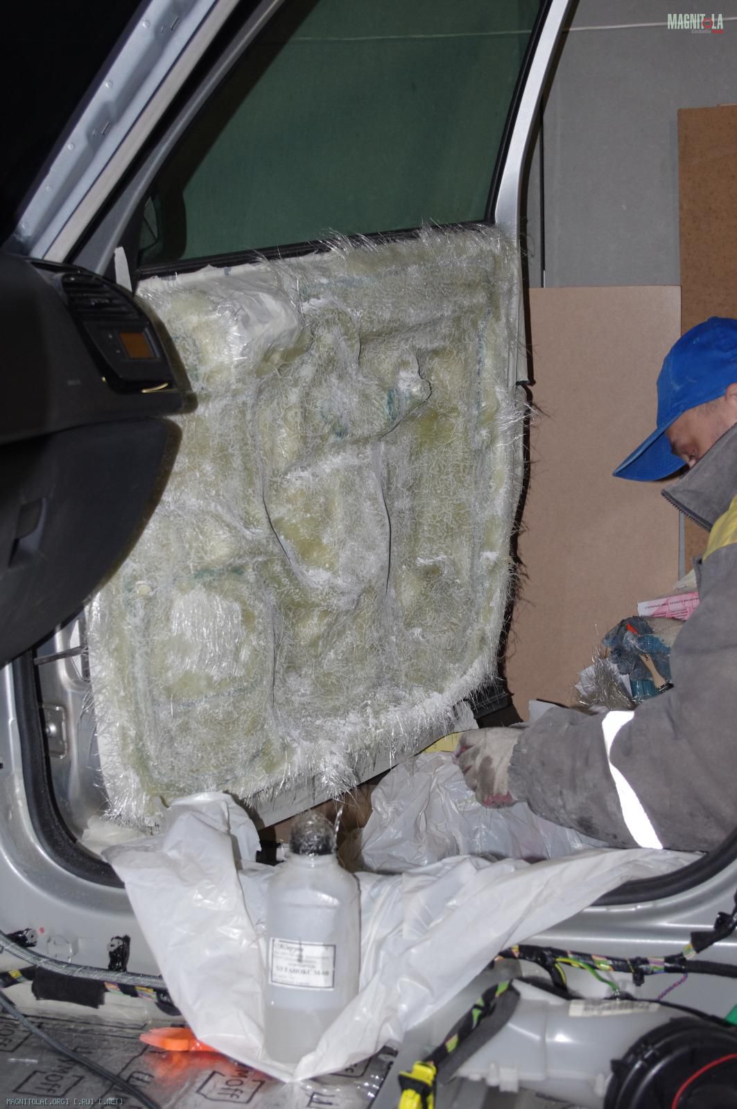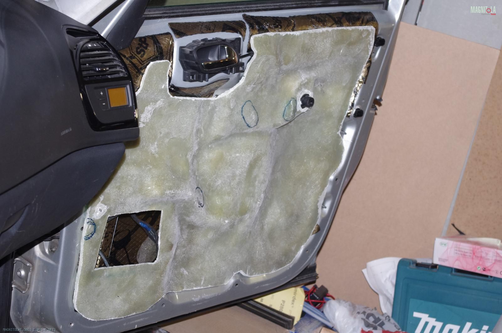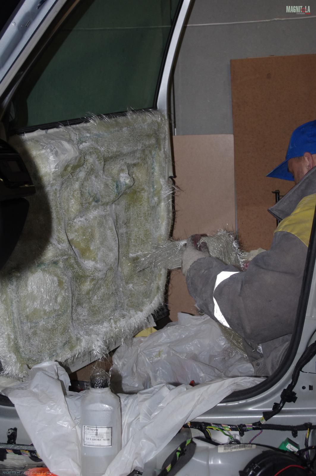С дверями мы остановились на том, что закончили их проклеивать виброй, насверлили отверстий и заклепали резьбовых заклёпок. Поверх этой красоты Dima1982 наклеил слой малярного скотча (хорошо оклеить дверь, чтобы правильно соблюсти рельеф - на целый час работы, между прочим!)