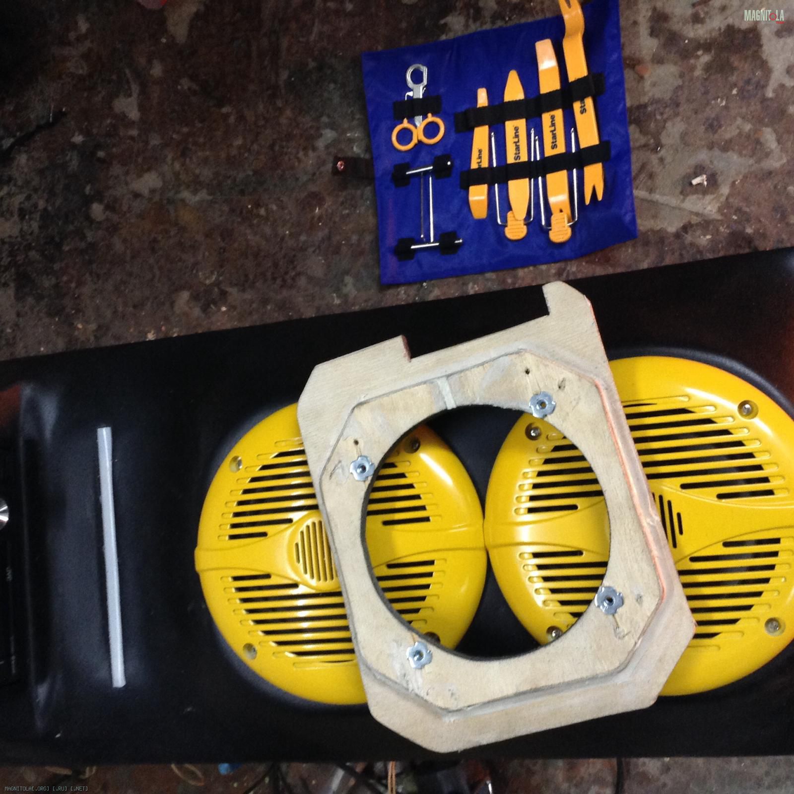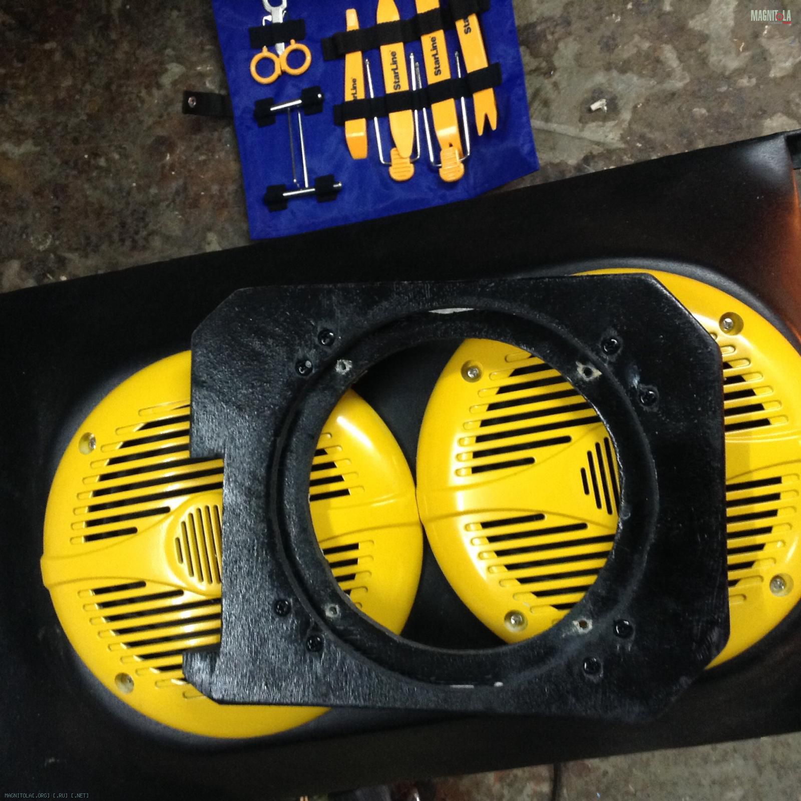 Собственно переходник, для установки мидбаса в кик панель. Сделан из фанеры, в связи с тем что площадь не велика и жескость такой конструкции будет достаточной - выбрана такая толщина. Мидбас будет крепиться четырьмя болтами под шестигранник и закладные гайки, возможно еще добавлю пару саморезов (хотя и в данном случае вибраций не возникает).