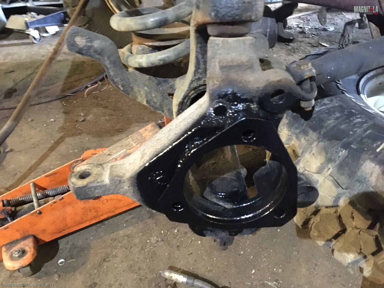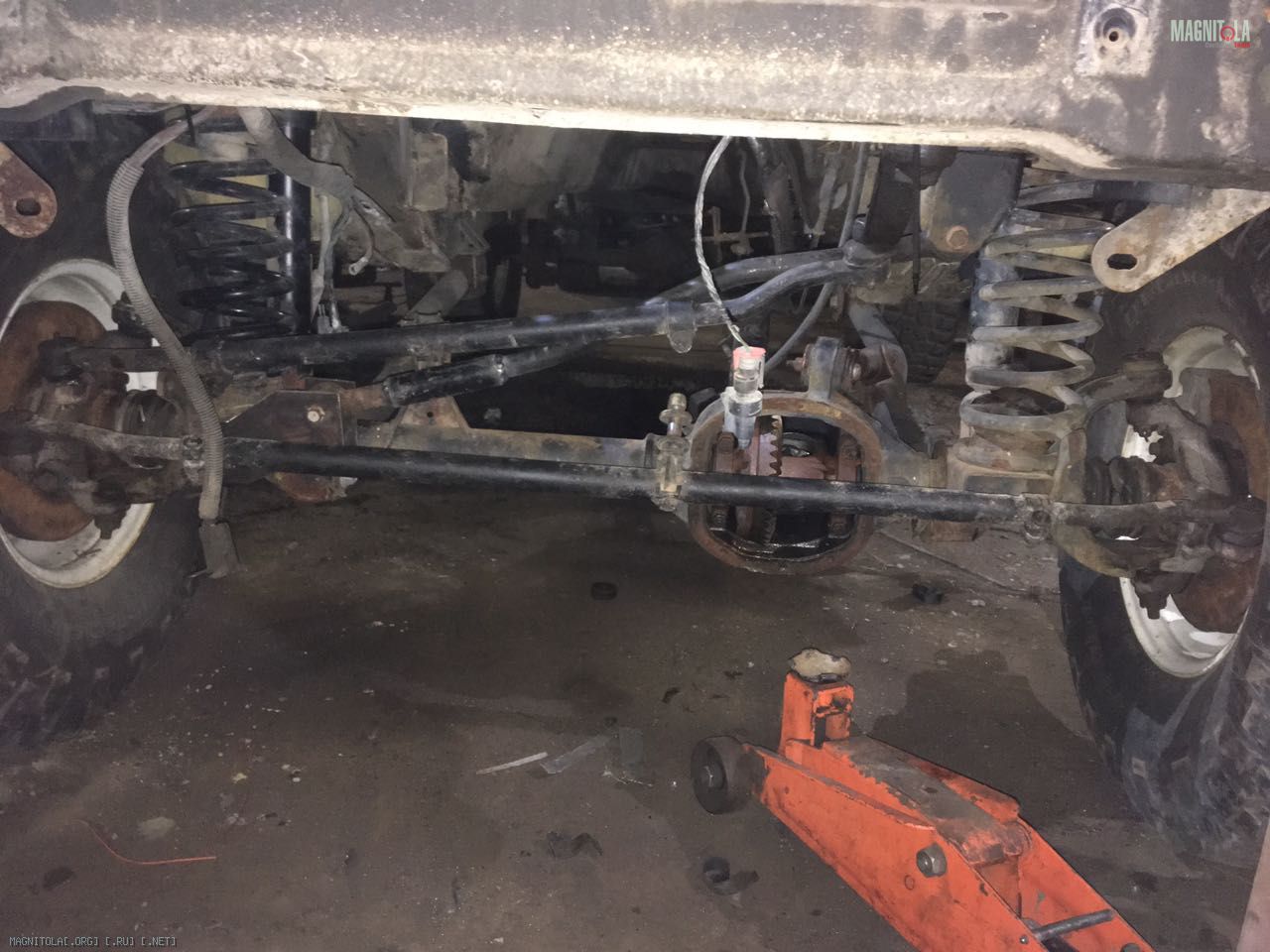 Установлены передние рулевые кулаки от следующего поколения гранд чероки WJ, это позволило установить рулевые тяги со сменными наконечниками, уйти от системы "ножницы" (верхняя тяга крепится на нижнюю) и это позволило перенсти рулевые наконечники на верх кулака, тем самым подняв тягу выше, дабы не упороть ее об камень.