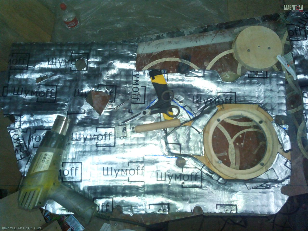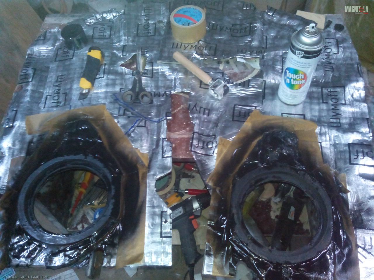 "Щит" был вылеплен прямо по двери, естественно через малярный скотч ))) Два слоя 150 мата и два слоя 300...в итоге конструкция получилась достаточно "глухая" и прочная...