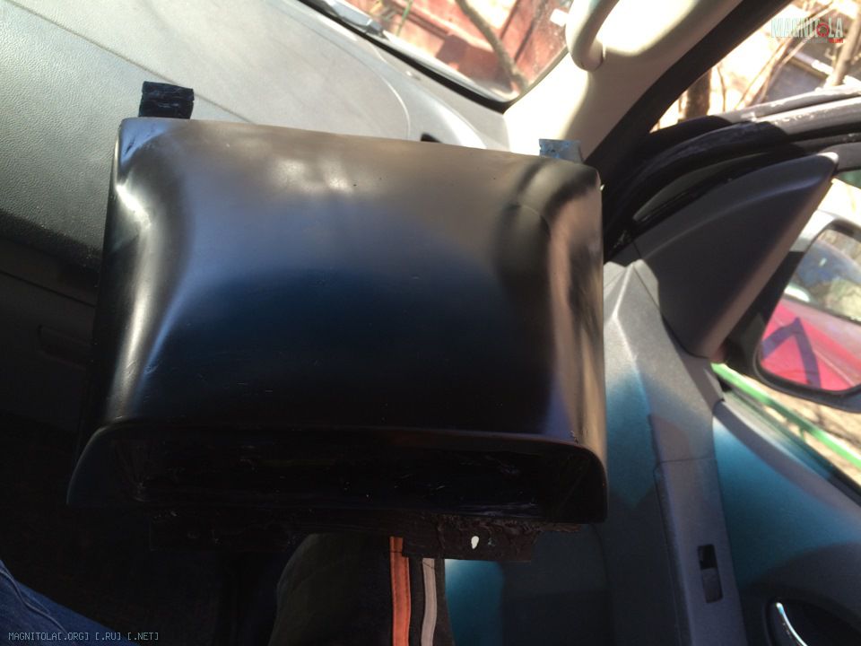 Первый день еще раз перепробовал кучу креплений и различные комбинации домика из стеклотекстолита. Короче запарился я с ним. Пилить его надоело. Пыли море от него. Но часть крепления из текстолита оставил и буду потом его сращивать. Т. К. Оно уже идеально подогнано. И решил лепить предварительный макет из холодного пластика. Установил магнитолу на место, выставил углы установки и слепил часть домика. И ездил с домиком. Пока застывал.
