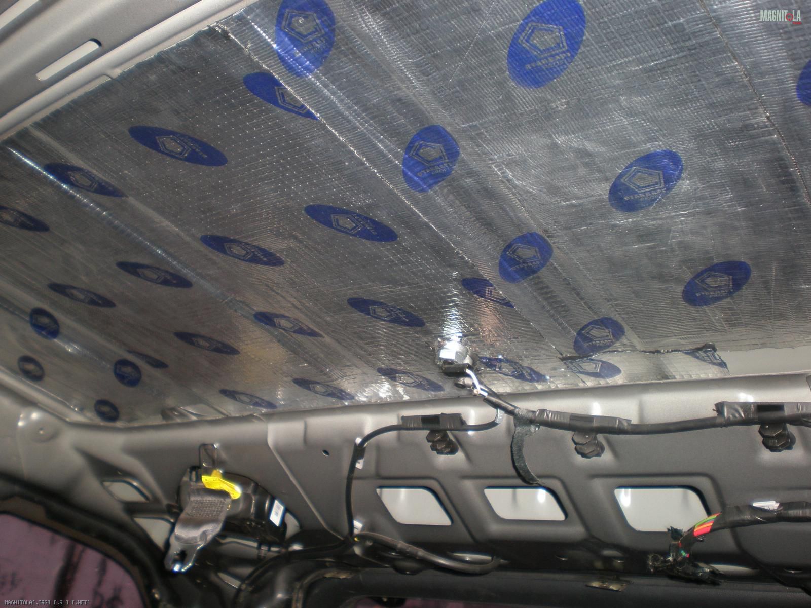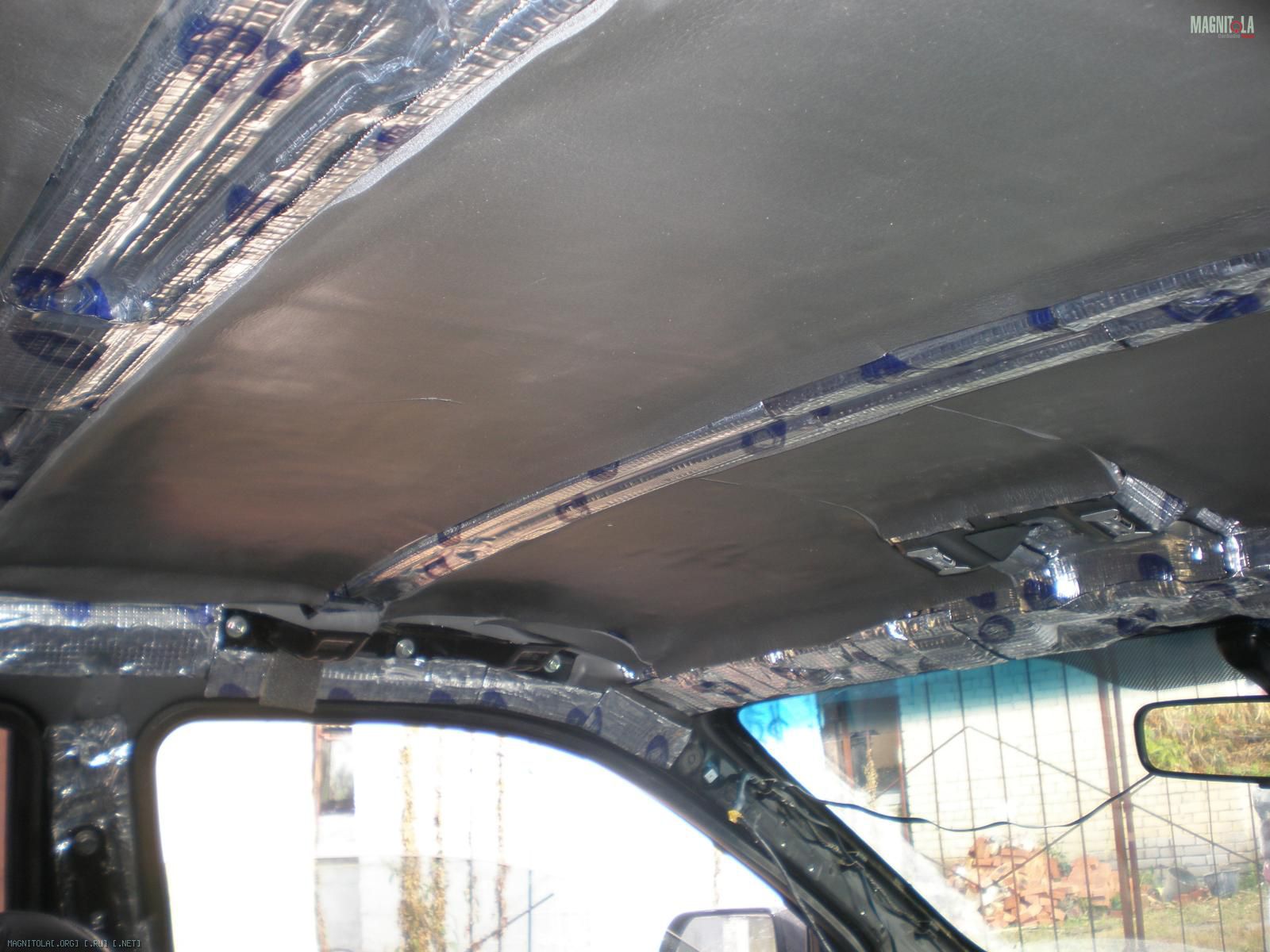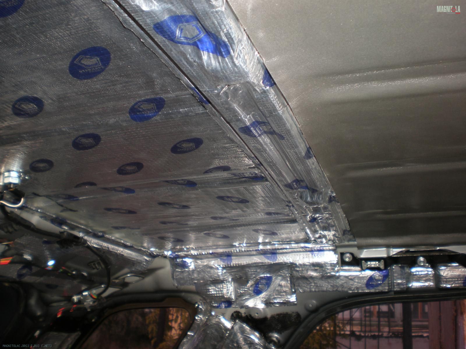На потолке использовал виброизоляцию производителя Стандарт профи толщиной, если не ошибаюсь 2 мм, уже точно не помню. Сверху сплен 4 мм. Алюминиевый скотч по щелям... И все. Обшивка крыши села без проблем, все лампы установились.