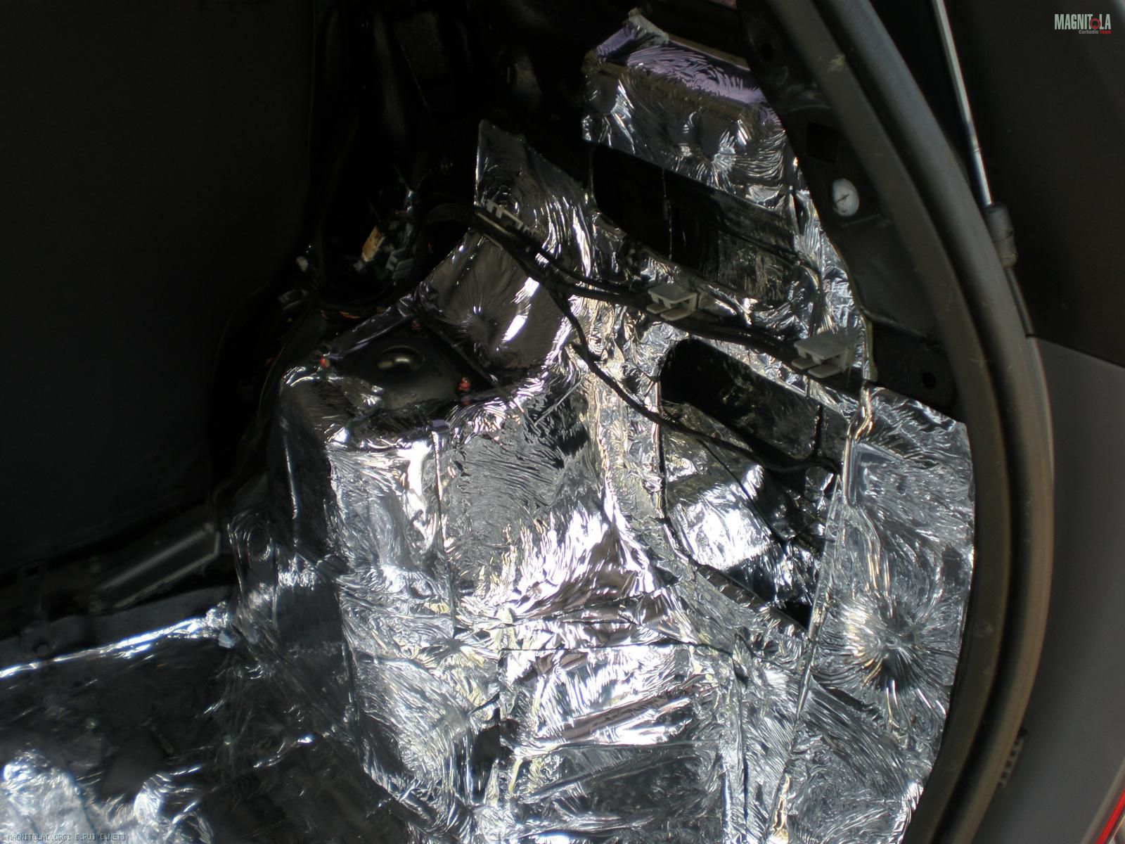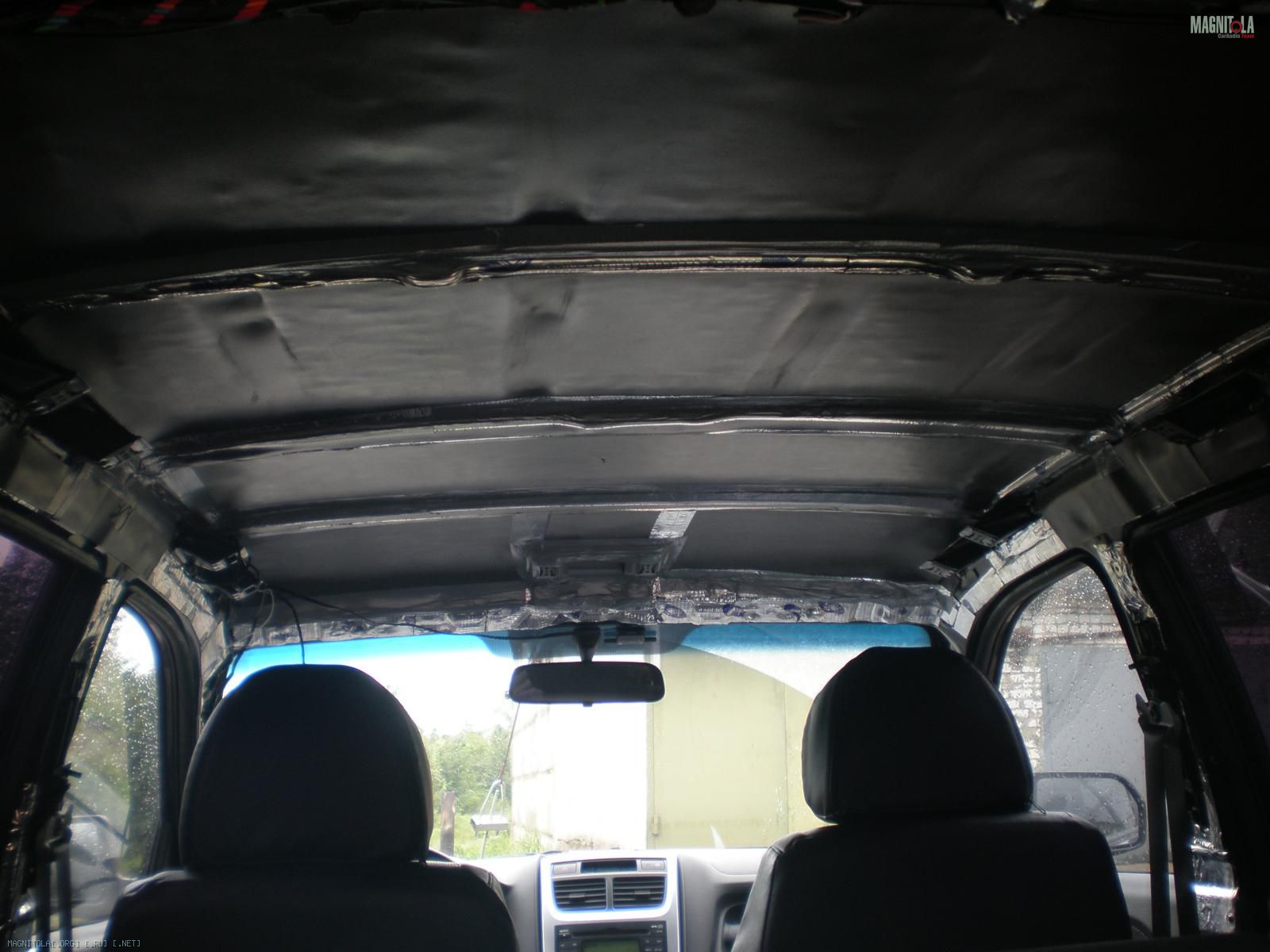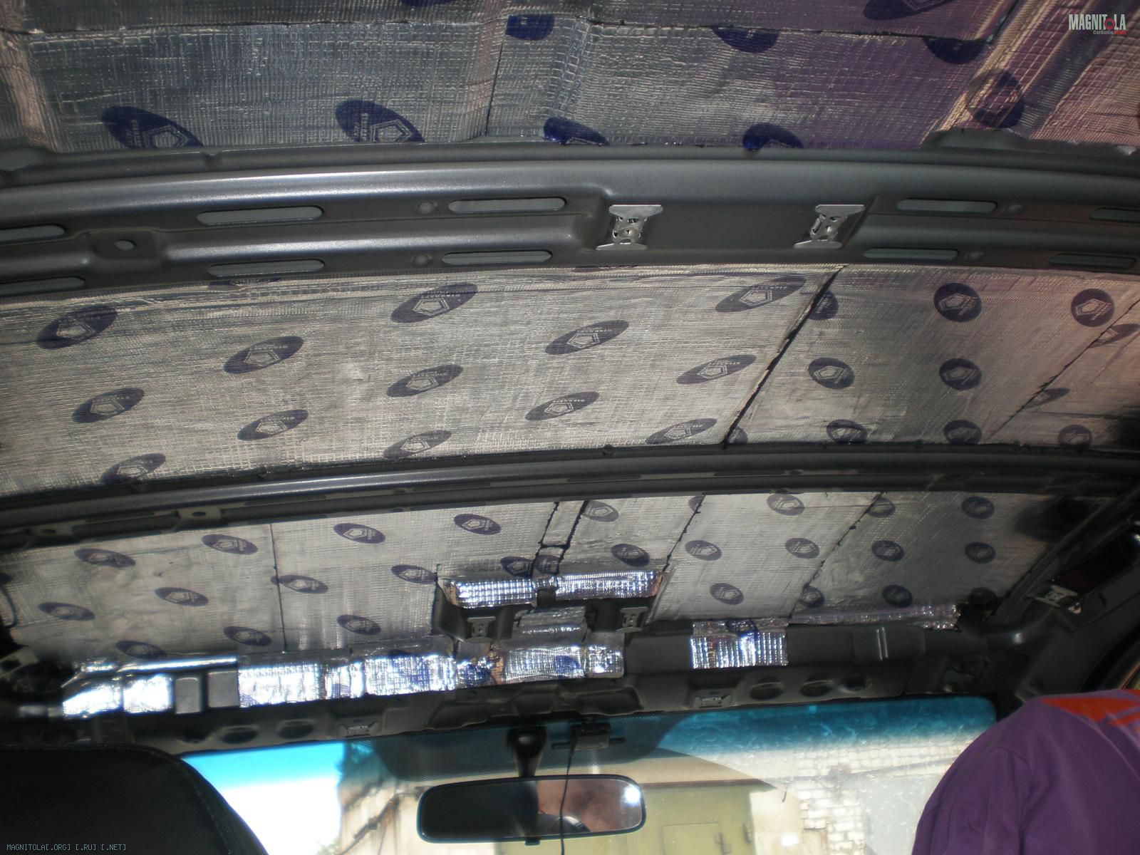 На потолке использовал виброизоляцию производителя Стандарт профи толщиной, если не ошибаюсь 2 мм, уже точно не помню. Сверху сплен 4 мм. Алюминиевый скотч по щелям... И все. Обшивка крыши села без проблем, все лампы установились.