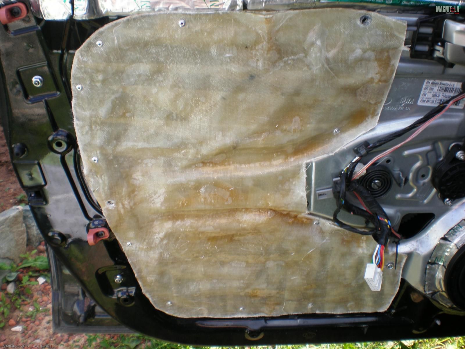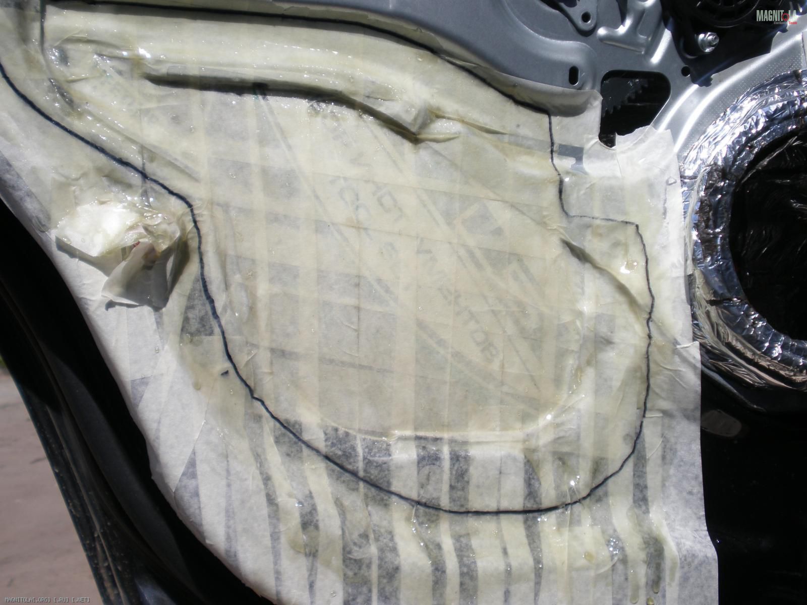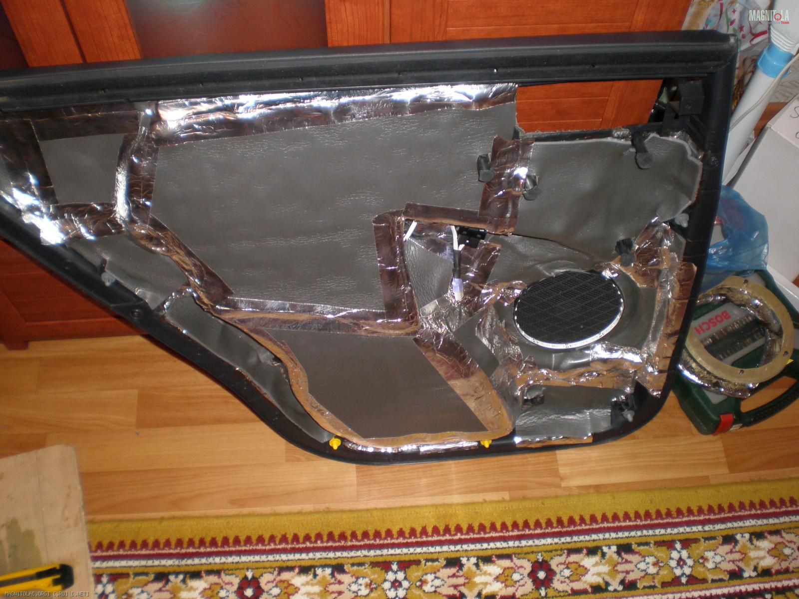 На передней двери решил одним куском закрыть технологические отверстия - не очень понравилось как получилось, может когда потолще сделаю лучше будет. Также один слой вибры внутри и также один карте под обшивкой . На самих обшивках тоже один слой вибры и сплена.