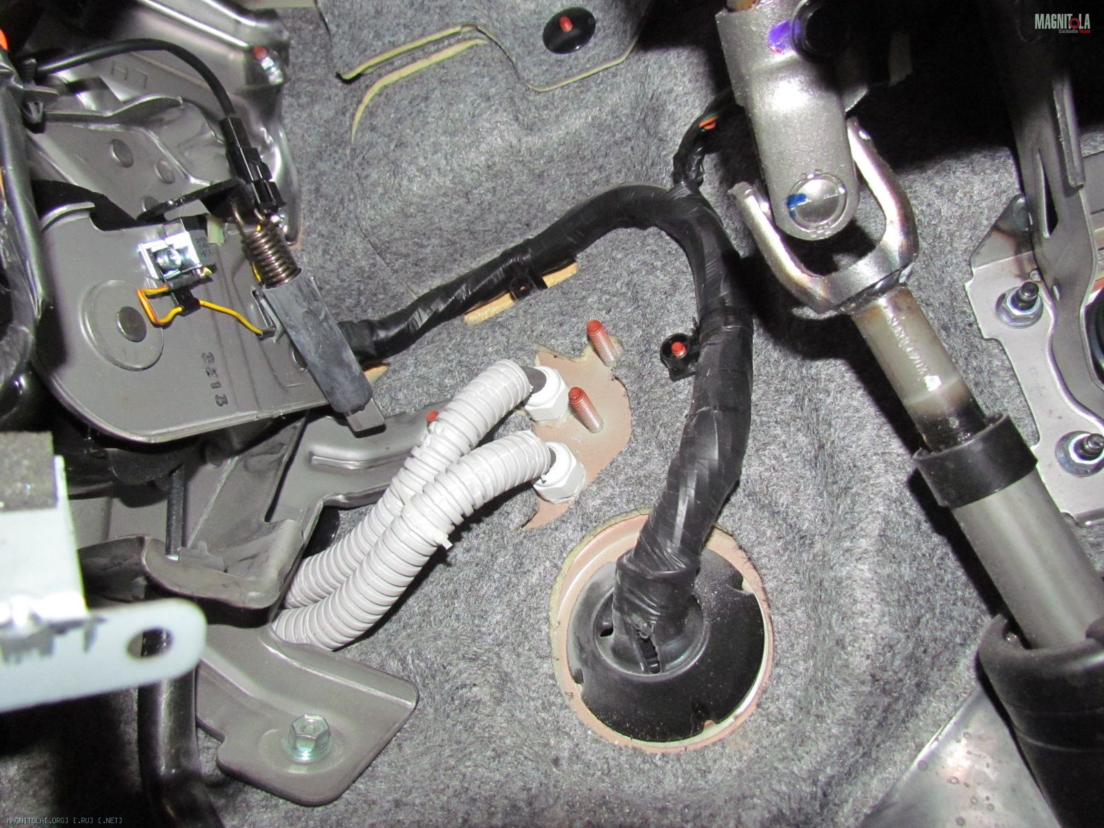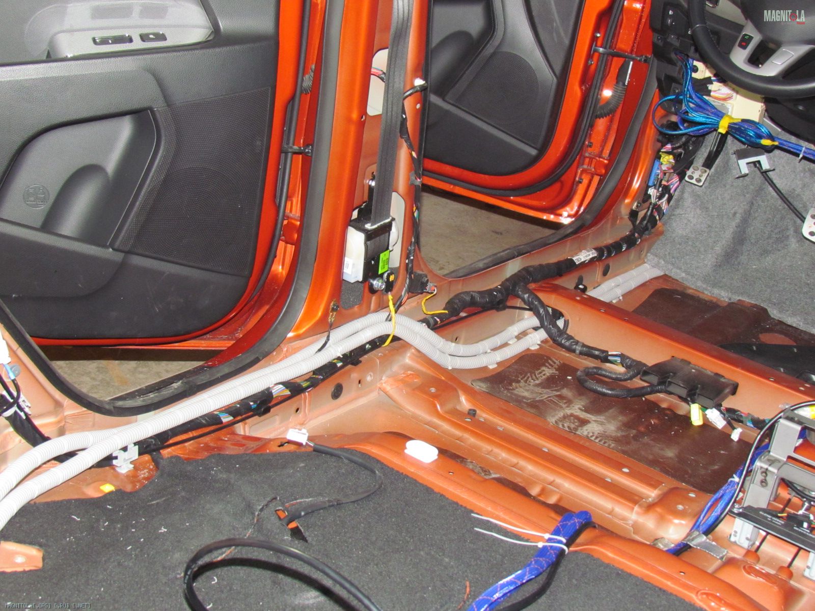 В двери провод проходит через штатные фишки рассверлив свободные контакты, с правым без проблем, с левым пришлось повозится.