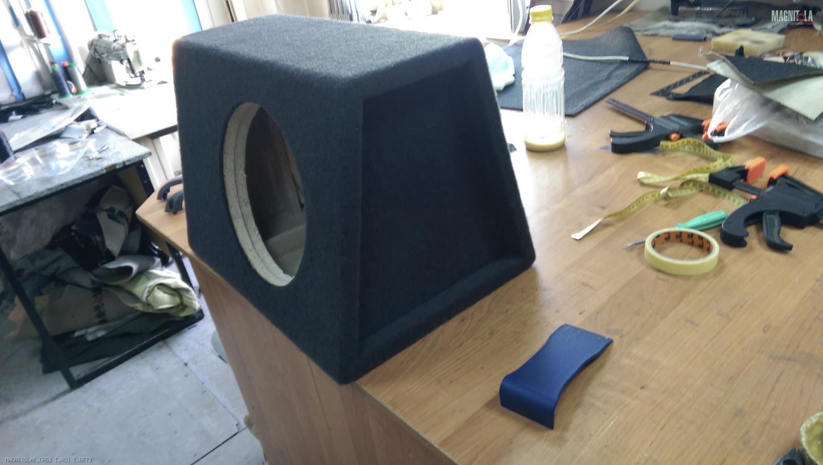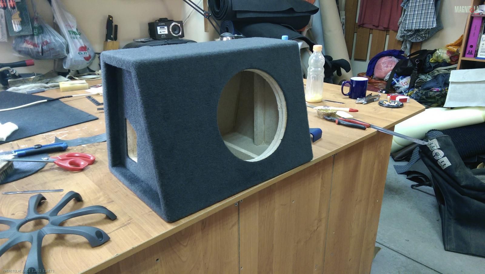 Теперь саб. Т.к. багажник не велик нужен компактный саб, не забывая при этом требования дина по объему. Самый компактный саб-это съемный саб. Делаем ящик классической формы.Объем 22 литра.Внутри ребра жесткости, передняя стенка двойная.Крепление динамика- винты плюс закладные гайки.На боковой стенке-пара SPEAKONов. К полу багажника крепится двумя ремнями на липучках.Вложение 745568Вложение 745570Вложение 745572