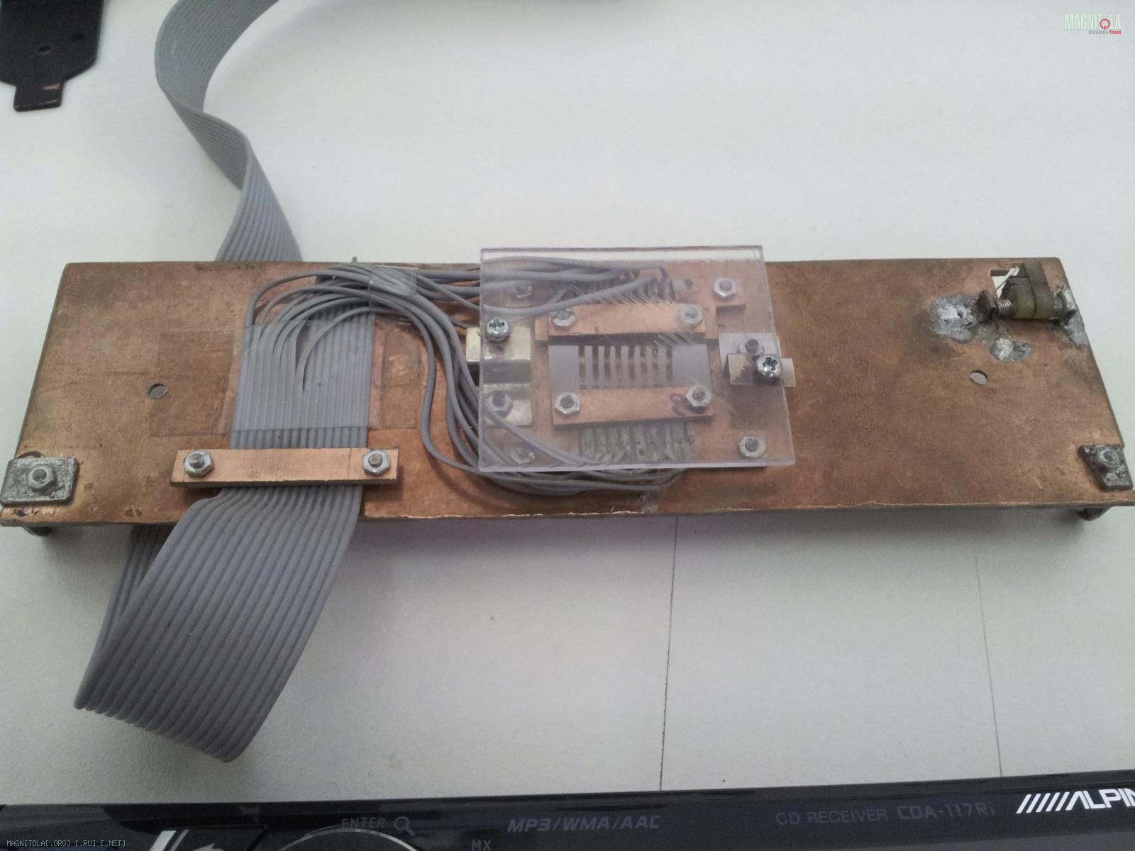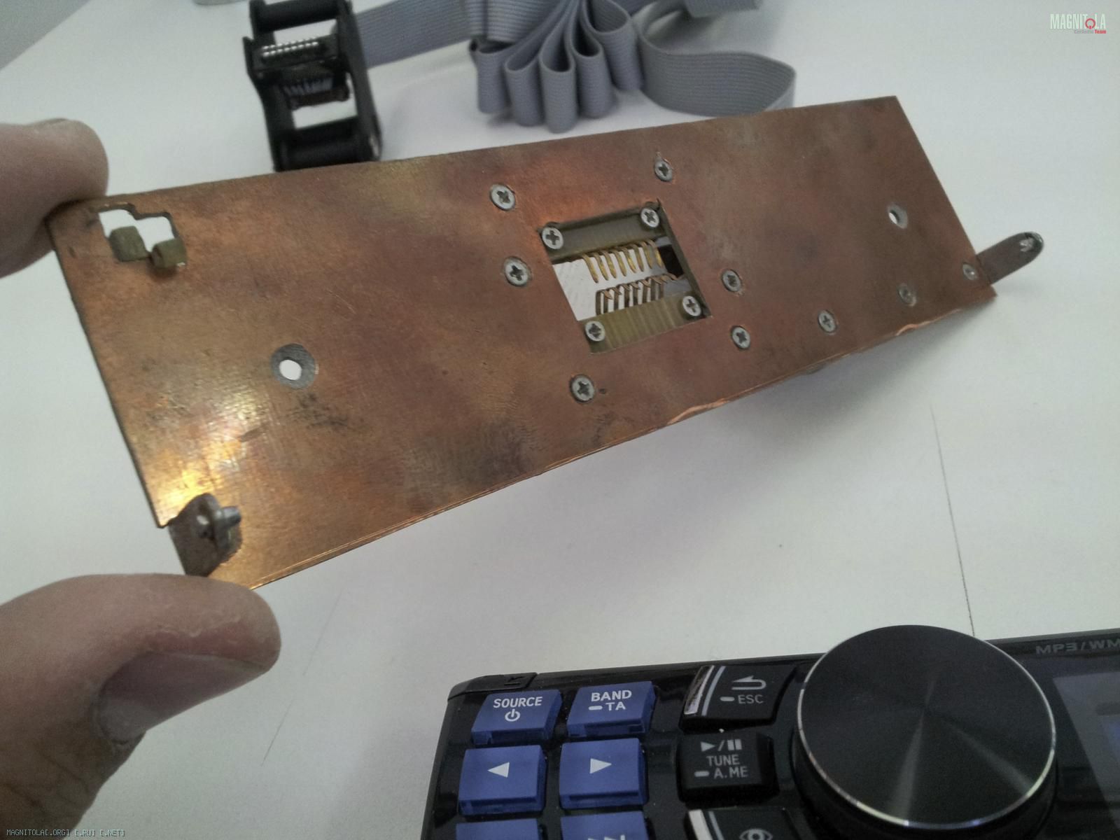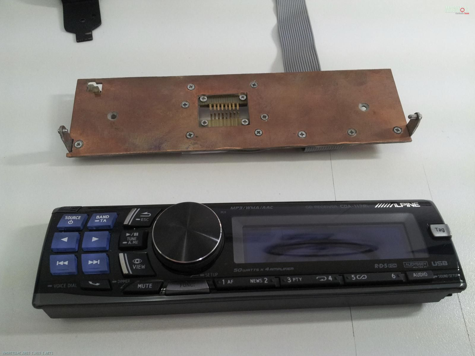 Теперь решаем как отделить панель. Можно было бы пойти известным путем- разобрать все, впаять шлейф и готово. Но легких путей не ищем и любим создавать себе трудности,а также жалко разбирать и перепаивать новое ГУ. Поэтому делаем коннектор-удлинитель по типу папа-мама. Из текстолита и пластика выпиливаем детальки, изготавливаем контактную полоску на 16 контактов которая будет подключатся к ГУ в место подключения панели управления, к не припаиваем шлейф. Все это собираем,стягиваем винтами.Вложение 737244Вложение 737246Вложение 737248Вложение 737250 Контактная колодка откидывается на шарнире открывая доступ для загрузки диска,в закрытом положении фиксируется пружинной тягой, тем самым обеспечивается надежный контакт. Проверяем, красим.Вложение 737252Вложение 737254Вложение 737256Вложение 737258