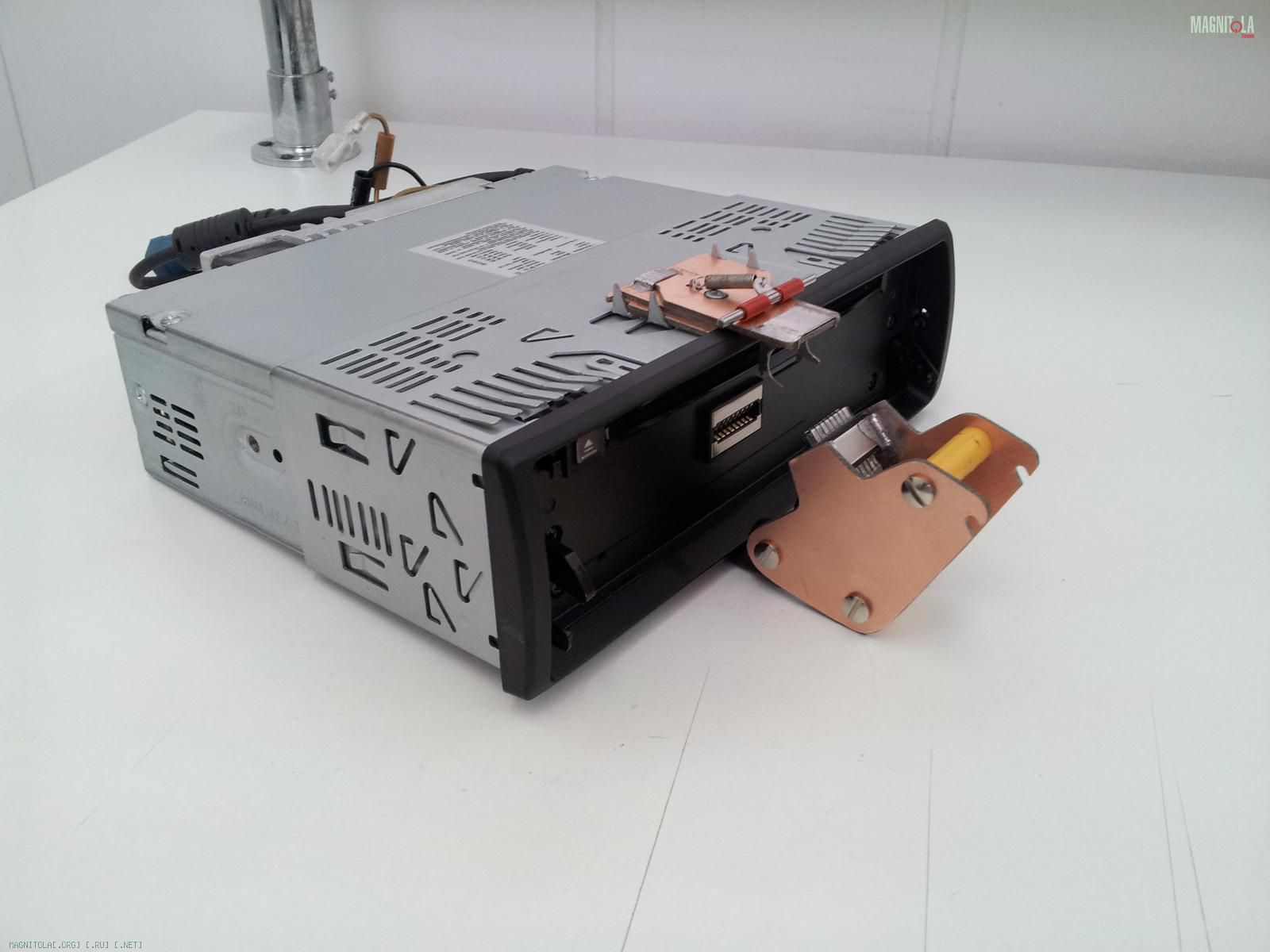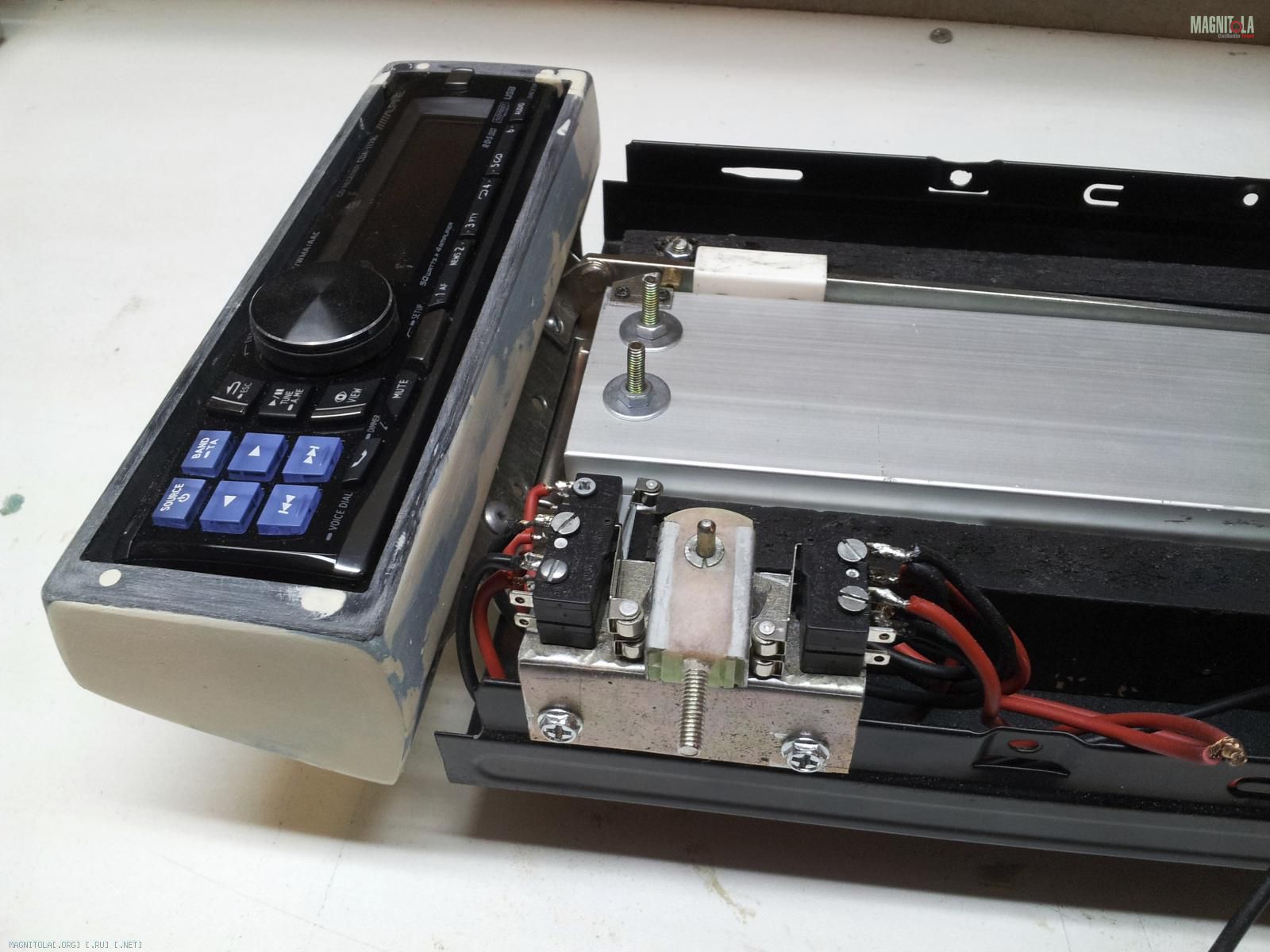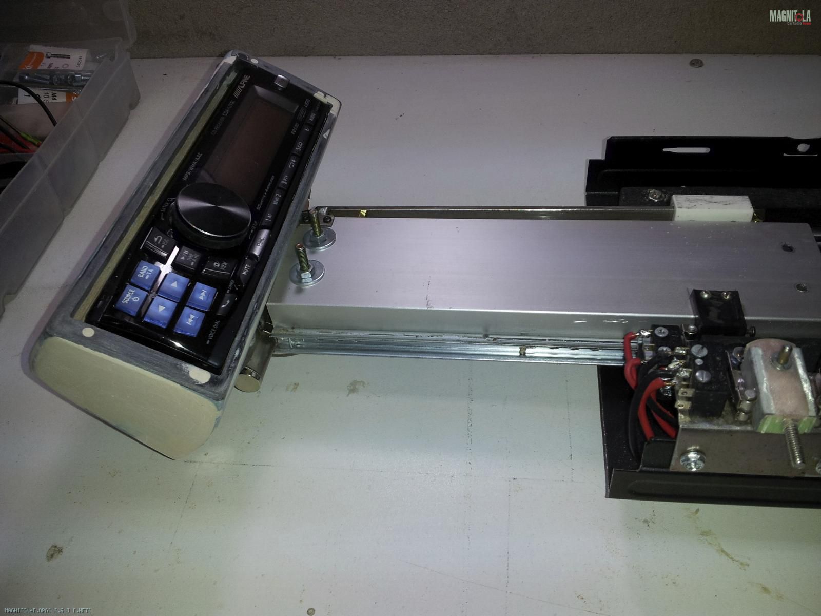 Теперь решаем как отделить панель. Можно было бы пойти известным путем- разобрать все, впаять шлейф и готово. Но легких путей не ищем и любим создавать себе трудности,а также жалко разбирать и перепаивать новое ГУ. Поэтому делаем коннектор-удлинитель по типу папа-мама. Из текстолита и пластика выпиливаем детальки, изготавливаем контактную полоску на 16 контактов которая будет подключатся к ГУ в место подключения панели управления, к не припаиваем шлейф. Все это собираем,стягиваем винтами.Вложение 737244Вложение 737246Вложение 737248Вложение 737250 Контактная колодка откидывается на шарнире открывая доступ для загрузки диска,в закрытом положении фиксируется пружинной тягой, тем самым обеспечивается надежный контакт. Проверяем, красим.Вложение 737252Вложение 737254Вложение 737256Вложение 737258