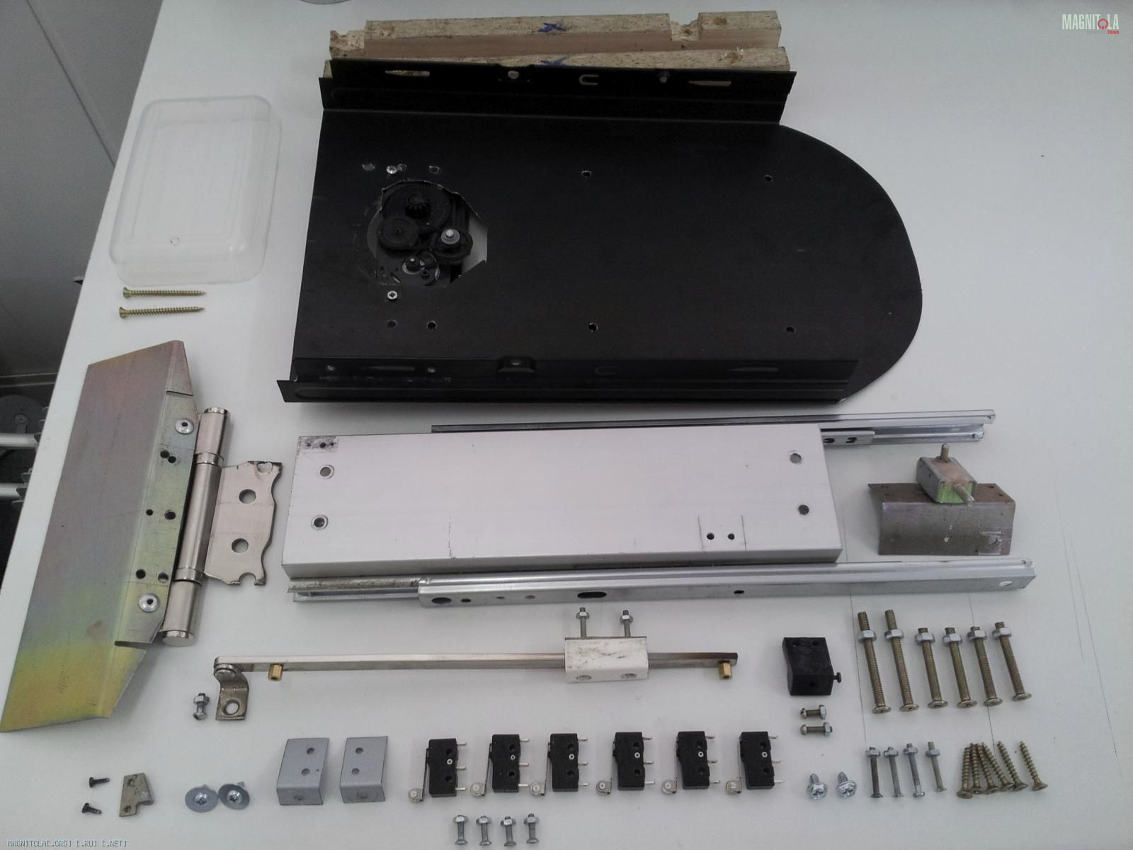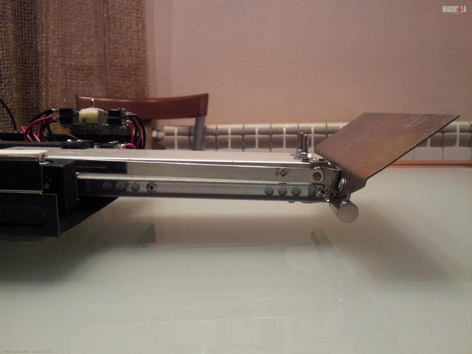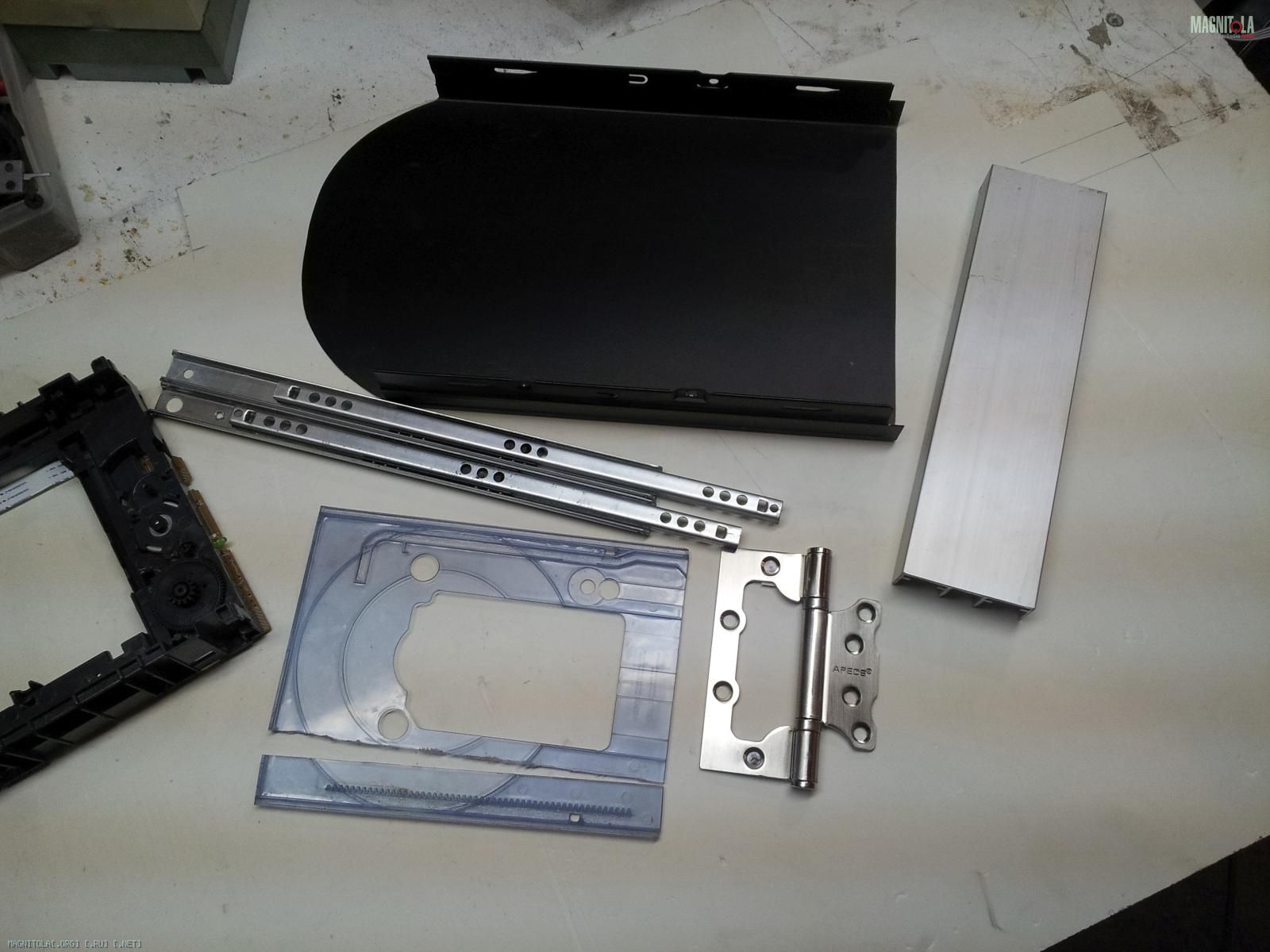 Теперь очередь подлокотника. По замыслу панель должна выдвигаться в рабочее состояние из торца подлокотника.Для дна корпуса подошла по размеру деталь системного блока(её крышка),салазки взял мебельные, у них мягкий ход и отсутствие люфта. Привод-электромотор со шкивами и пассиками-от CD ROMa, оттуда зубчатая рейка.К отрезку алюминиевого профиля крепятся салазки и зубчатая рейка.К не же с торца крепится шарнир(дверная петля) на которой будет крепится металлическая планка с панелью упраления. Плюс тяга которая ставит панель управления в рабочее положение под нужным углом.Плюс концевики, провода, детали от старого видеомагнитофона для рычага управления. Получилась такая кучка деталей.Вложение 737512Вложение 737514