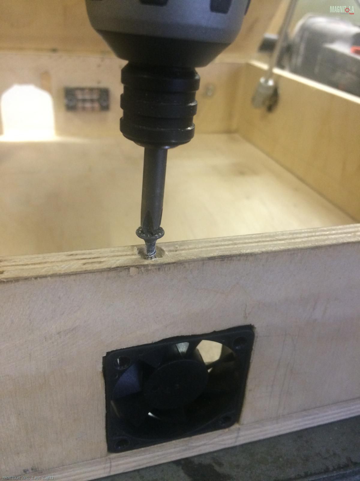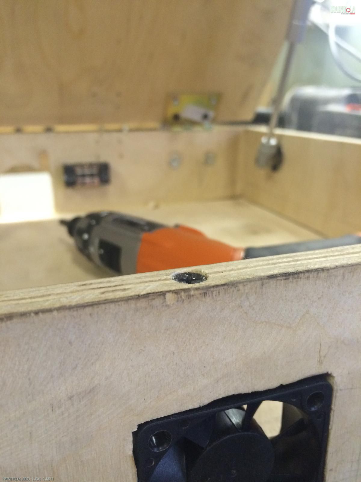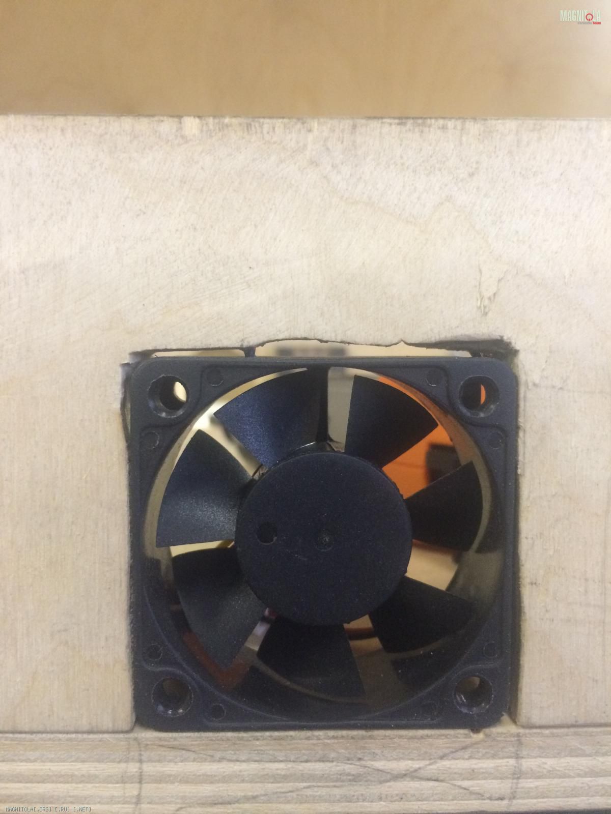 Также решил переделать способ крепления вентиляторов, так как узел это не всегда надежный, всетаки нужно предусмотреть вариант их легкого снятия и замены, вырубил ранее сделанные фаски под посадку вентиляторов, и посадил вентилятор в проем, для фиксации сверху пробурил канал для шурупа, думаю вполне оптимально, сажать вентики буду на жидкие гвозди.