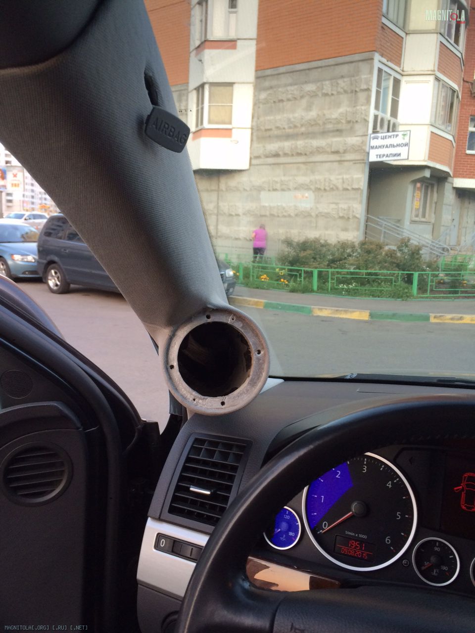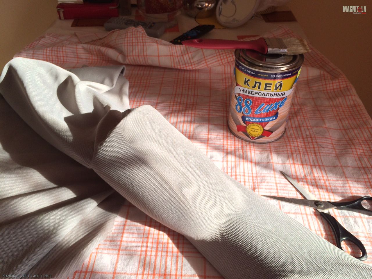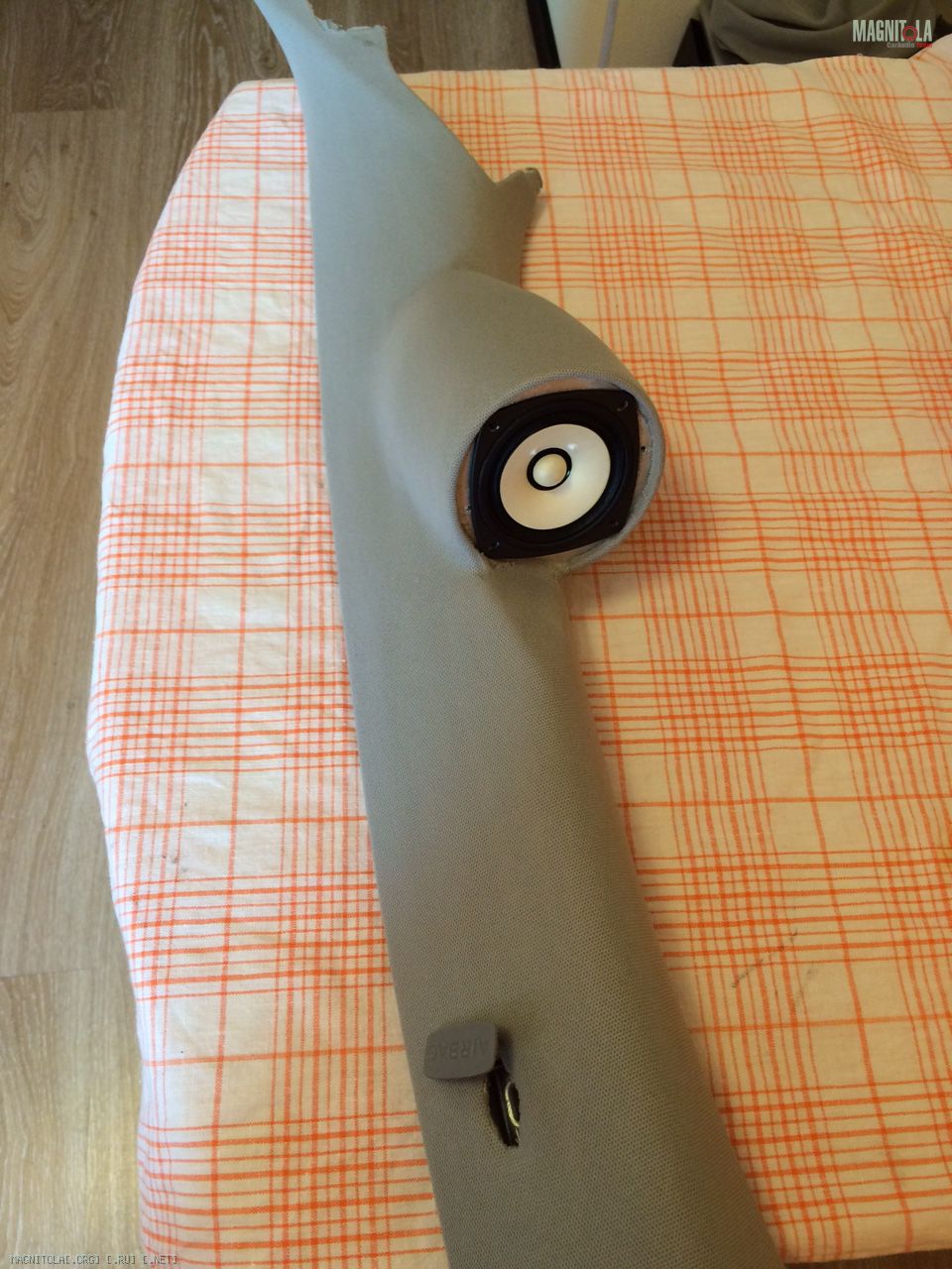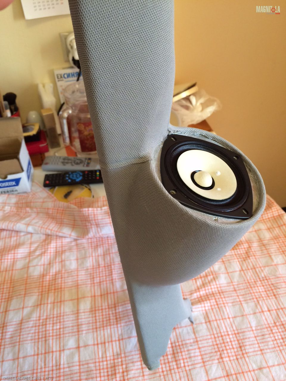 Покрасил стойку краской из балончика, но ткань оказалась настолько просвечивающей, что сквозь нее была видна разница между краской на шпакле и пластике стойки (оттенки разные). Может краску надо было брать нормальную, а не из баллона. В общем тянул в 2 слоя. Первый был тренировочным и это не помешало. Нужен вагончик терпения, одно лишнее движение и клей пропитывает ткань оставляя пятно. Тянется ткань очень хорошо, но на втором слое все же пришлось смириться с мыслью, что без шва обтянуть я не смогу. Я просто не понимаю как от широкого места (подиум со стороны динамика) перейти к значительно более узкому без складок. Доделал как мог и решил отдать мастерам на перетяжку.