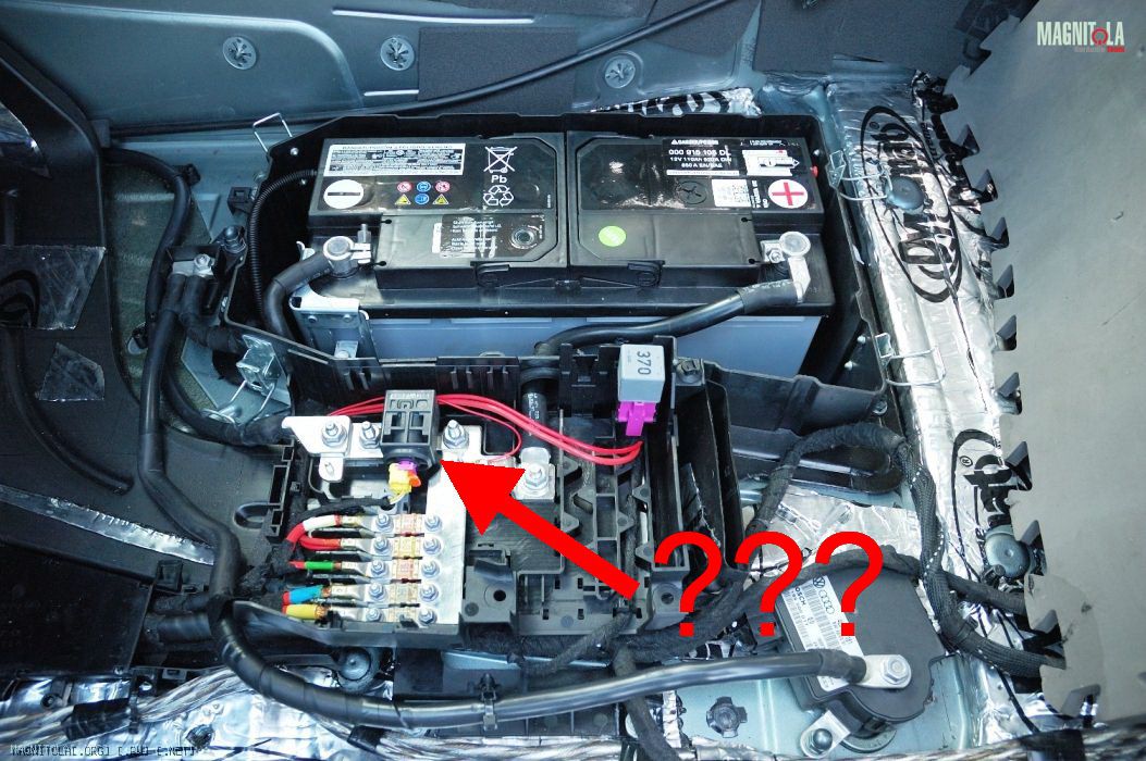 Я, кстати, долго решал, куда прицепить минус: на верхний болт реле контроля электросистемы (справа внизу коробочка с гайкой сверху), или на его основание (т.е, на кузов). Соображения у меня были такие - в этом реле токовый датчик, если я цепляюсь на верхний болт, т.е. напрямую к АКБ, то система не видит тока, потребляемого аудиосистемой, т.к. токовый датчик обходится Ну, и резьбы для второго наконечника там мало. Если цепляюсь на кузов, то все работает штатно, все электричество мониторится. Ну, и на кузов реле крепится двумя гайками, то бишь контакт обеспечивается в двух местах, резьба длиннее и минус для аудио прикрутить легче.