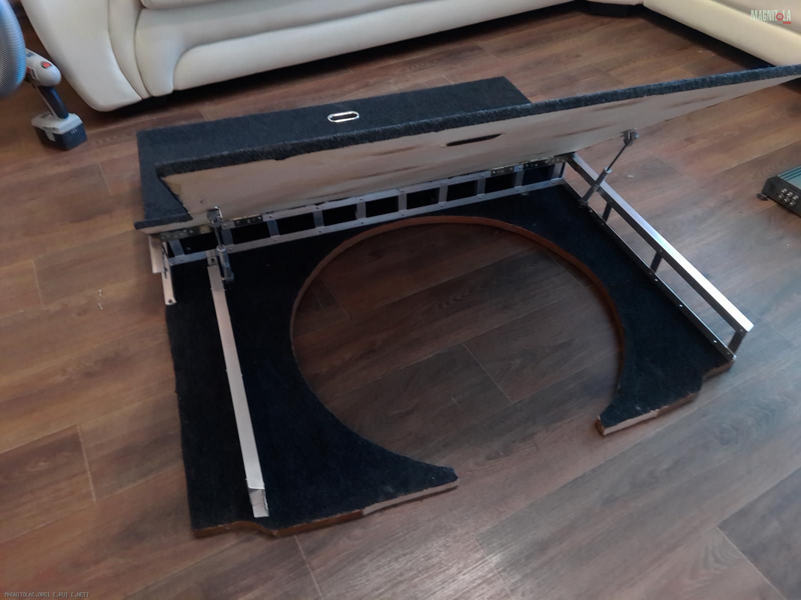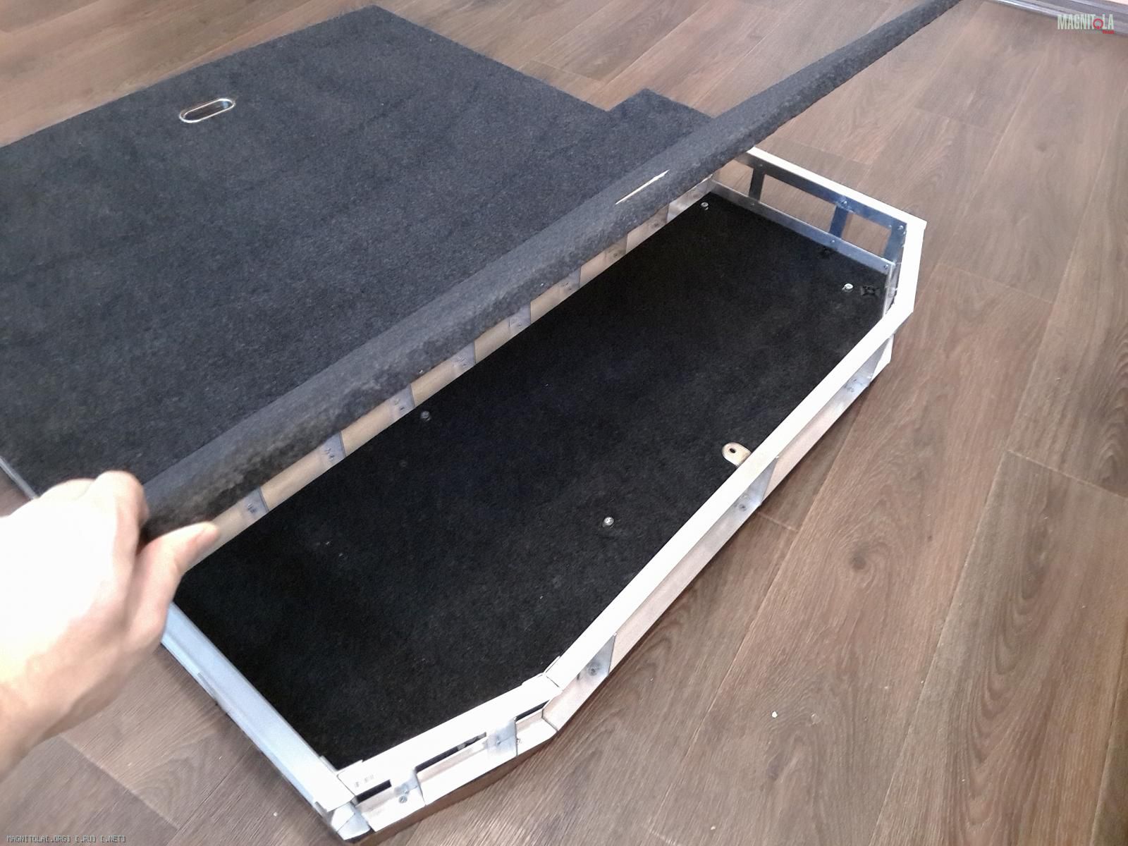 Почти доделал фальшпол. Основной крышке пока не хватает магнита и пару опорных поперечин из уголка. Сделаем чуть позже, без музыки ездить не айс