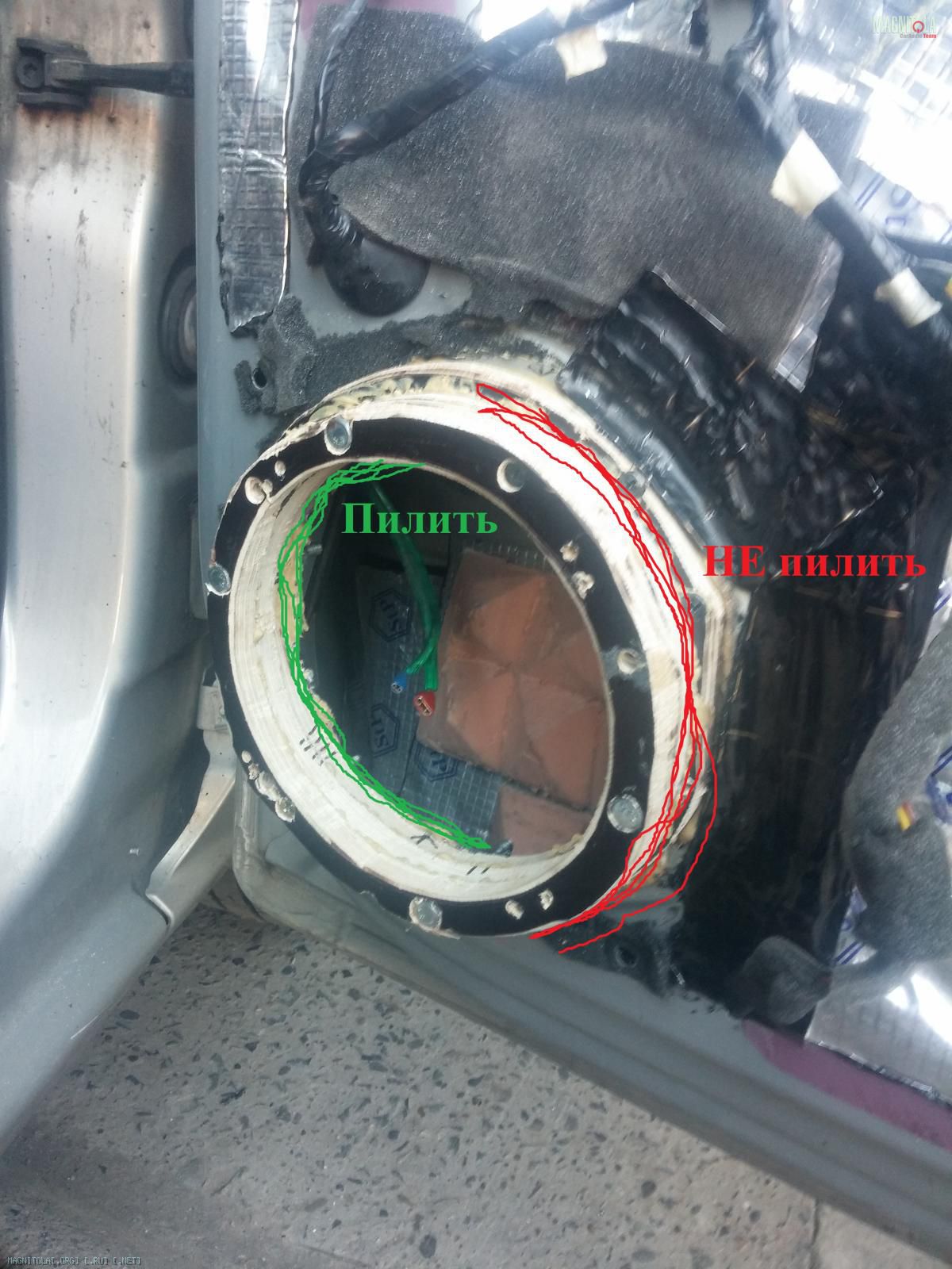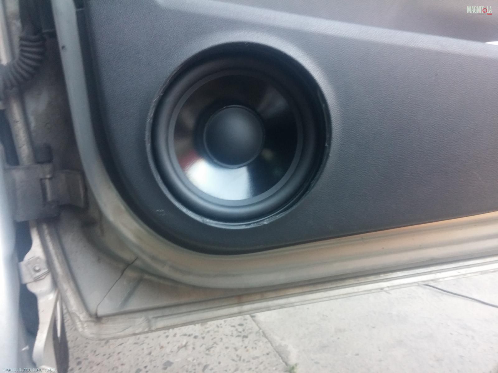 Динамики установлены на фанерной проставке 24мм, отверстие в металле двери расширено до 6,5", штатные пластиковые сетки удалены.