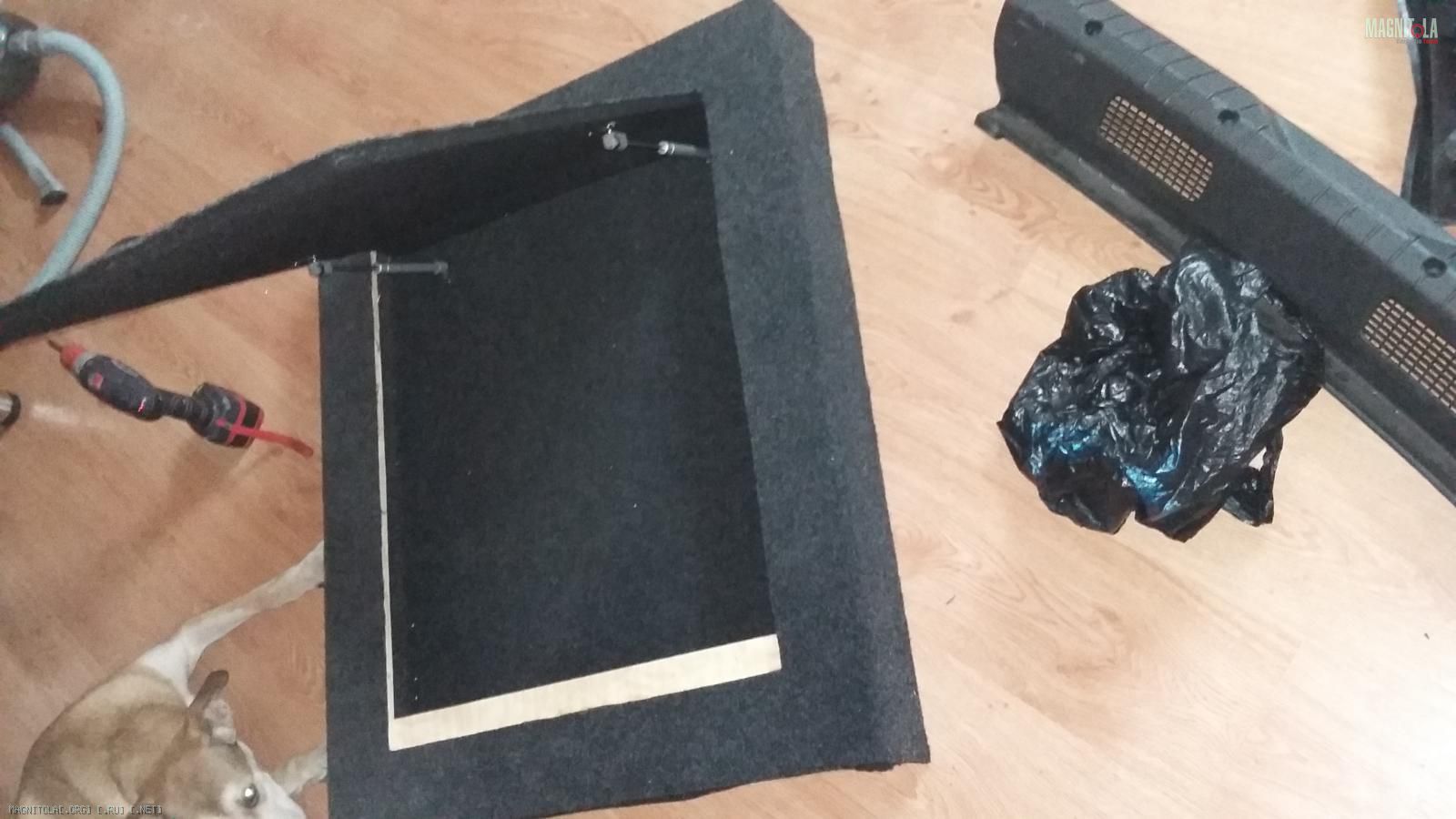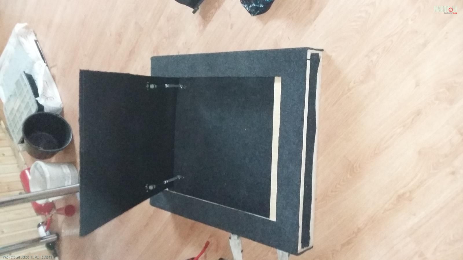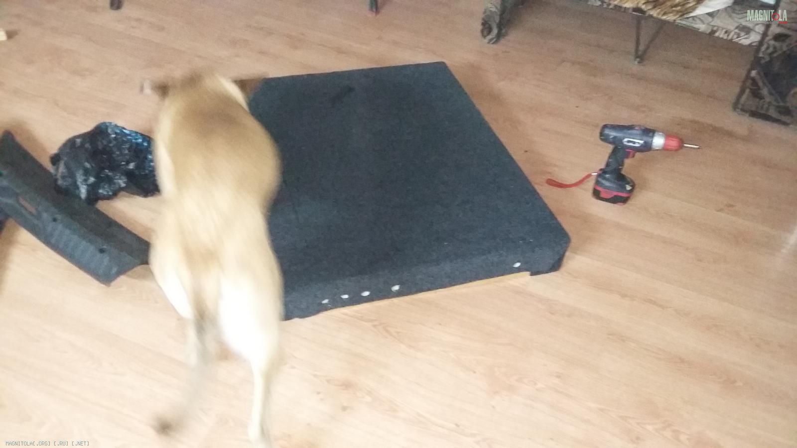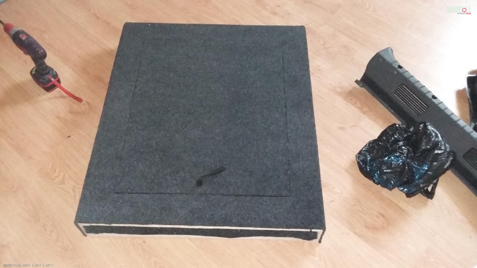 выпилил подиум из 18мм фанеры, раньше два криво выпиленных кольца стояли по 10 мм, поставил и заклеил технологическое окно в двери шумофф бас