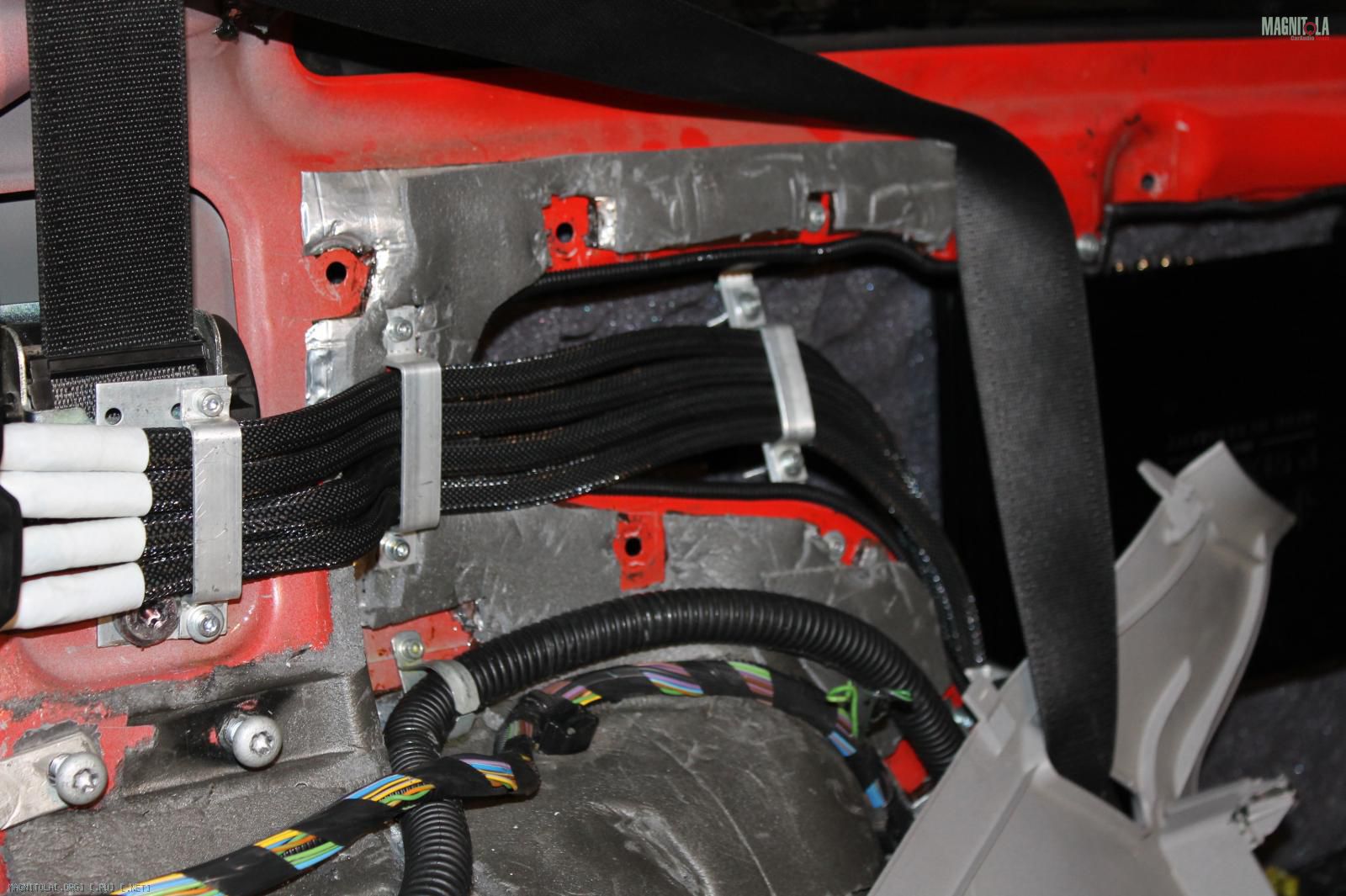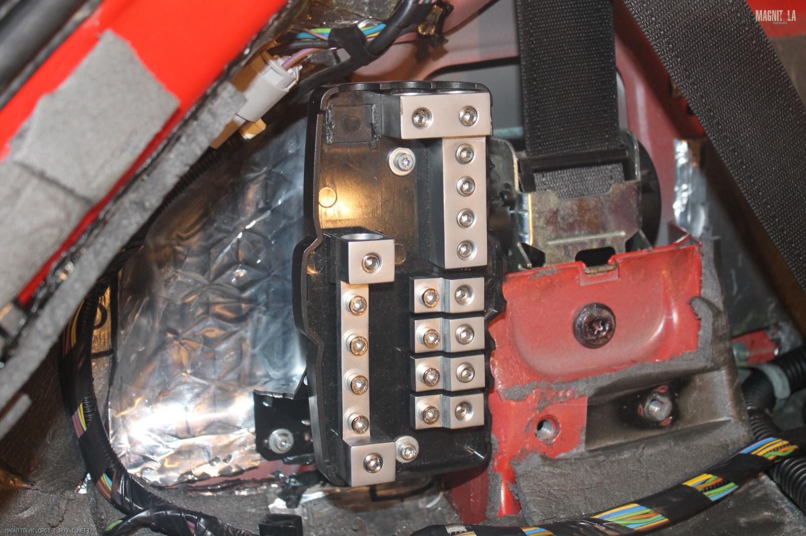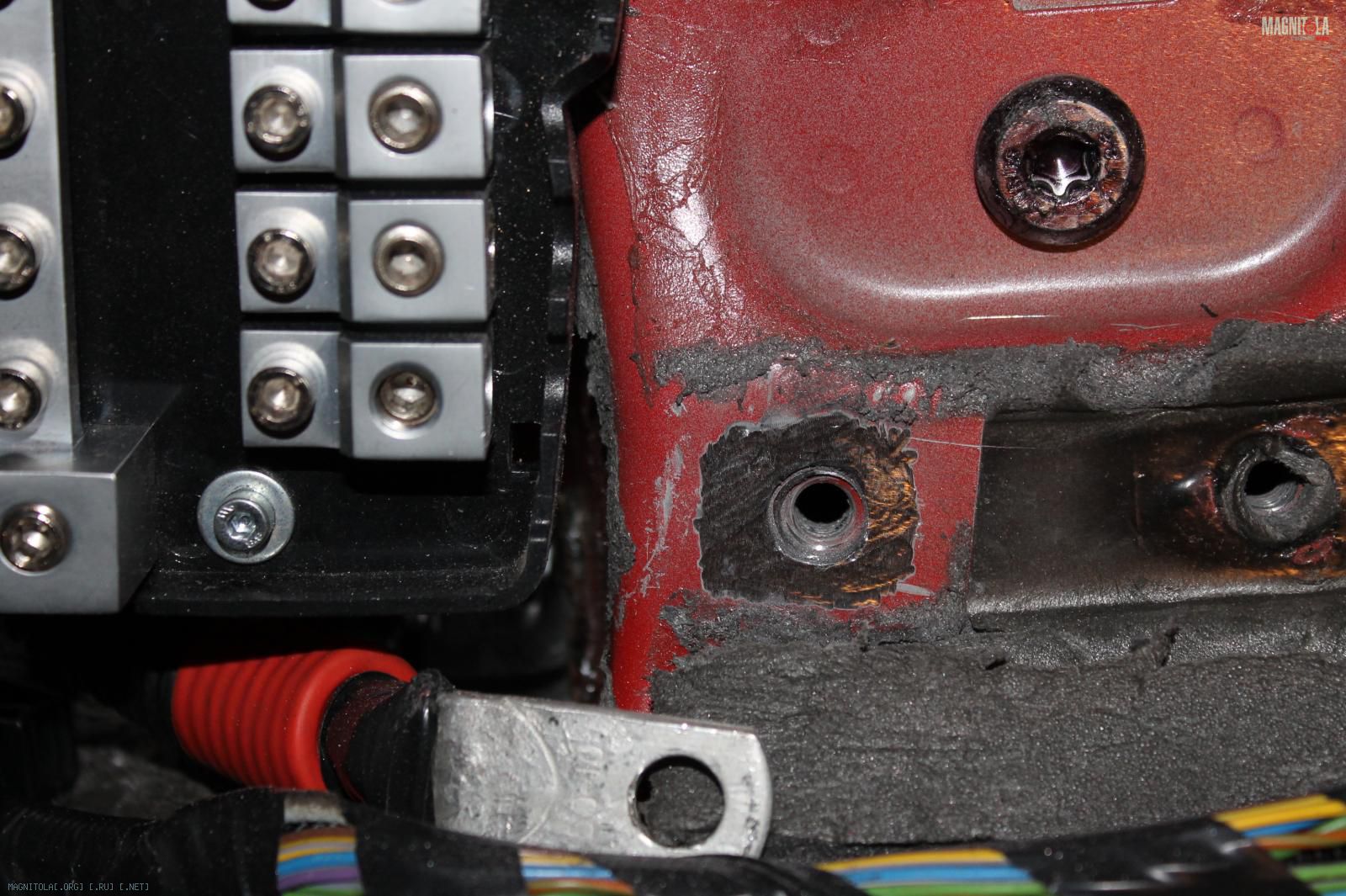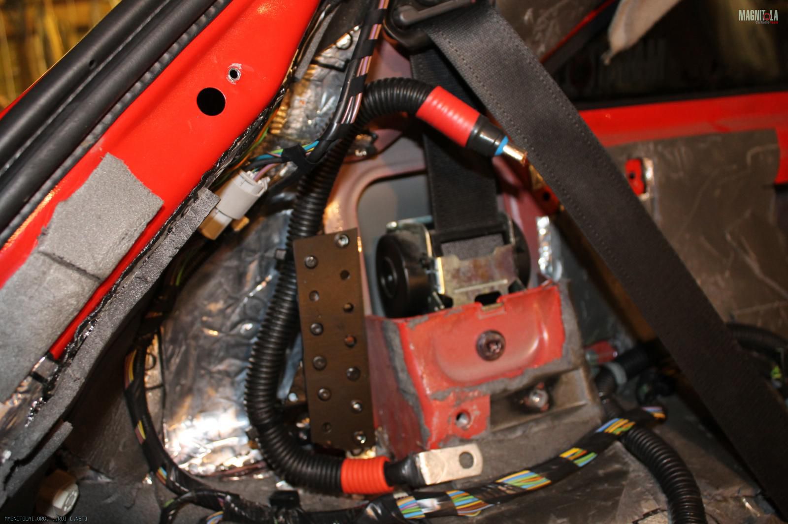Справа от дистра вы видите 1 большой винт, который держат бабину с ремнем безопасности и ниже еще 2 отверстия, там висит крюк-фиксатор, который держат задние спинки. Именно к одному такому болту и коннектим минус!