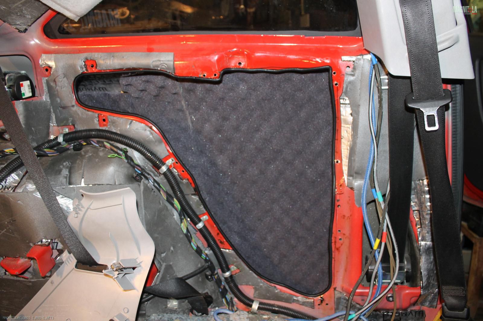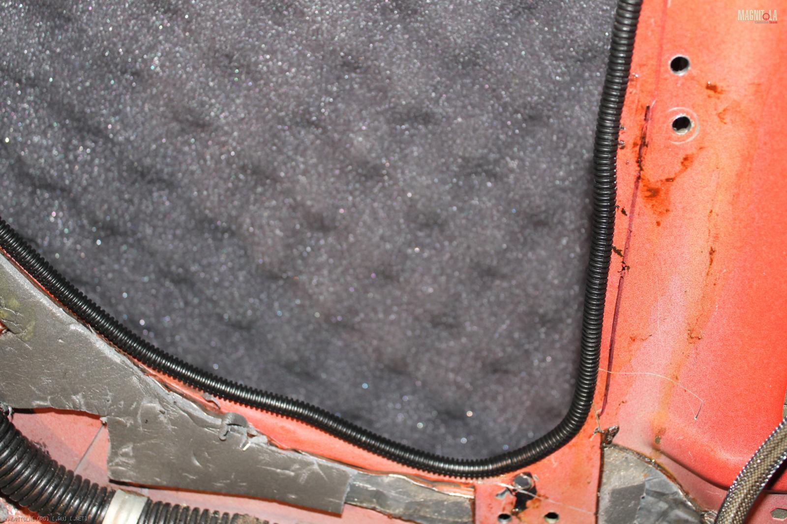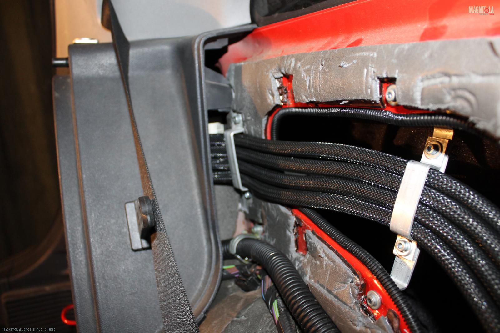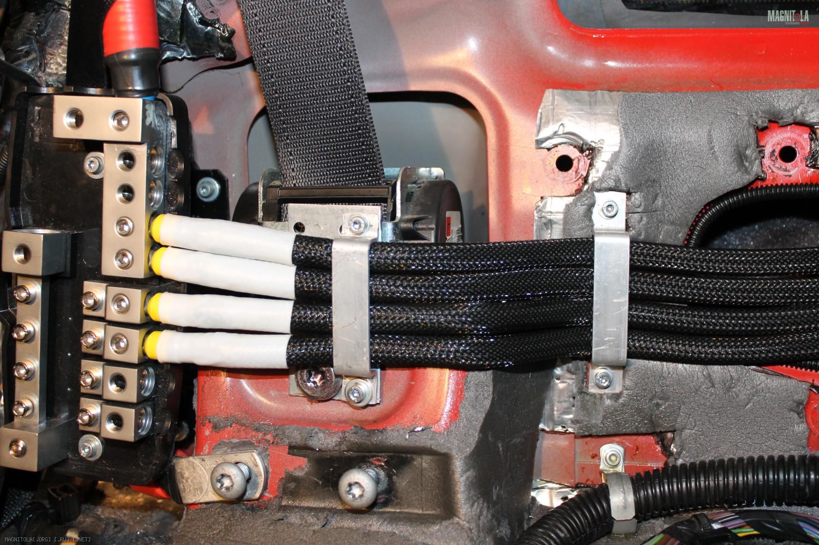 Справа от дистра вы видите 1 большой винт, который держат бабину с ремнем безопасности и ниже еще 2 отверстия, там висит крюк-фиксатор, который держат задние спинки. Именно к одному такому болту и коннектим минус!