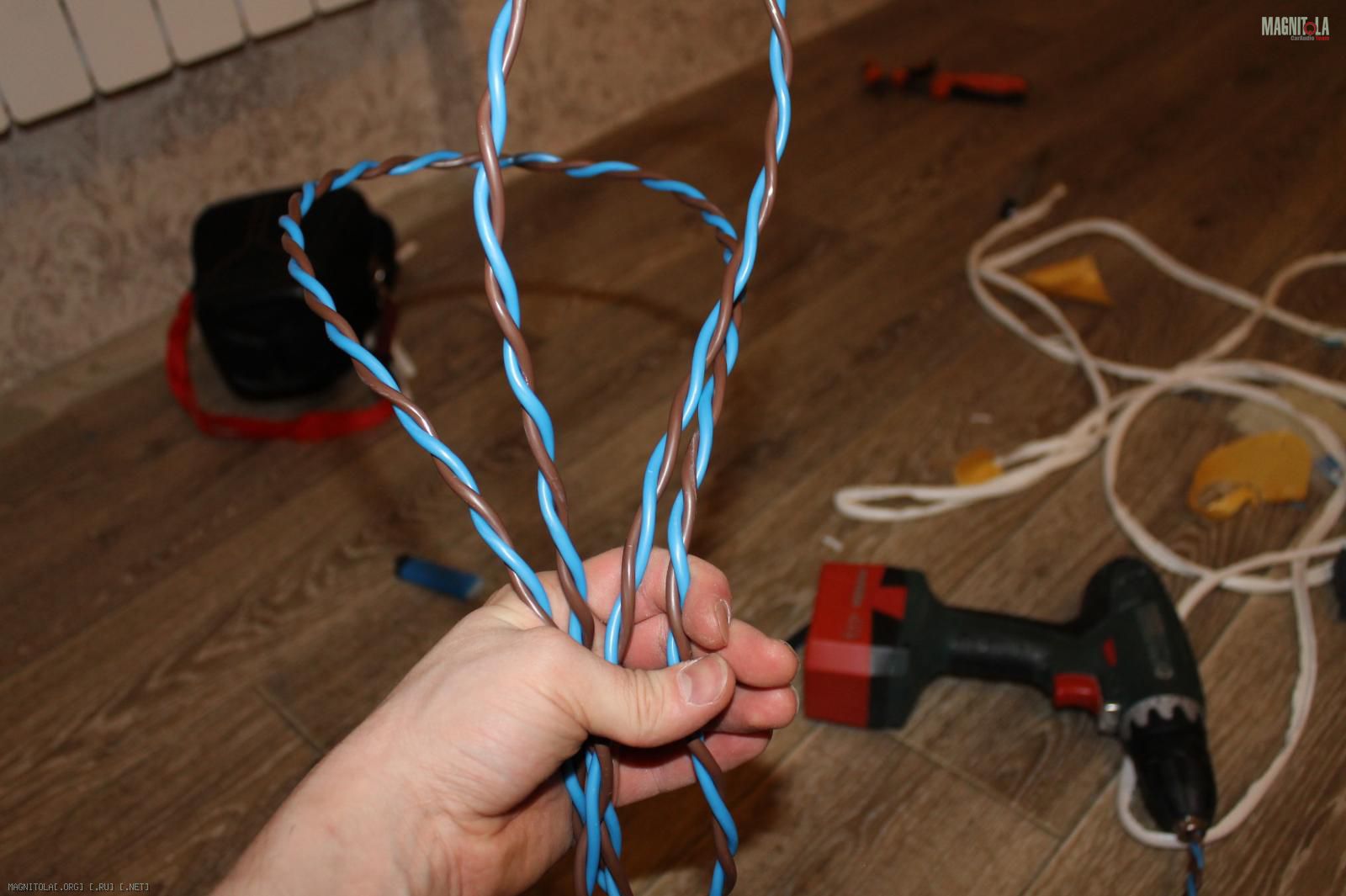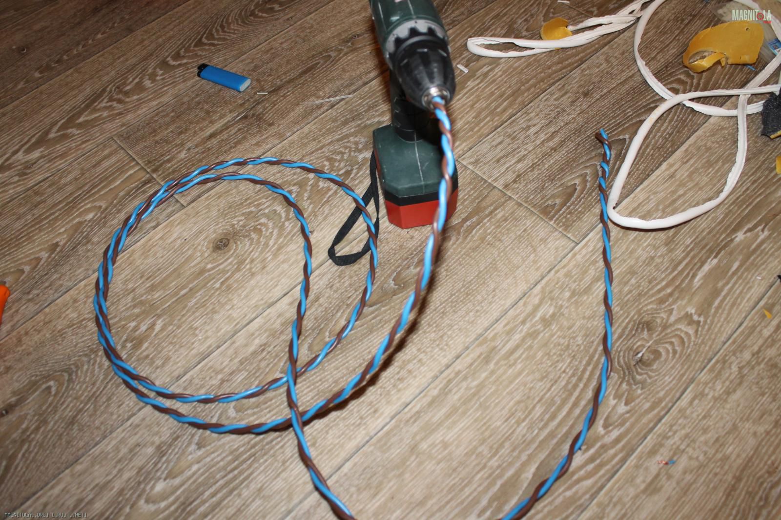 На трёх метрах провода изоляцию я снимал наверное пол часа, плюясь и матерясь. Реально дубовая, надрезать и тянуть провод не получается, приходилось аккуратно резать по всей длине! Дальше шуруповертом сплетаем в косу: