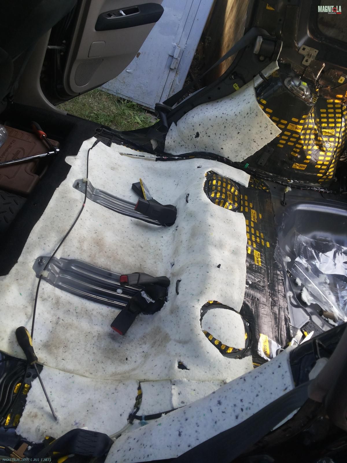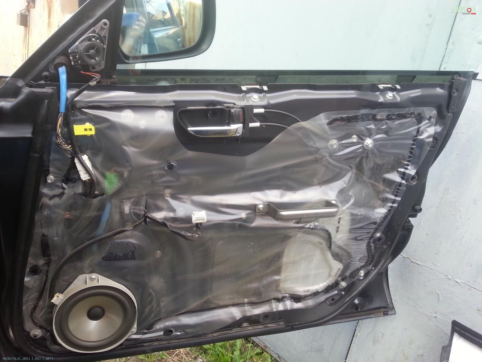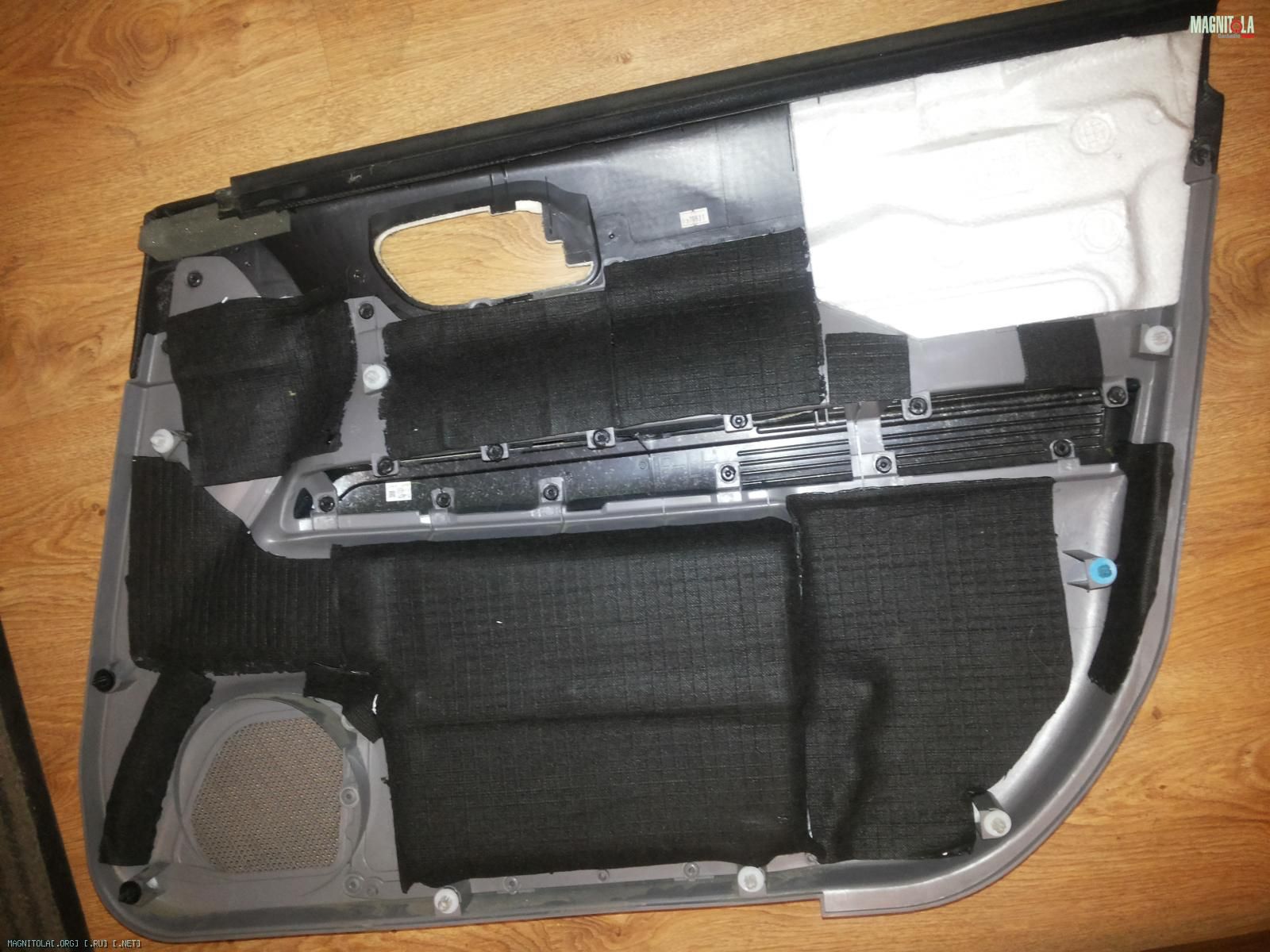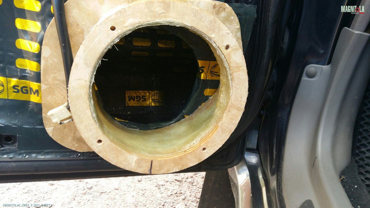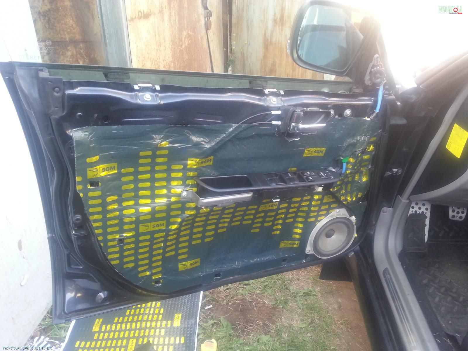 -пенка дверей заклеена SGM Вибро М3 внахлест, тем самым создав импровизированные ребра жесткости. Место за динамиком, поверх SGM Вибро М3, дополнительно проклеено листом 35*35 SGM вибро БМФ