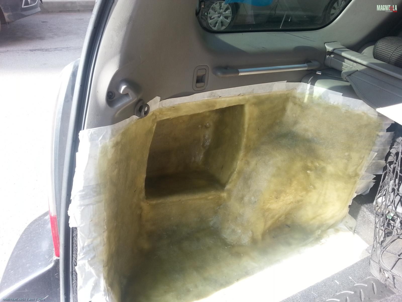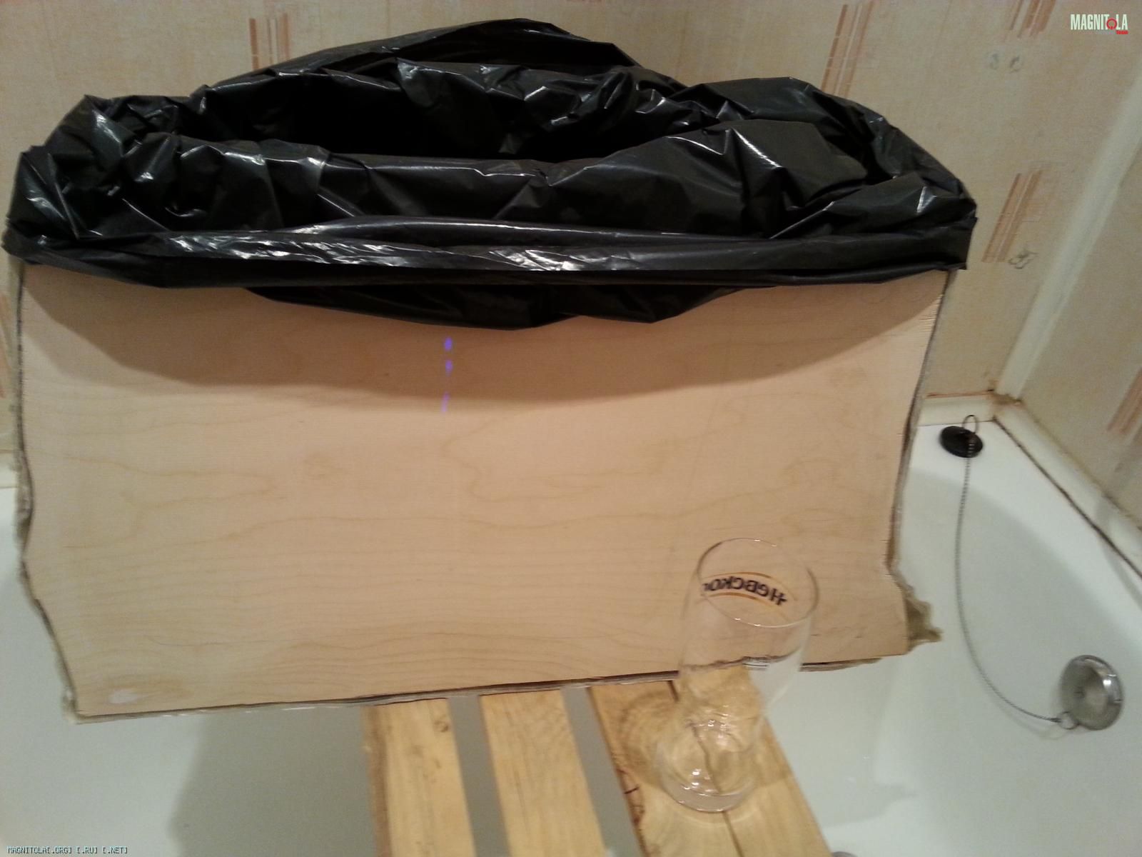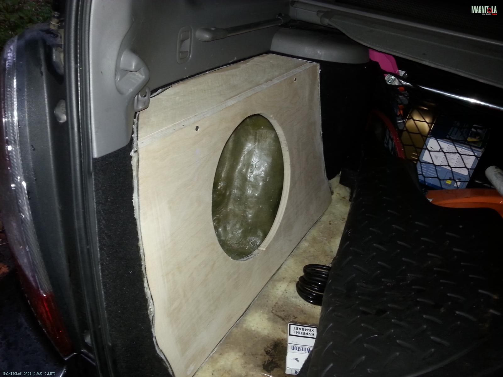далее фанерные панели 18мм, замерен объем мерным стаканом, вышло 27 литров. Стыки пролиты герметиком, весь короб изнутри проклеен виброй в 2 слоя.