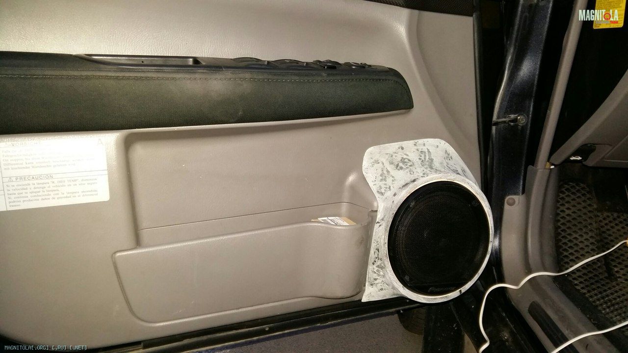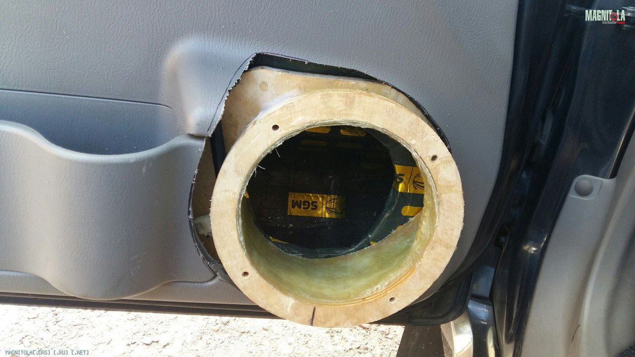 Основание подиума прикручено к двери с помощью 4 винтов М5. Стенки подиума из 150 стекломата в 3 слоя, дополнительно проклеяны виброй на основе тряпки (правильное название не помню). Внутренний подиум получился с доворотом на ручку КПП, с расширением к основанию для избежания "Тонельного" эффекта. Главным плюсом вижу сохранение дверного кармашка)))
