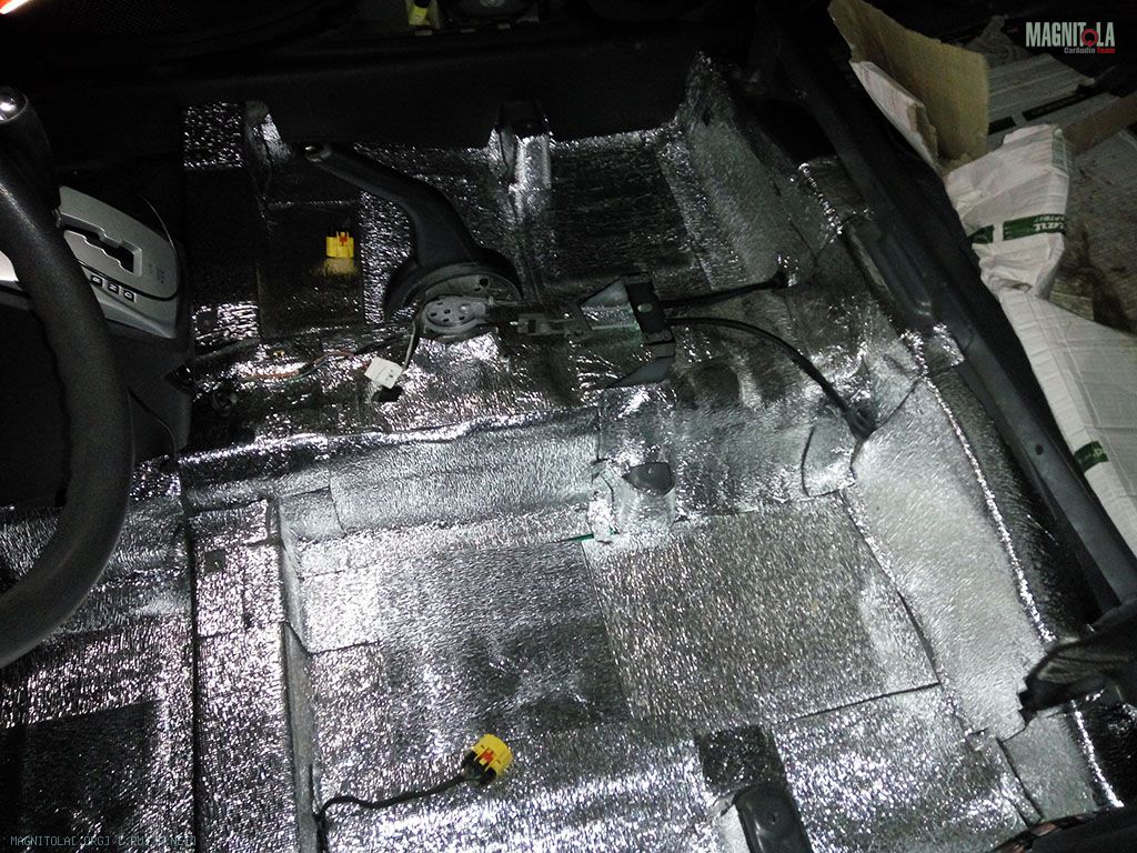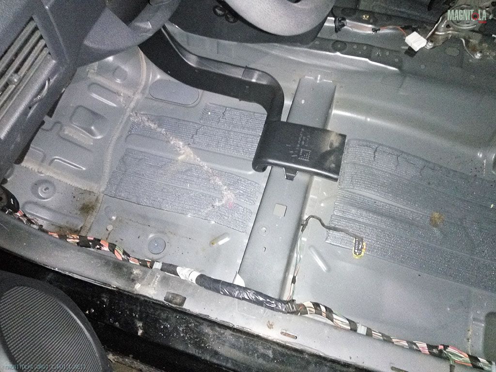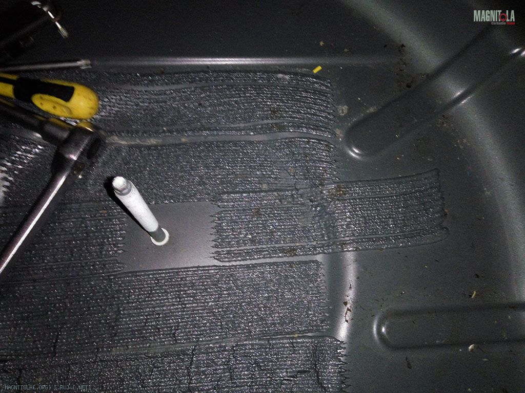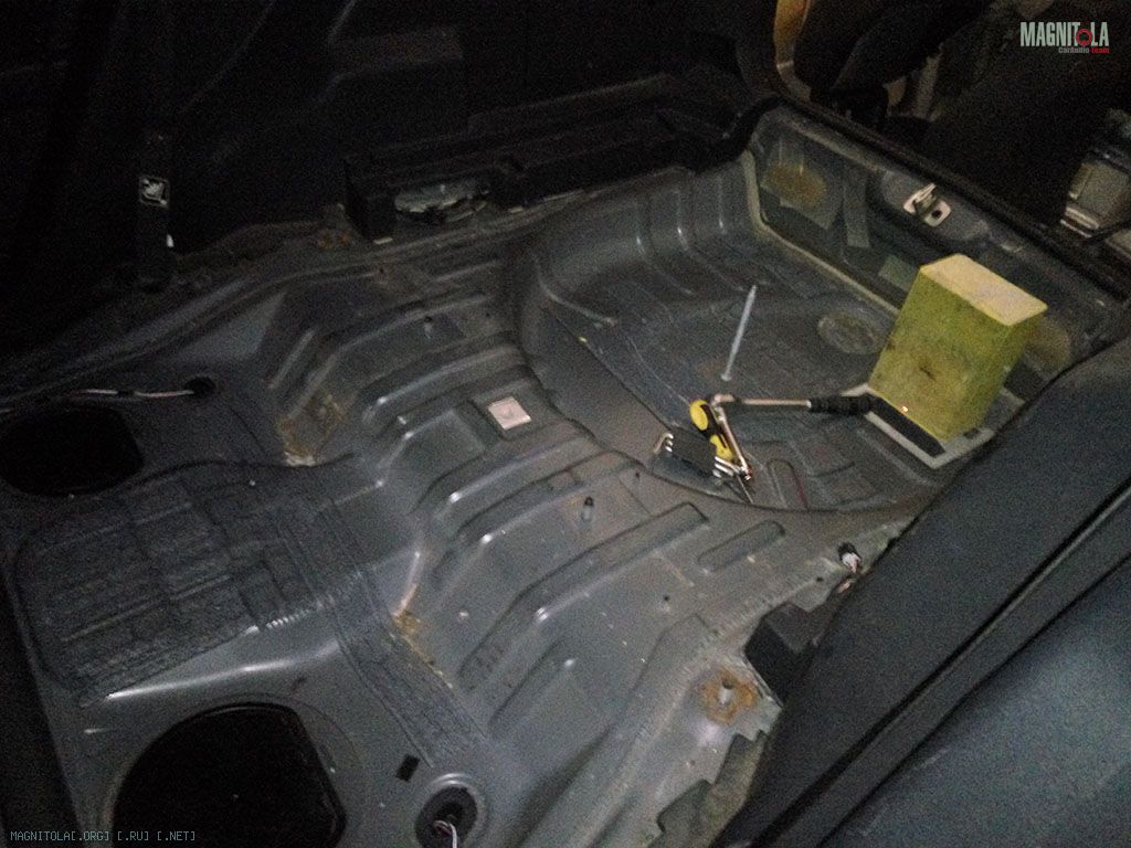 Результатом очень доволен, пол глухой, почти как бетонная плита на полу гаража. Хотел прокинуть силу от аккумулятора в салон, но неожиданно выяснил что штатный жгут идет в крыле. Сверлить дырку уже не стал, решил что на сегодня достаточно.