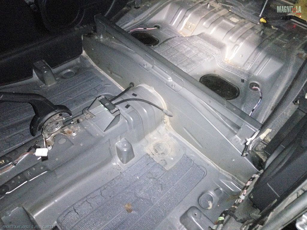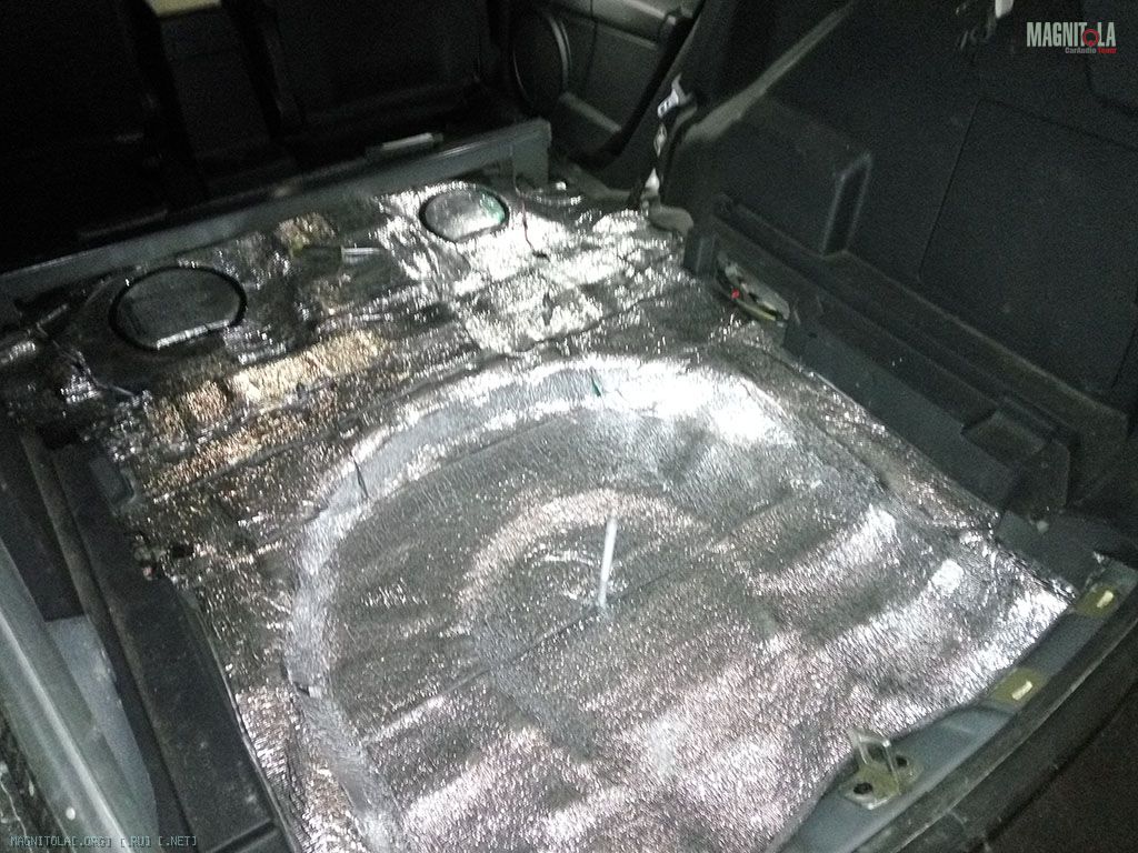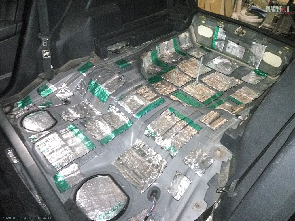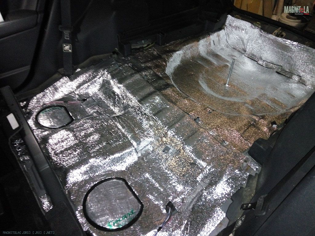 Результатом очень доволен, пол глухой, почти как бетонная плита на полу гаража. Хотел прокинуть силу от аккумулятора в салон, но неожиданно выяснил что штатный жгут идет в крыле. Сверлить дырку уже не стал, решил что на сегодня достаточно.