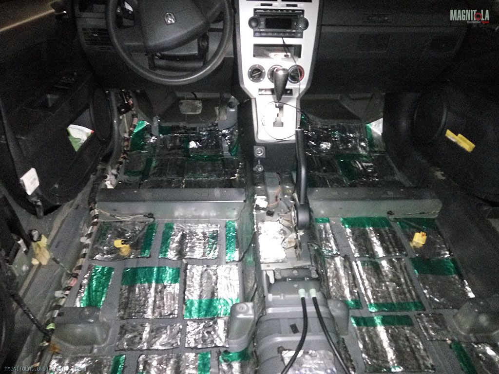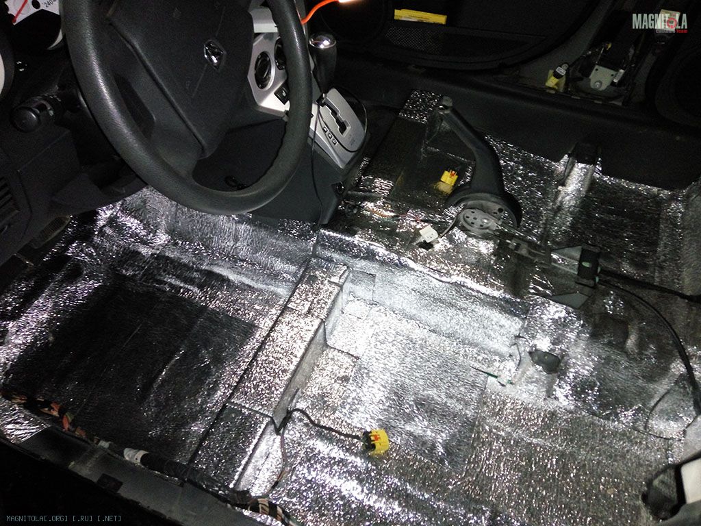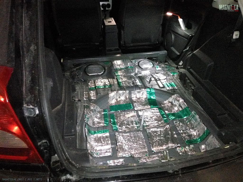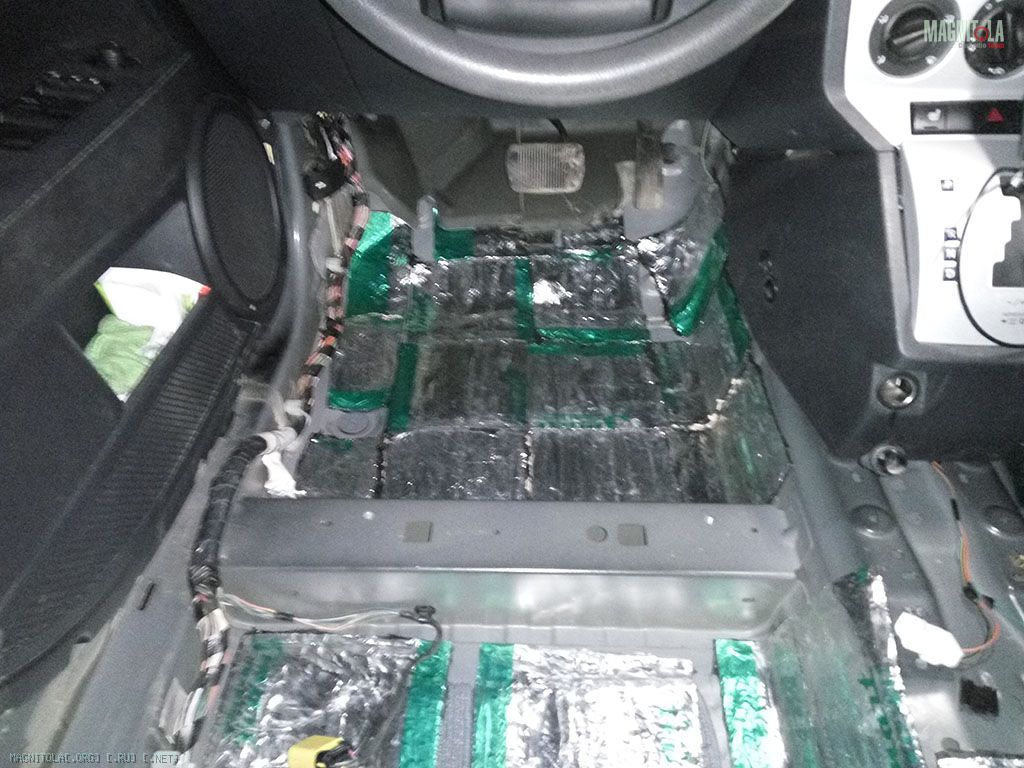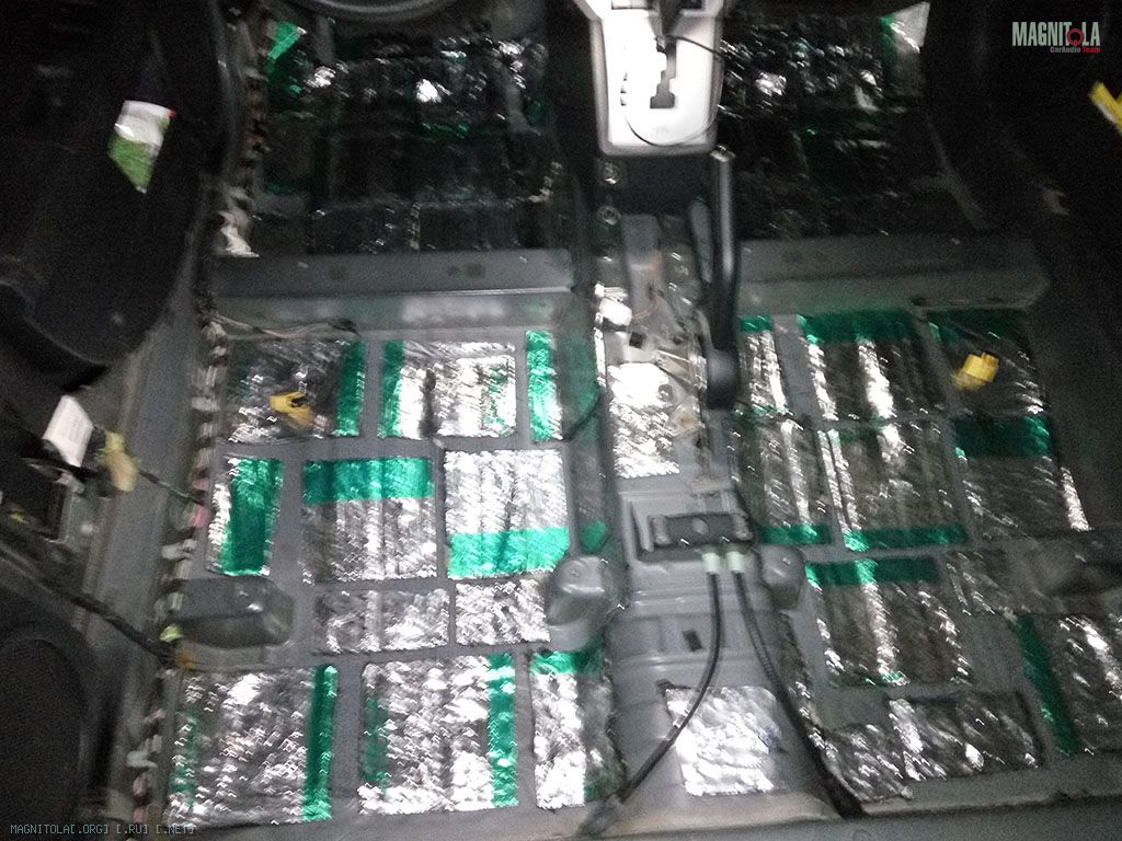 Собственно залез я в аппарат с обогревателем и феном и начал лепить смартмат фаворит 40 куда ни попадя. В смысле по листу под ноги передних сидений и по листу под сидения первого и ноги второго ряда. Спереди решил жестко залепить по максимуму, преследуя прежде всего защиту от текущей с ног воды. На втором ряду ездят редко смысла лепить вибру сплошным слоем не вижу.