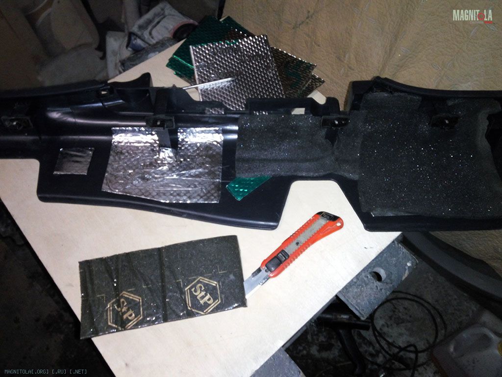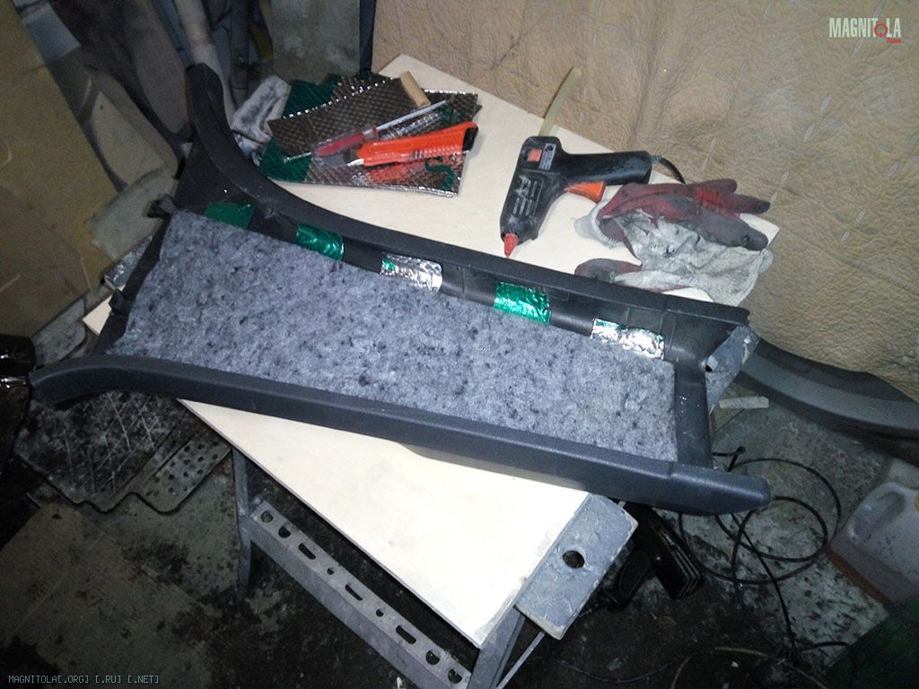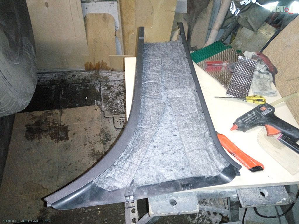 Занялся салонными пластмассками, которые каким то чудом уцелели во время вчерашнего грубого надругательства над автомобилем. Вибру лепил для очистки совести, пластик вибрить вообще не очень благодарное занятие. Зато постарался по максимуму залепить все шумкой, в местах где сухо – войлоком, там где есть вероятность намокания (пороги) – битопластом. Штатные смешные кусочки… эээ… ну пусть тоже будет войлок – в основном выбросил, оставил два больших куска на облицовке стоек. Войлок от Смартмата с клеевым слоем, пленка отрывается плохо, войлок сильно лохматится по краям, режется только действительно острым ножом: