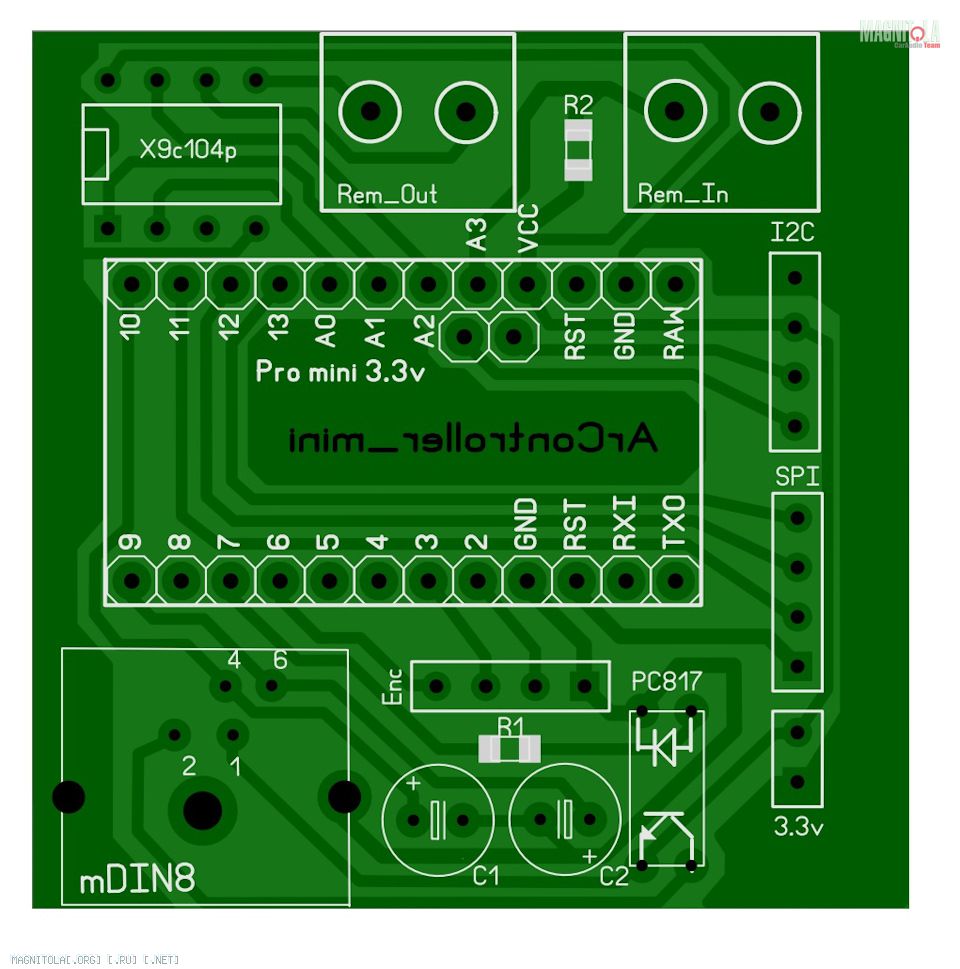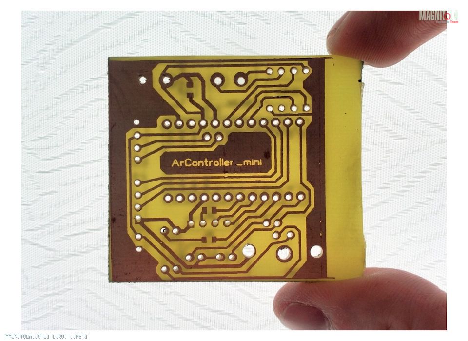 Как видите, ничего сложного в ней нет. Управляет всем микроконтроллер ATmega328P на базе модуля Arduino Pro Mini 3,3V / 8 Mhz. С помощью резистивного делителя со входа Rem_IN снимаются номиналы рулевых кнопок, и резистор R2 подбирается исходя из их средних значений, в моем случае это порядка 330 Ом. Микросхема X9C104P - служит для генерации понятных магнитоле значений сопротивлений на выходе Rem_Out, если нет нужды в проводном управлении магнитолой, то ее можно не распаивать. Разъем miniDIN8 служит для соединения с процессором. Через него же подается питающее контроллер напряжение 3,3V. Пара PWM-выходов контроллера коммутируются с процессором, а оптрон PC817 выполняет роль переключателя MODE. Пара конденсаторов С1, C2 100 мкФ сглаживают импульсы с выхода Arduino на процессор. Токоограничивающий резистор R1 для диода оптопары имеет номинал 100 Ом. За основу платы можно взять макетку но лучше конечно изготовить ее из фольгированного текстолита. Я наносил дорожки по лазерно-утюжной технологии и травил плату в растворе перекиси, поверенной соли и лимонной кислоты.