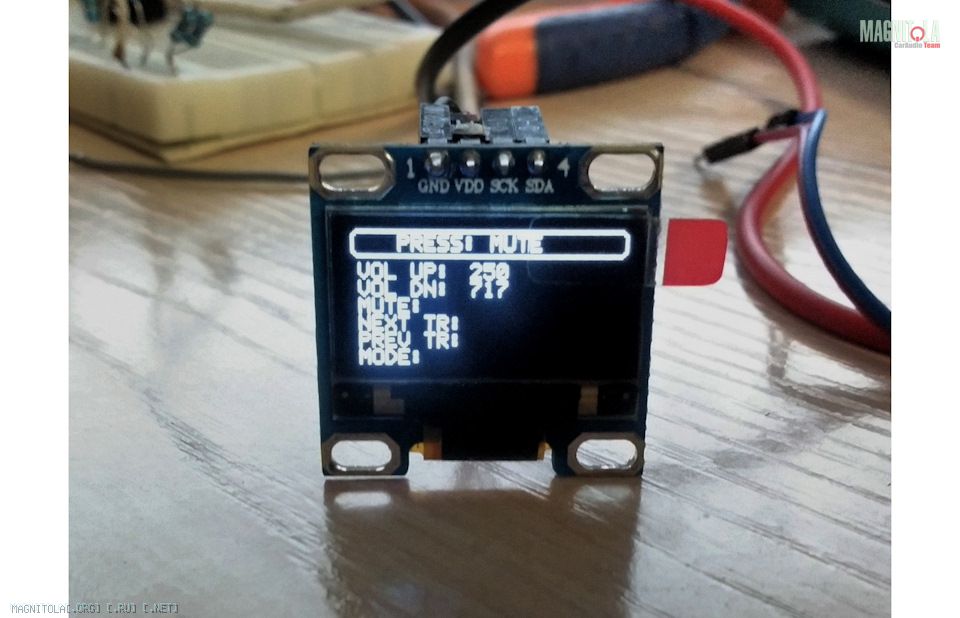 Если вы предполагаете подключать резистивные кнопки, то по месту необходимо провести процедуру обучения контроллера. Подключаем ко входу Rem_In провода от рулевых кнопок и зажимаем кнопку энкодера на время >3 сек. Диод на плате должен сменить свое текущее состояние а на дисплее отобразится предложение нажать необходимую кнопку. Если проводить процедуру без дисплея, то необходимо последовательно нажать кнопки: VOL UP, VOL DOWN, MUTE, NEXT TRACK, PREV TRACK, MODE с интервалом не менее 0,5 сек.