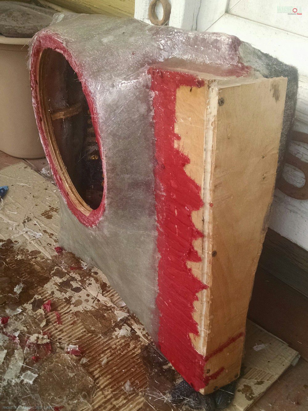 Результат пятидневной лепки передней стенки. Со слоями сбился со счета, но вышло минимум 10 слоев. Все стыки пролиты и замазаны смолой со стекловолокном. Где возможно, укреплял стенки с двух сторон. Исчерпал все запасы 600-го стекломата, в конце пришлось переходить на 300-й.