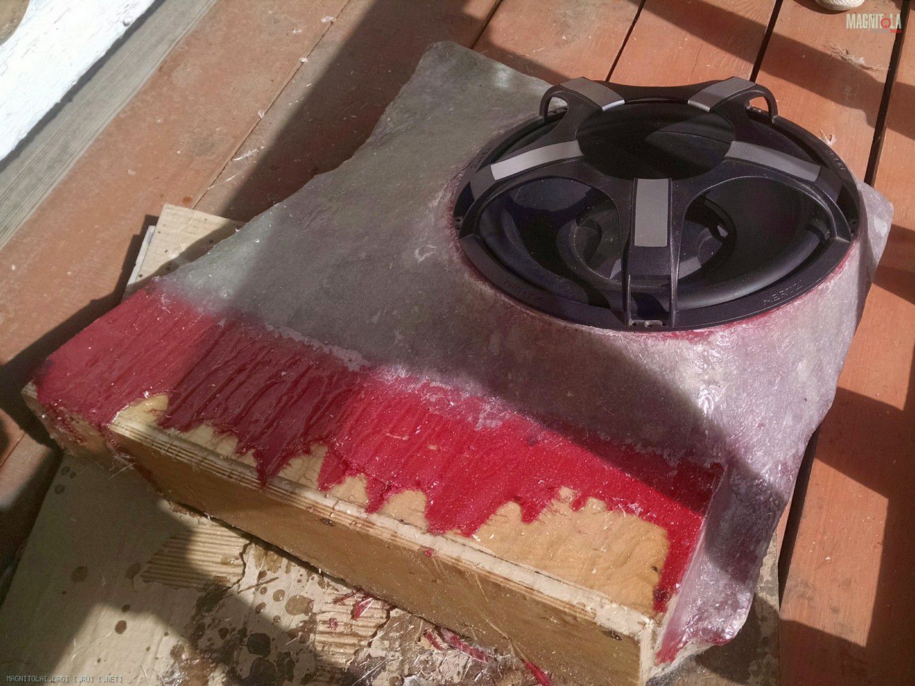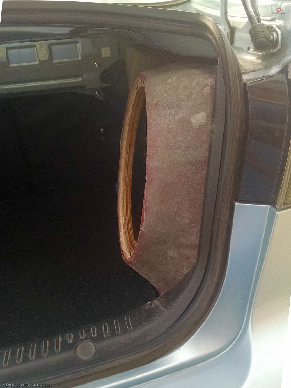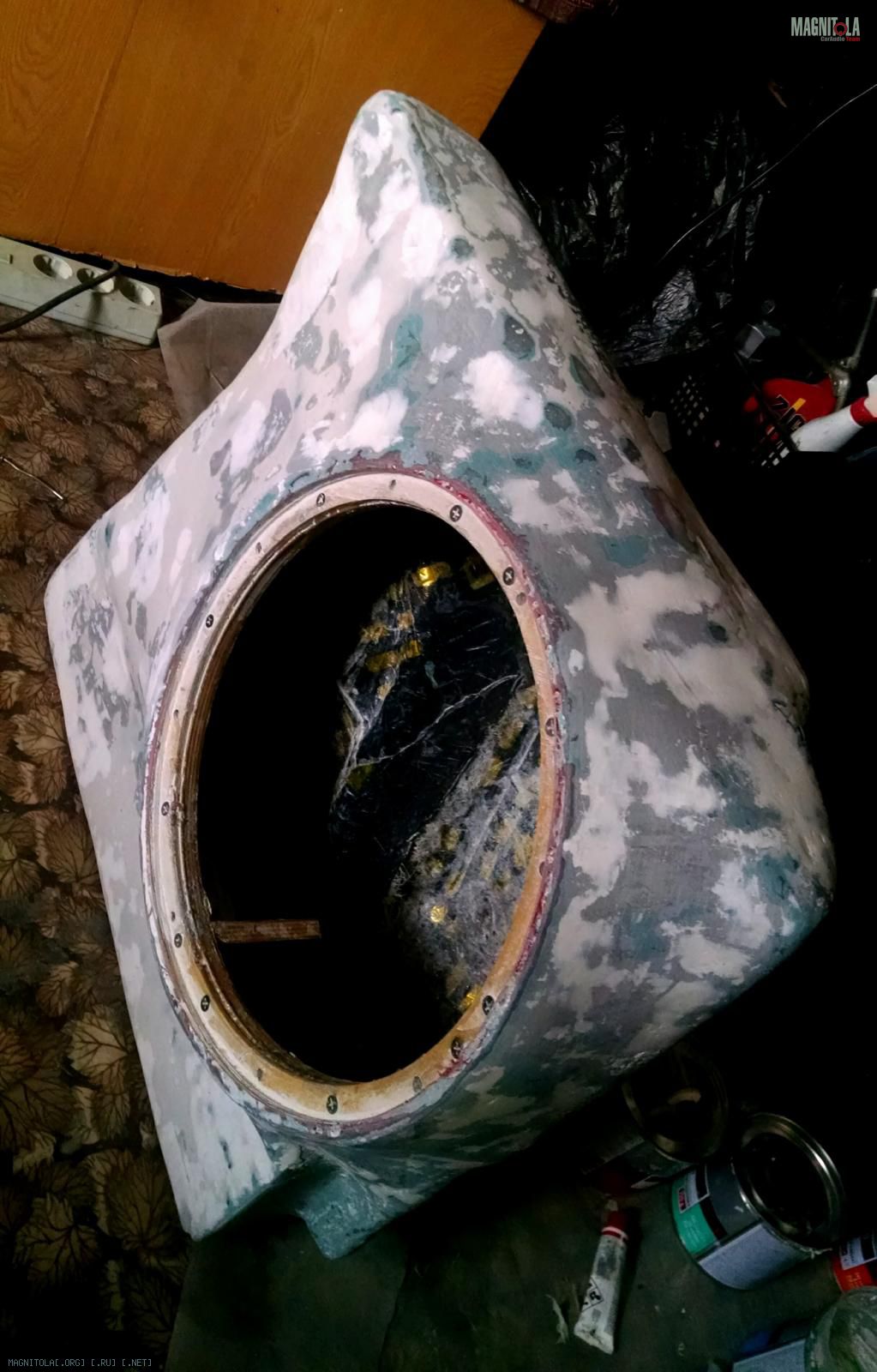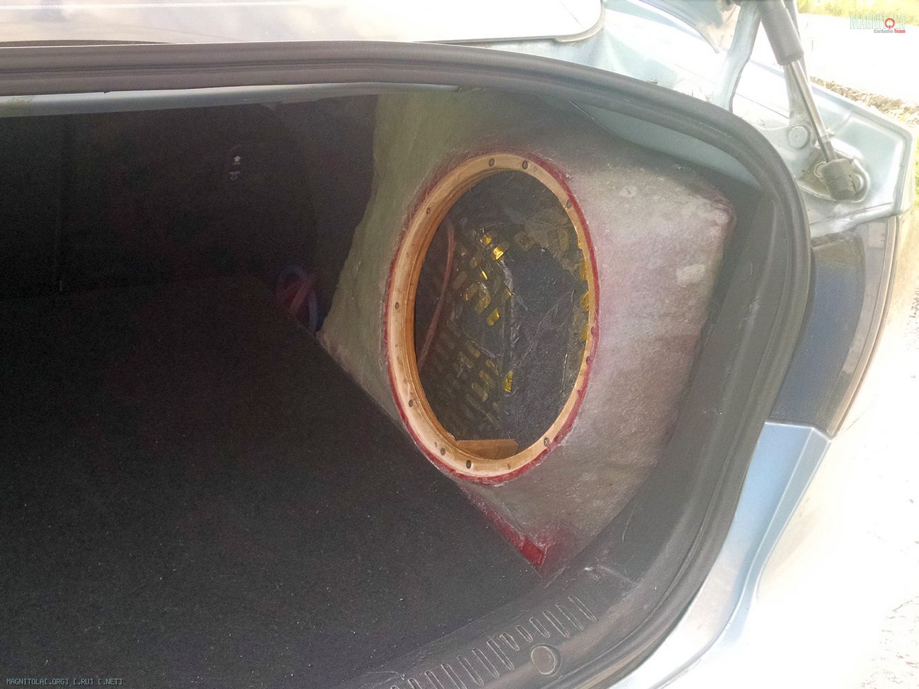 задняя стенка около сантиметра стеклоткани + вибра, форма стенки - два полу-цилиндра, что в итоге дает приличную жесткость конструкции. На фото края короба тоньше чем задняя часть, т.к. там была вклеена передняя стенка из мдф, все это я дополнительно усилю, когда буду делать переднюю часть. Саб как и прошлый будет фиксироваться гайкой к шпильке, установленной в правой нише багажника.