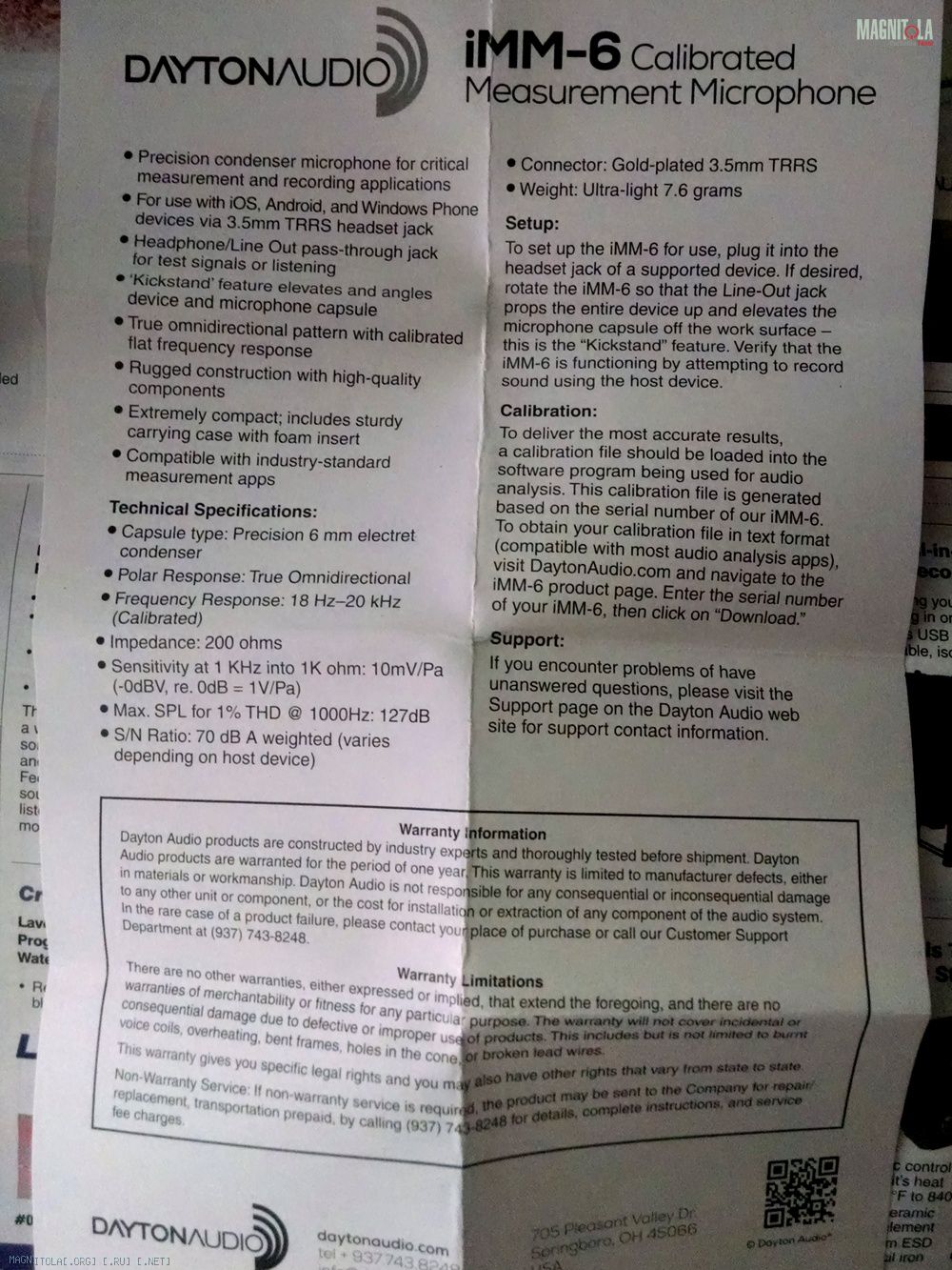 Вчера дела с сабом пришлось отложить - получил заветную посылку из USA с измерительным микрофоном Dayton Audio iMM6. Особенность микрофона - его заводская калибровка (калибровочный файл можно скачать с их сайта по серийному номеру). Микрофон предназначен для снятия АЧХ в связке со смартфоном на iOS и Android, но никто не запрещает подключить его к ноутбуку через переходник.