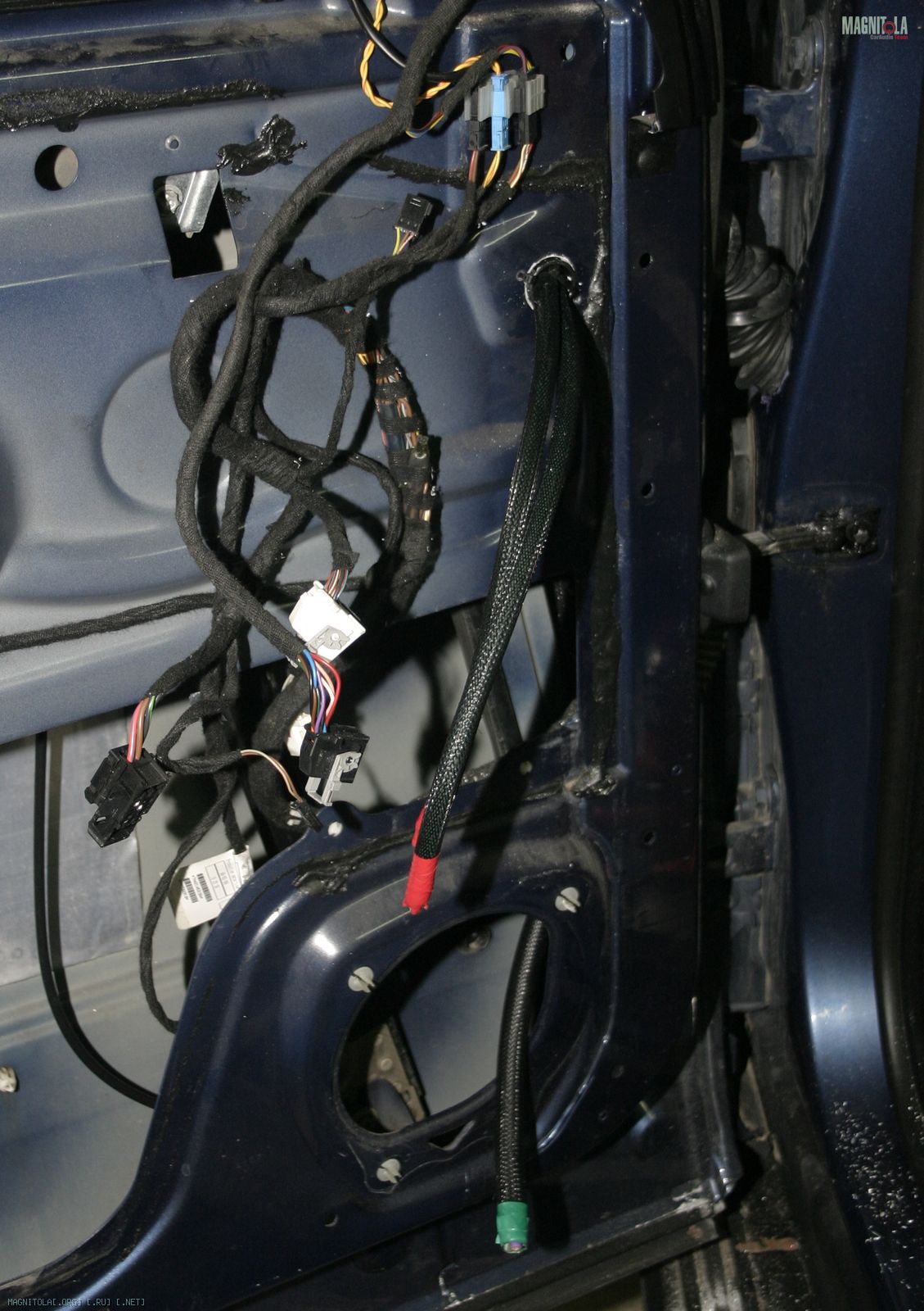 Принято решение сделать отдельный тоннель для этой цели. Просверливаем отверстия в кузове и дверях с внедрением новых резиновых патрубков.
