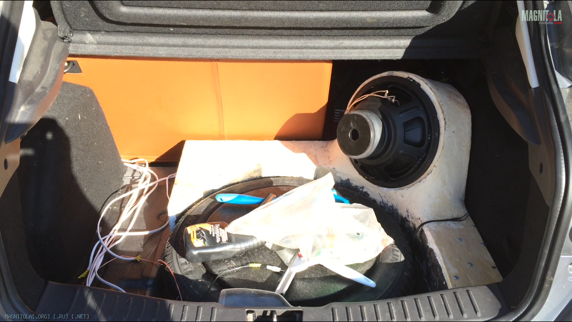 Коробом под саб послужило штатная ниша для всякой мелочевки, туда все равно ничего не помещается. Объем примерно 28 литров.