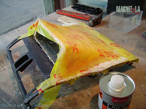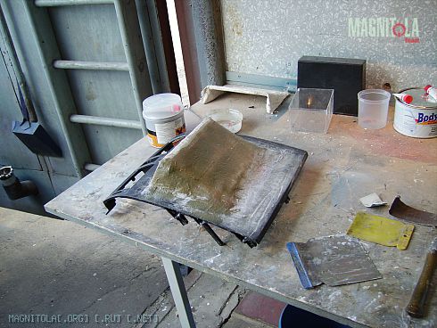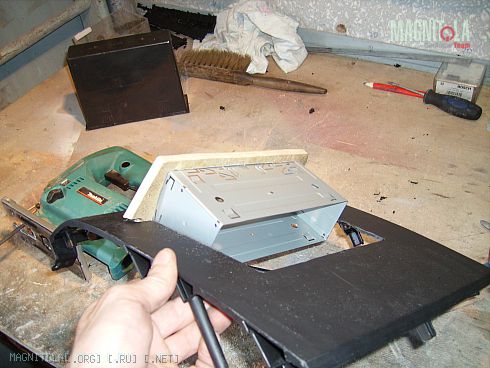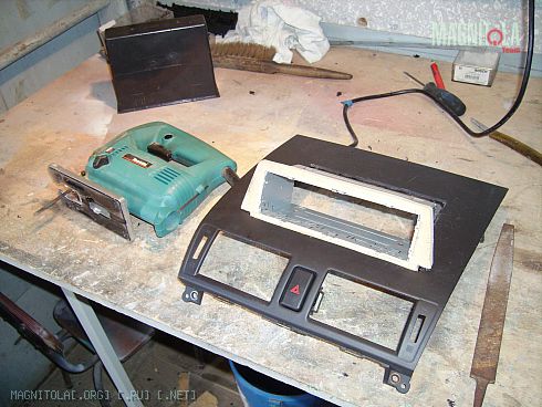 вчера начали с изготовления рамки под ДВД (делали при помощи набора для ремонта бамперов с полиэфирной смолой+ фанера+чуть стеклоткани, к набору прилагается стекломат, и шпатлёвки, волосянки и финишной), сегодня решили опробовать в сыром варианте... сделал сегодня проводку, пока шпатлёвка сохла, и вот что получилось...