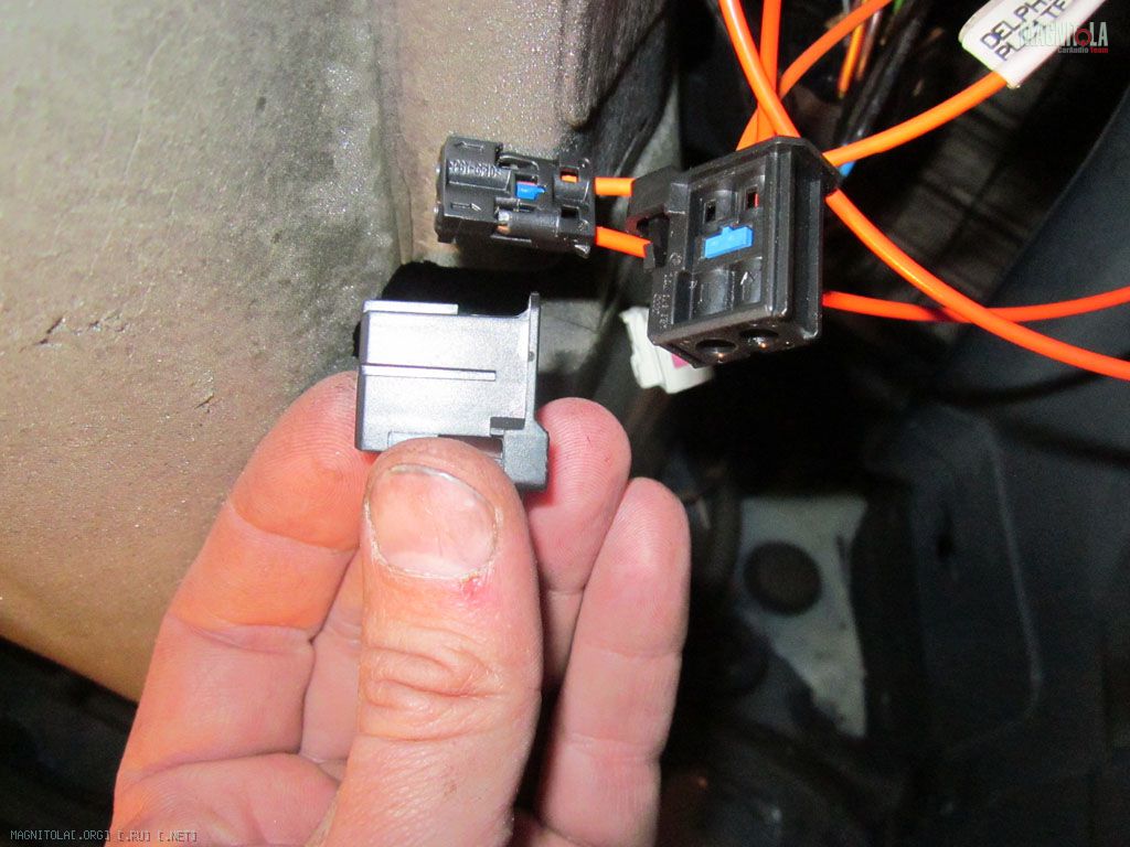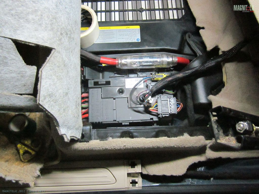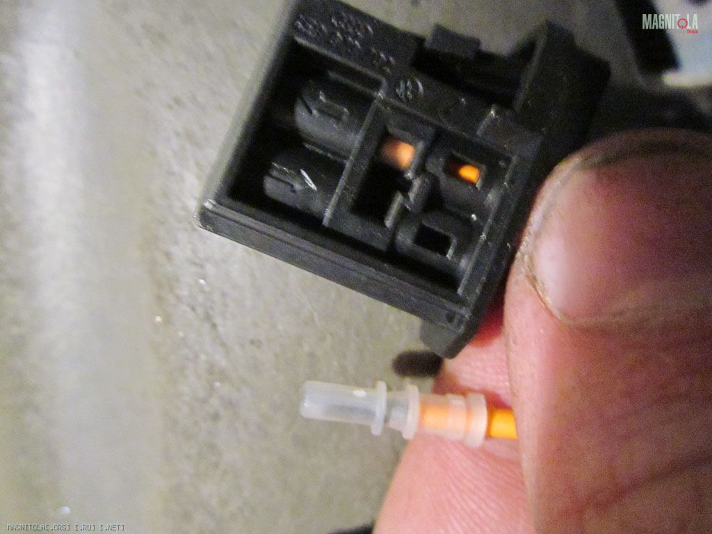 Воткнул триомовский адаптер. Тут кстати была одна из непредвиденных ситуаций во время инсталла. Все воткнул, все как положено. Штатная магнитола не работает. Не работает и все тут. Включается и через несколько секунд выключается. Какие танцы с бубном я выписывал вокруг этого адаптера – чума просто. Дело происходило в ночи, даже спросить не у кого (хотя блин я вроде не первый раз такой подключаю). Короче совершенно случайно заметил что на комплектном триомовском разъеме MOST оптическая нитка наоборот была вставлена. Времени потерял пипец сколько. Надежно закрепил это чудо на арке саморезом в штатную (нафига она там) дырку, закатал багажник по возможности виброй и уклеил комфортом.