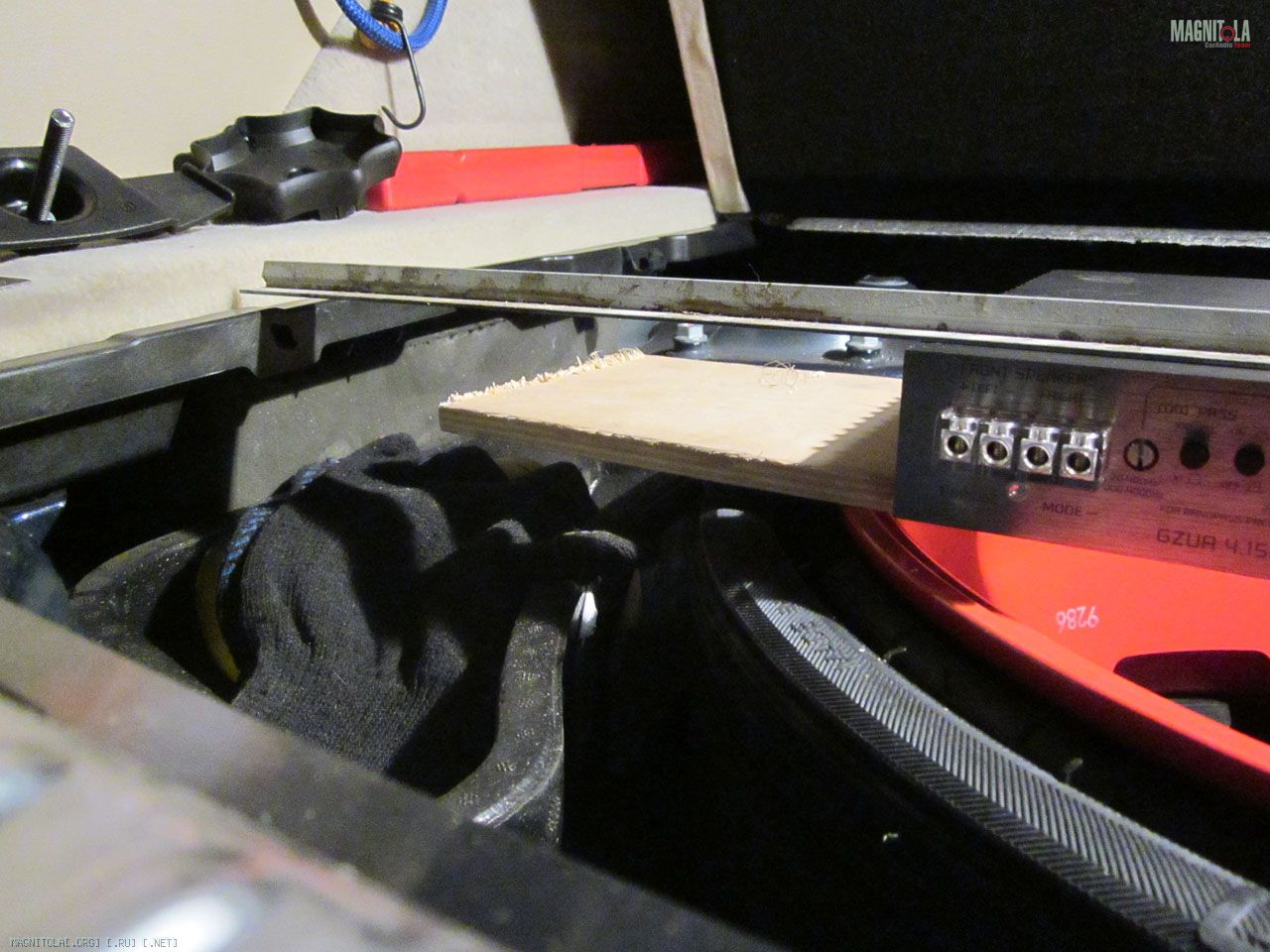 Плавно переместился в багажник. В интернет видел много инсталлов в туареге, где усилители кладут рядом с нишей запаски чуть ли не на металл кузова. Для меня это не вариант точно. Мне хотелось убрать с глаз долой усилители в крыло, но ТЗ по инсталлу звучало примерно так «хочу чтобы усилители было видно» )) И стал я прикидывать единственный вариант – второй фальшпол.