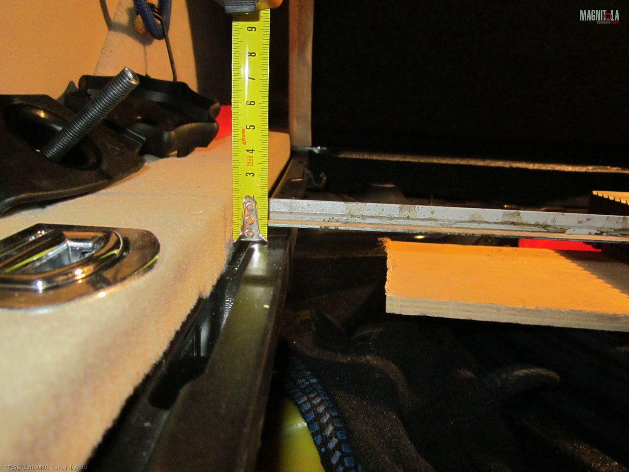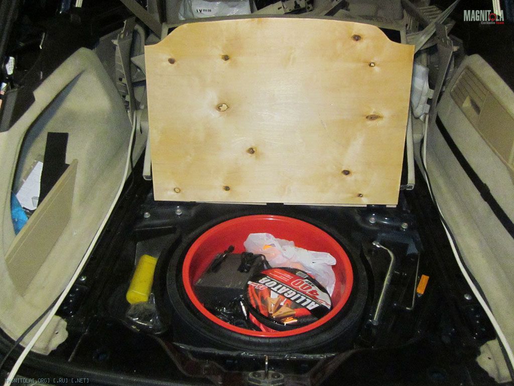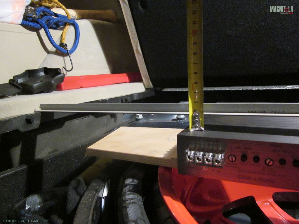 В смысле положил усилитель на фанерку, фанерку на запаску и померил высоту – вдруг получится. Мда, не влазит….