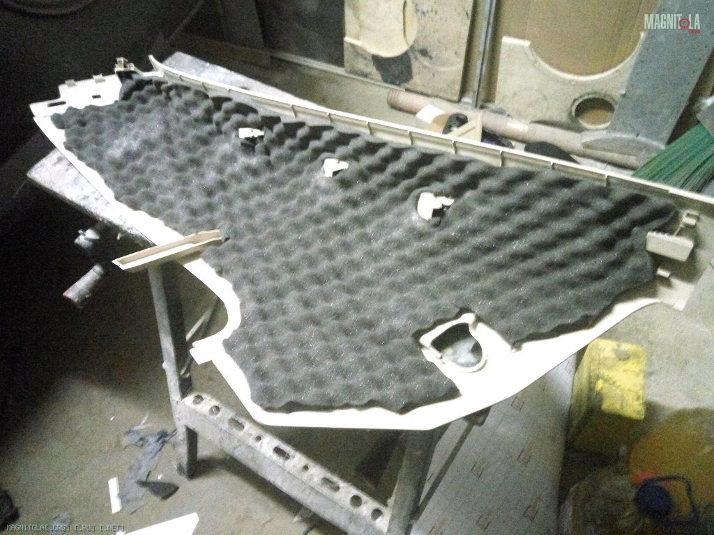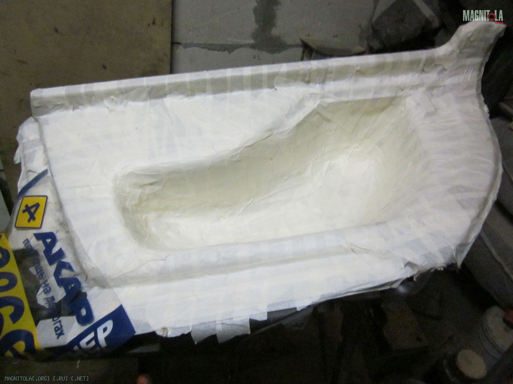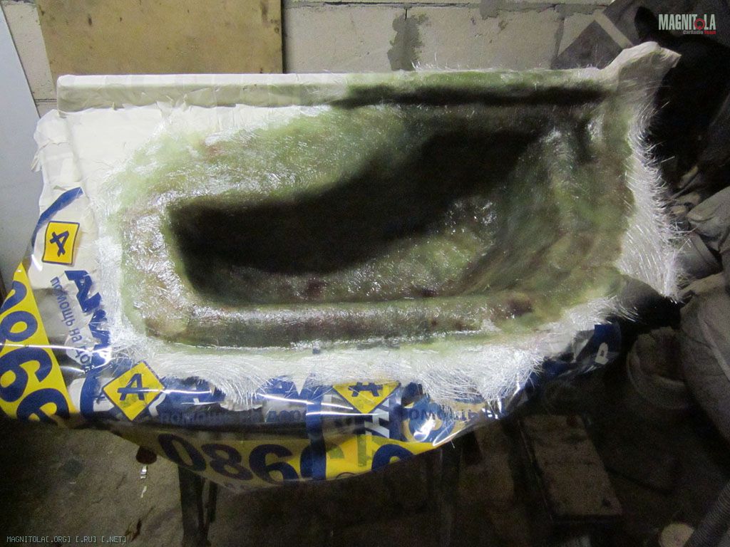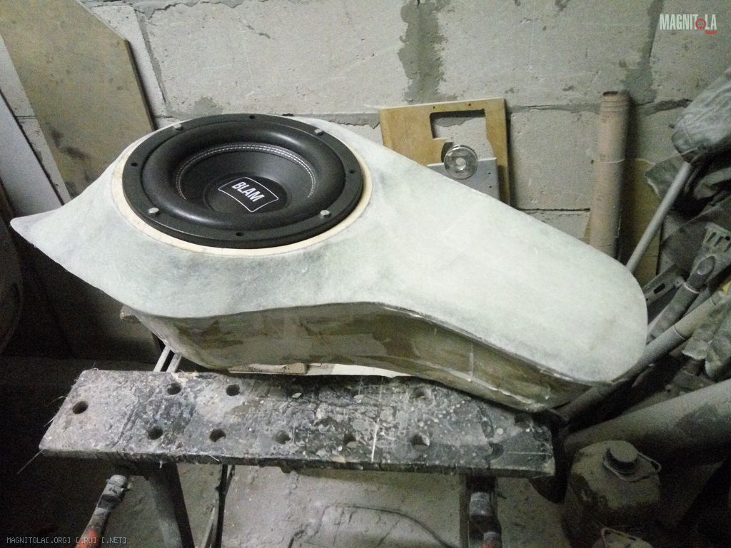 И занялся сабвуфером. К сожалению пришлось его делать «как у всех». Думал про фронтальный саб – не, не вариант, как ни странно. Вощем взял это я боковину, залепил скотчем и начал ваять. Форму лепил 300м стекломатом, толщину набирал 450м.